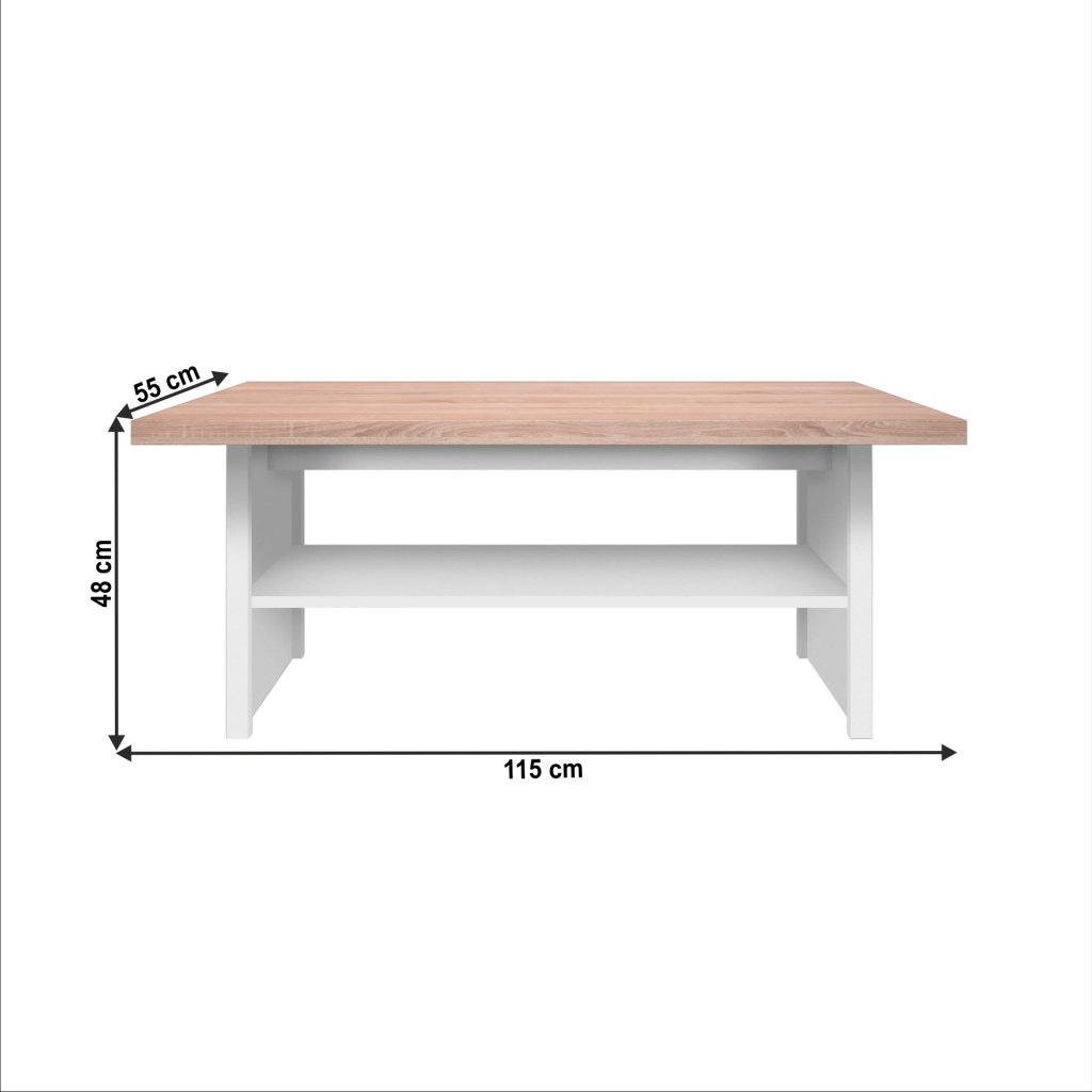 Konferenčný stolík v bielej farbe s dekorom dub sonoma je ideálny do obývačky. Rozmery 115x55x48 cm a kvalitný laminovaný materiál zaručujú praktickosť a moderný vzhľad. Dodávané v demonte.
