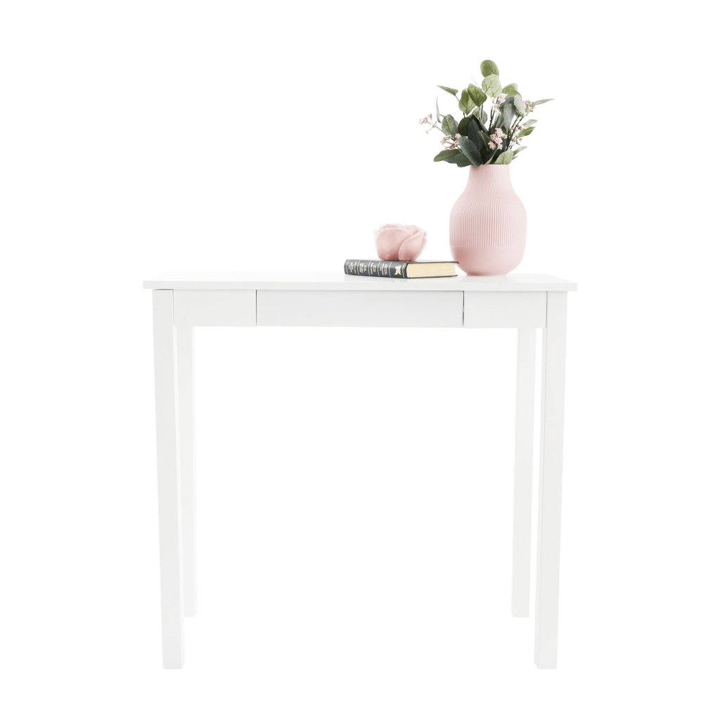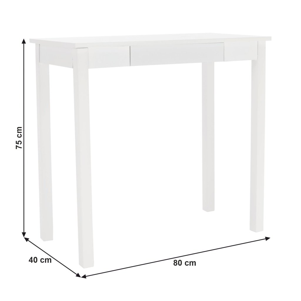 Biely konzolový stolík s rozmermi 80x40x75 cm je vyrobený z MDF s hrúbkou 15 mm. Obsahuje praktický šuplík a unesie až 20 kg. Dodáva sa v demonte, ideálny do každého interiéru.