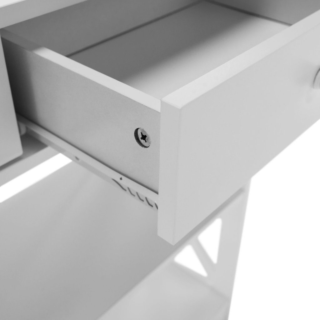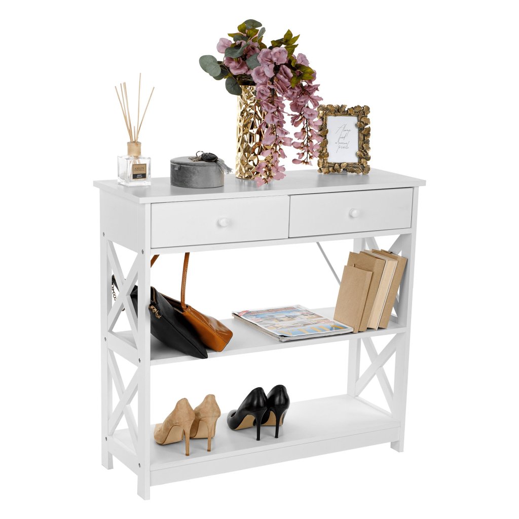 Tento konzolový stolík je vyrobený z kvalitnej lakovanej MDF, čo zabezpečuje jeho odolnosť a dlhú životnosť. S dvomi zásuvkami a dvomi policami poskytuje dostatok miesta na uskladnenie drobností, kníh či dekorácií, a tým vám pomôže udržať poriadok vo vašom domove.