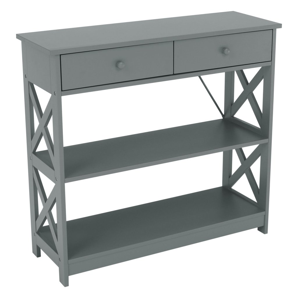 Sivý konzolový stolík LOMIR z lakovanej MDF je praktickým doplnkom do každej miestnosti. S rozmermi 86,6x30x80 cm ponúka 2 zásuvky a 2 police, pričom nosnosť dosahuje 35 kg. Dodávané v demonte.