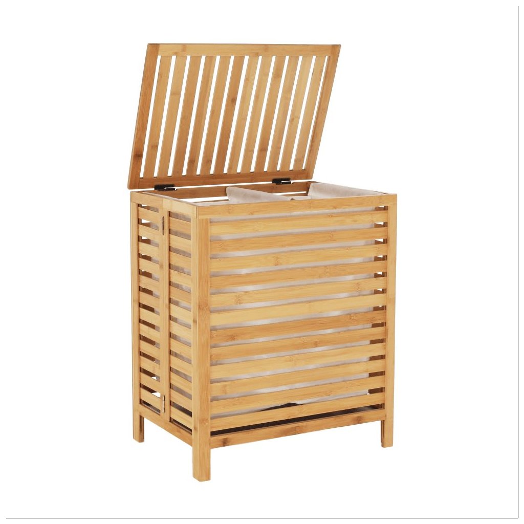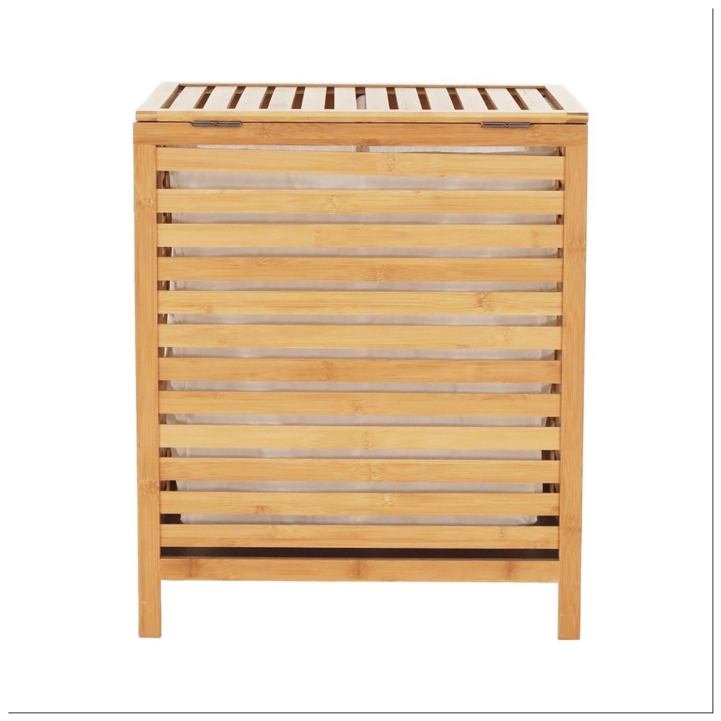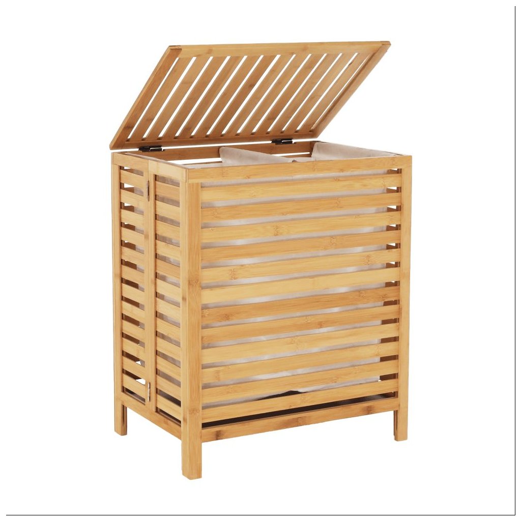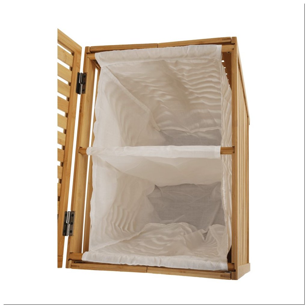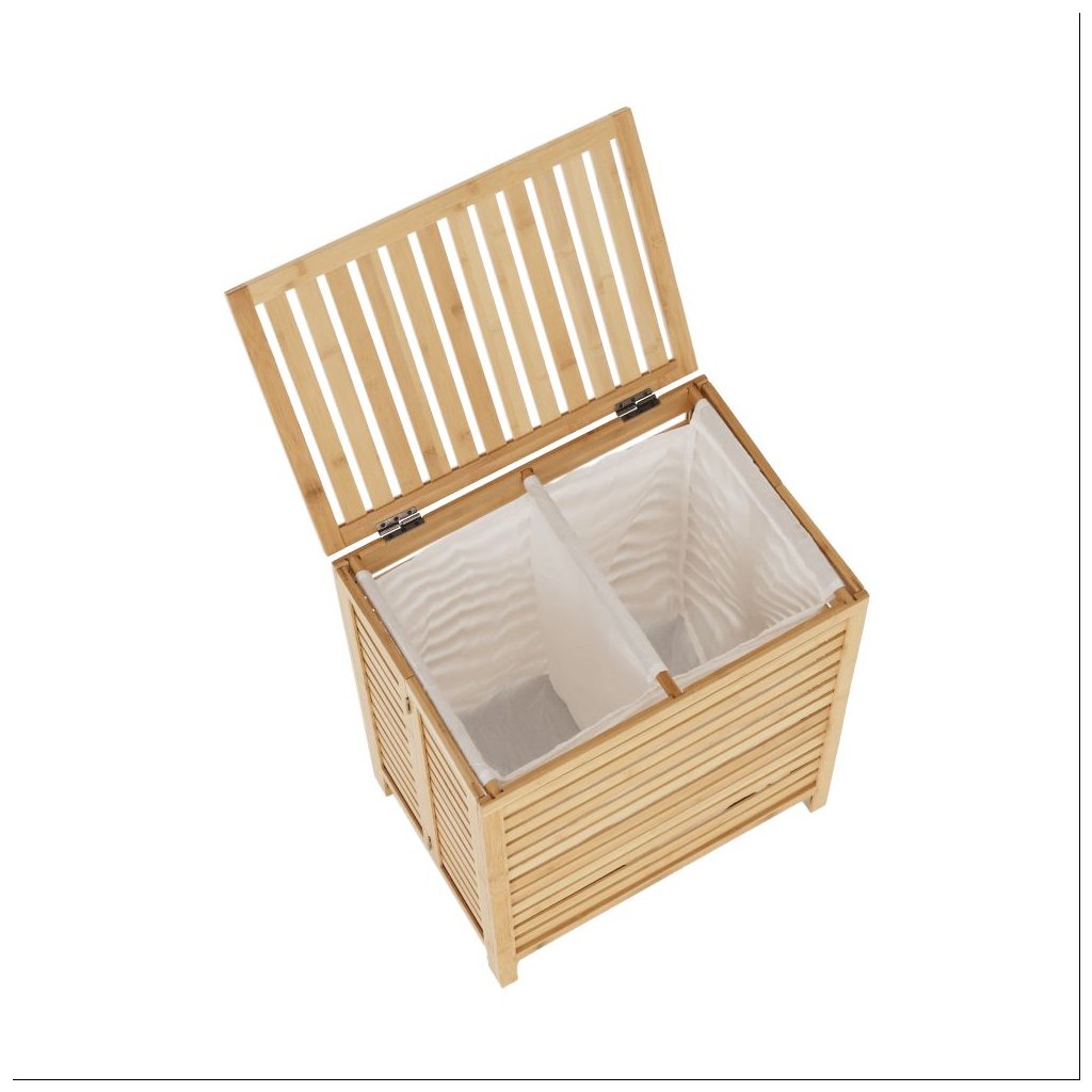 Kôš na bielizeň MENORK kombinuje bambus a bielu látku. S objemom 105 litrov a rozmermi 50x35x60 cm ponúka praktický a odvetrávaný úložný priestor rozdelený na dve časti. Vyberateľné vrece je prateľné.