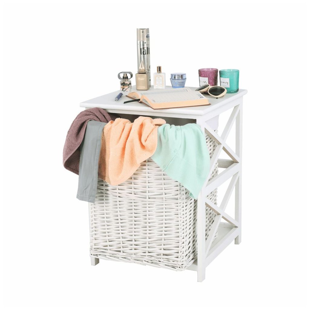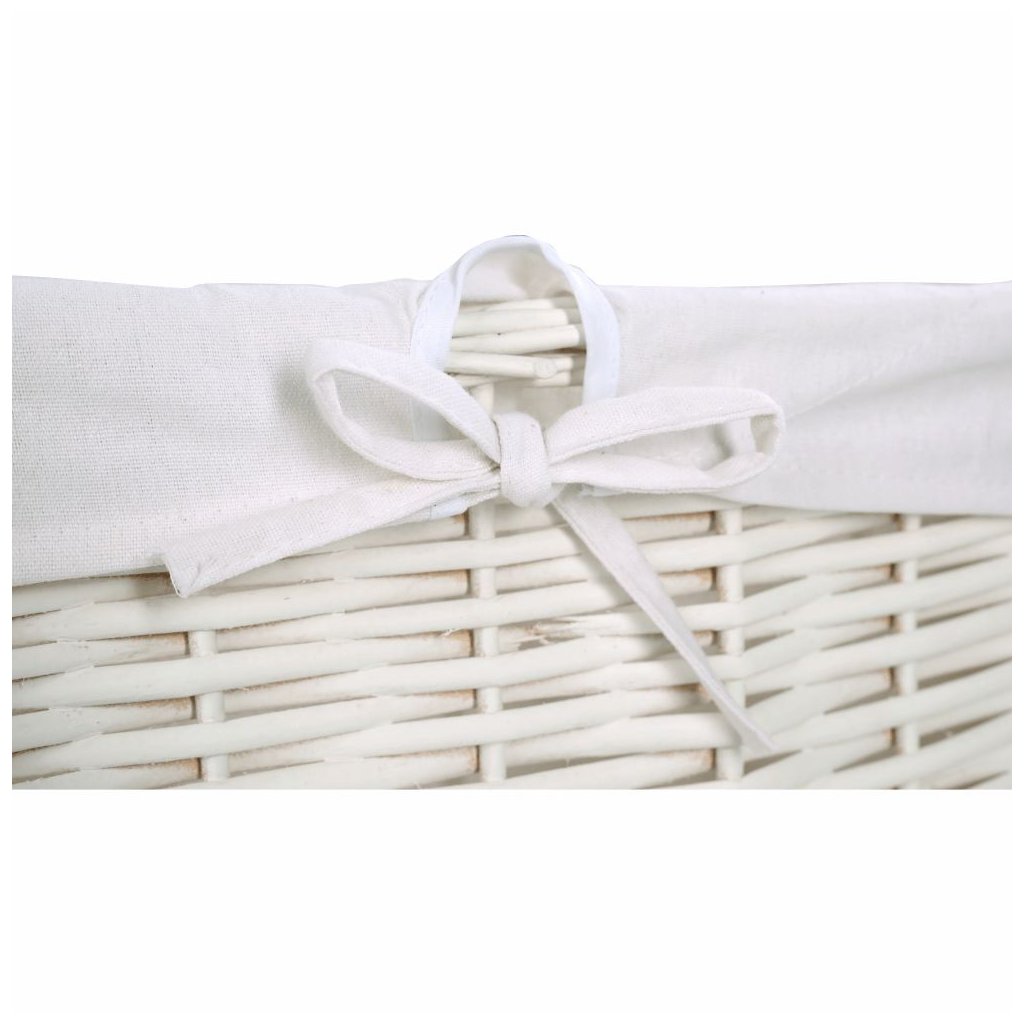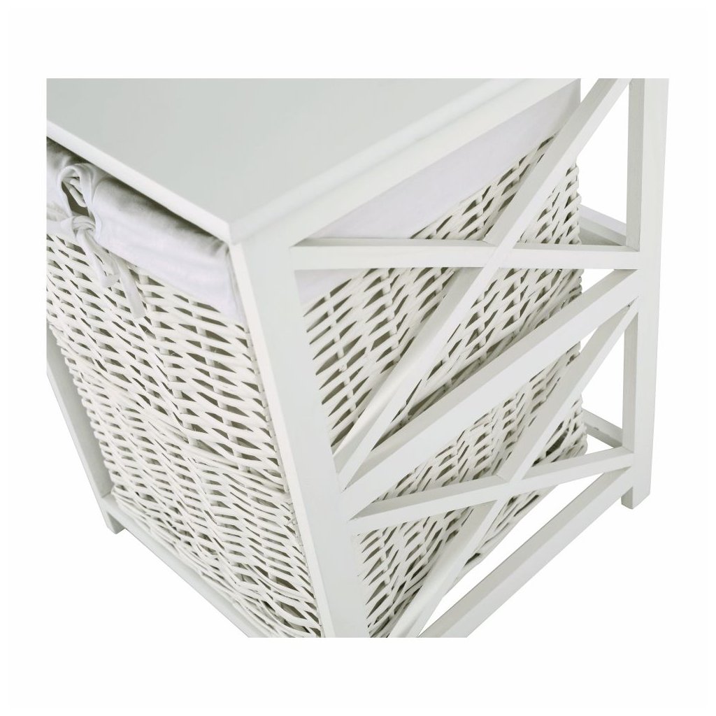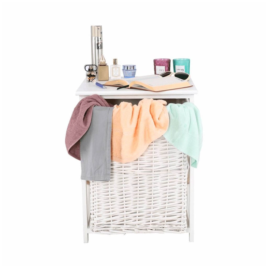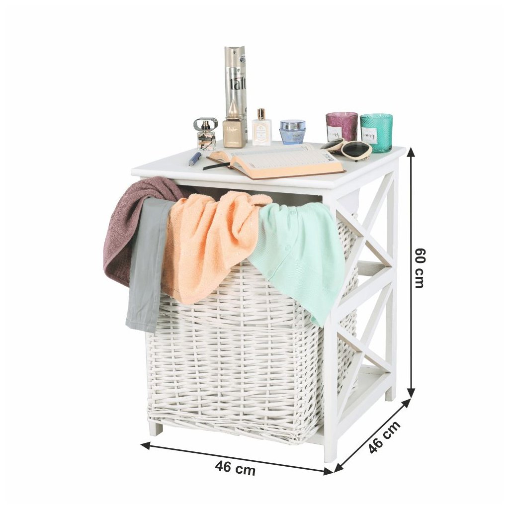 Biely kôš na bielizeň RAFAELLO z prútia, dreva a látky. Rozmery 46x46x60 cm. Praktický a štýlový doplnok do vašej domácnosti, dodávaný v monte.