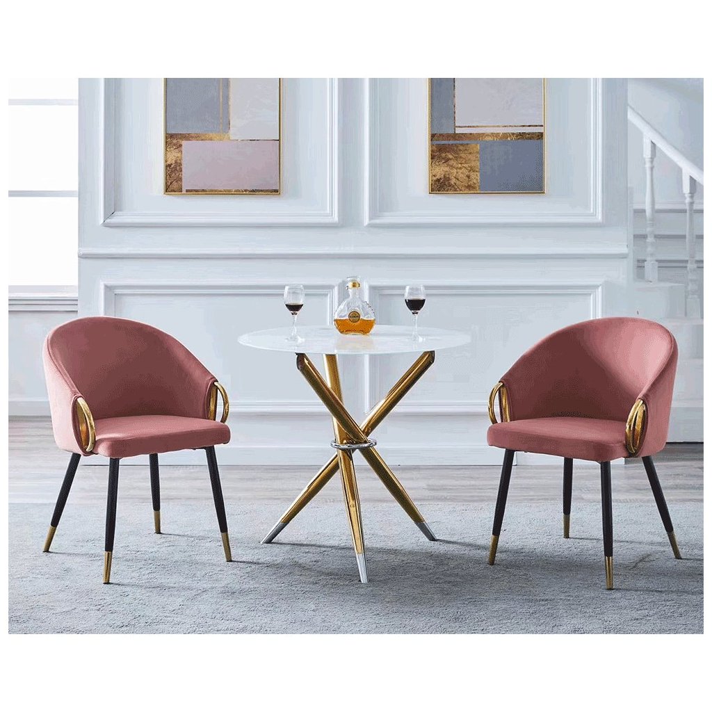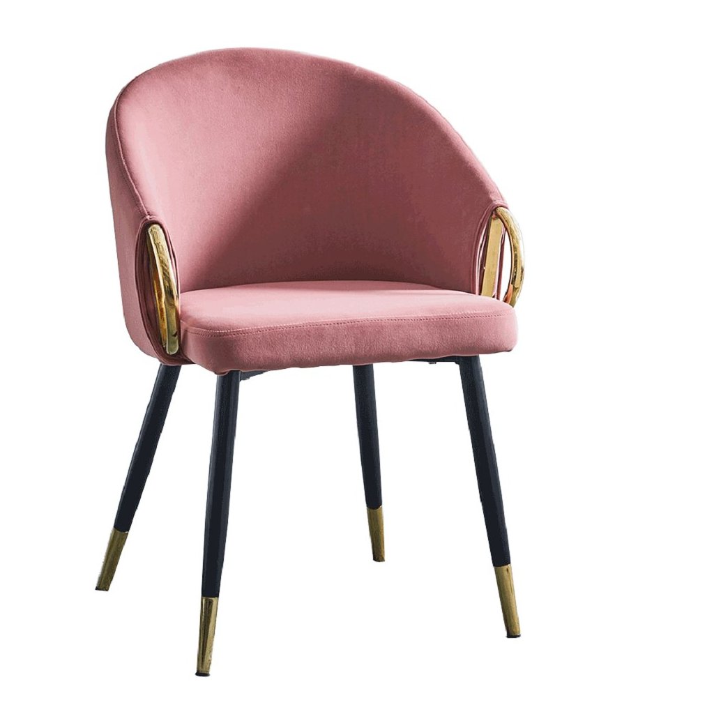 Vyrobené z ružovej zamatovej látky, toto kreslo ponúka nielen estetický zážitok, ale aj vynikajúci komfort. S jeho stabilnými kovovými nohami v čiernej farbe a zlatými chrómovými opierkami na ruky, sa stáva ideálnym doplnkom do vašej kuchyne, jedálne alebo elegantnej kaviarne.