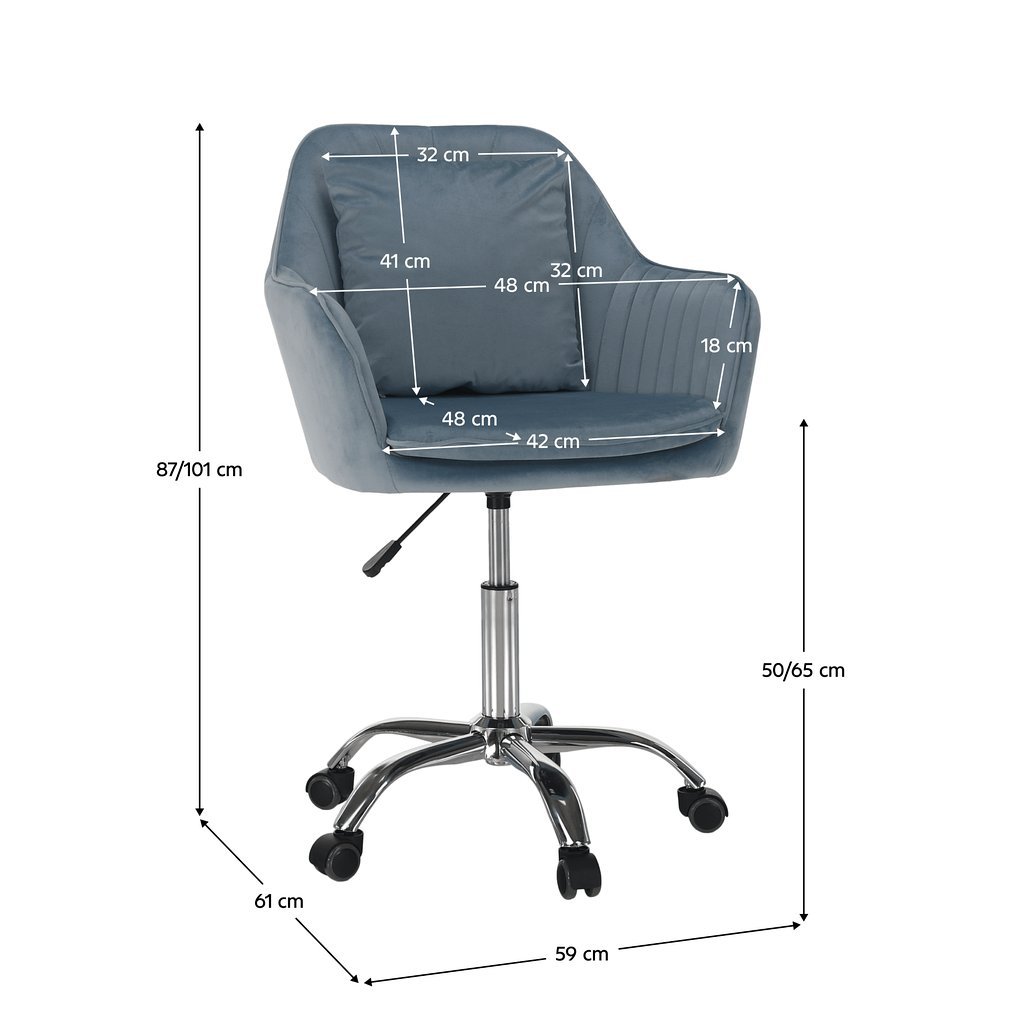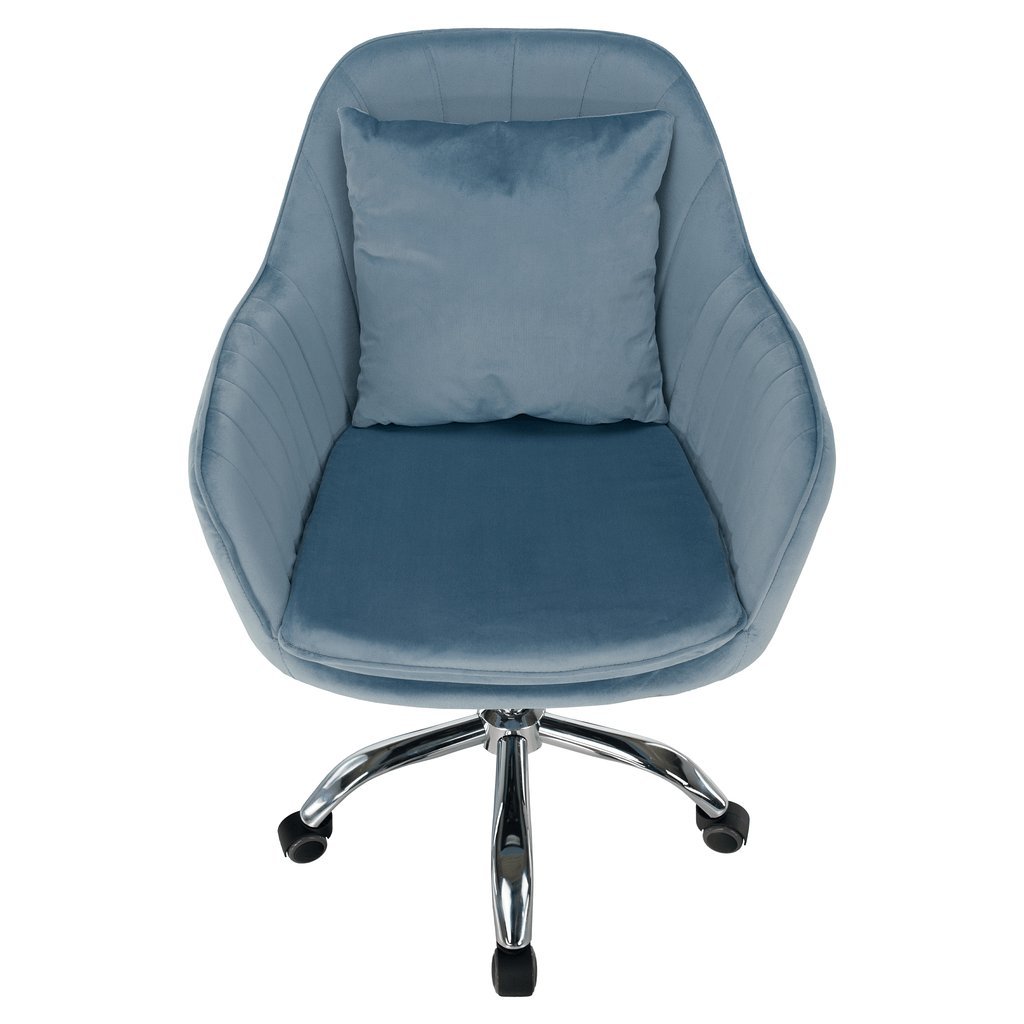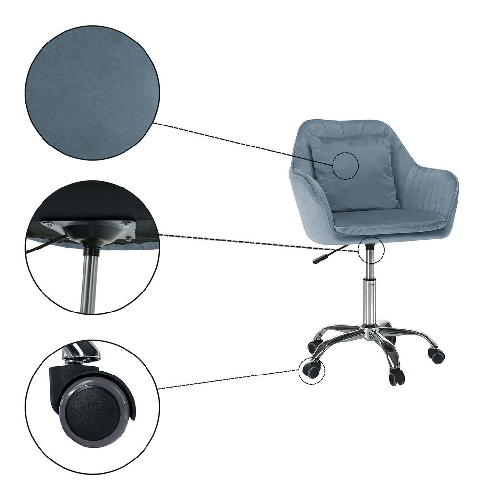 Luxusné kreslo KLIAN v modrej zamatovej látke prinesie do vášho interiéru štýl a pohodlie. S chrómovou podstavou, kolieskami a otáčacím mechanizmom je ideálne do kancelárie aj na relax.