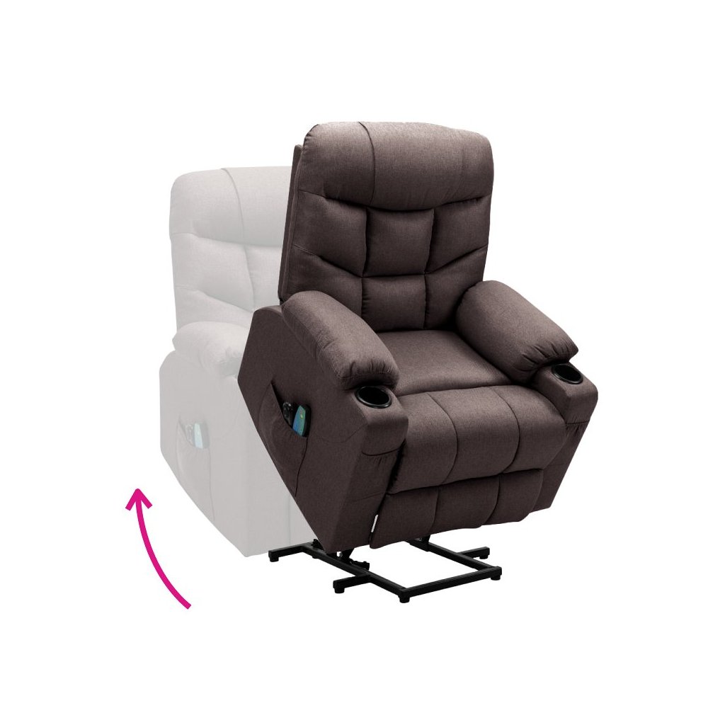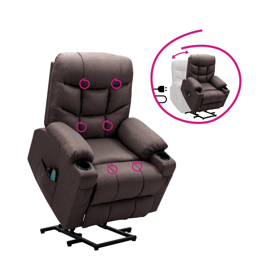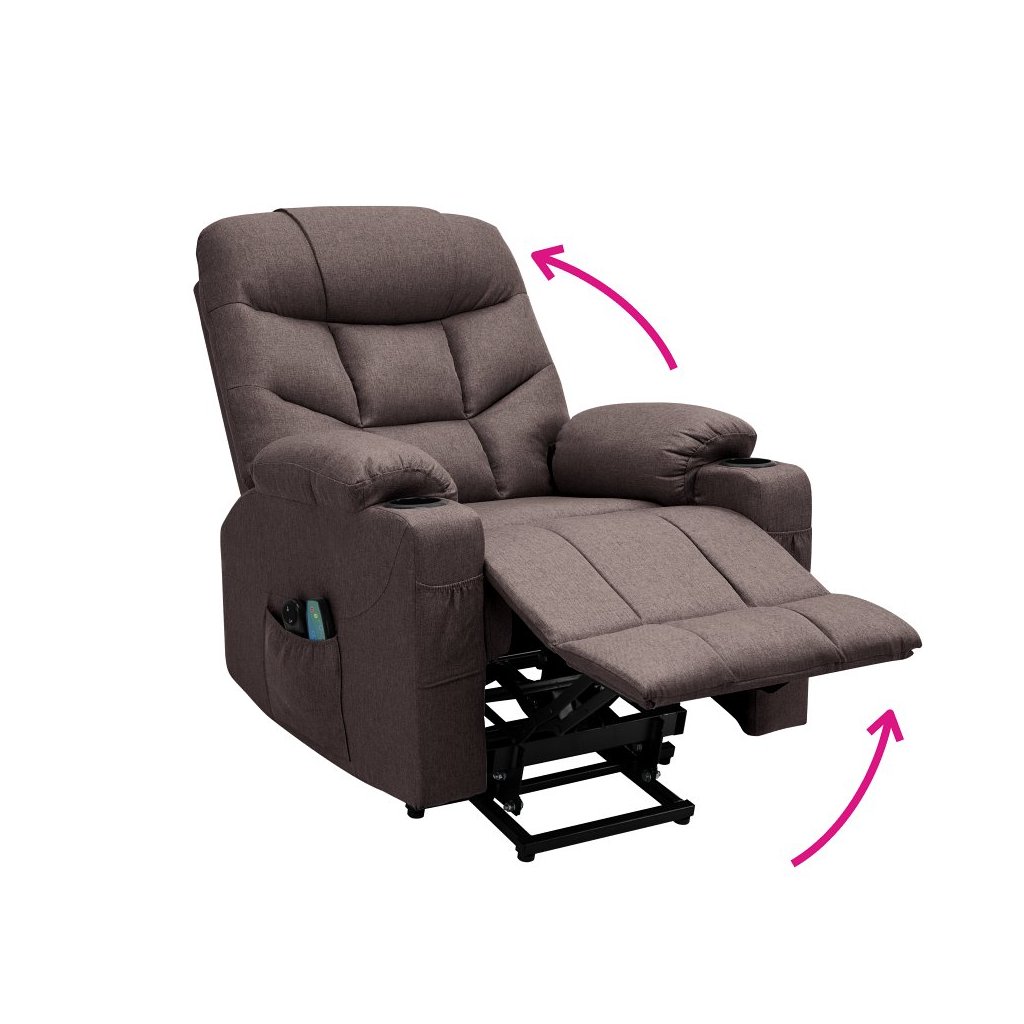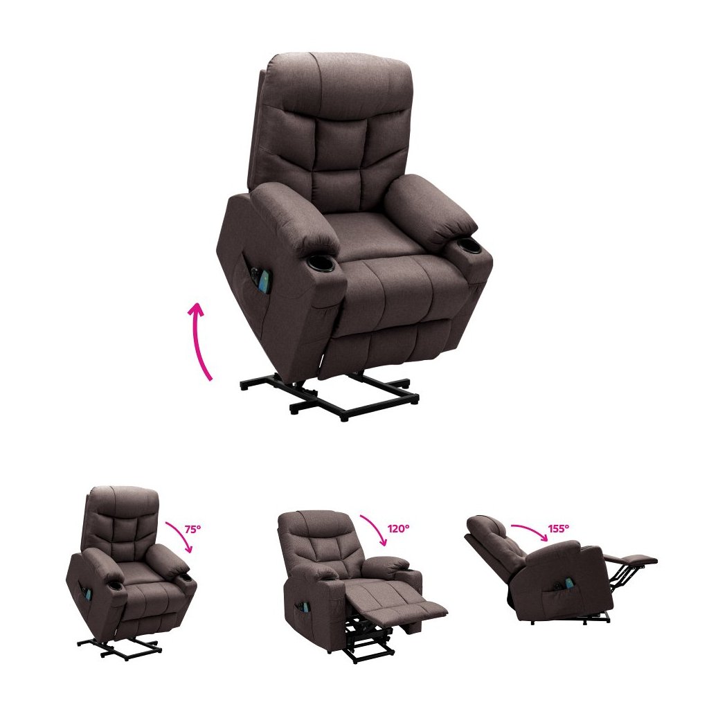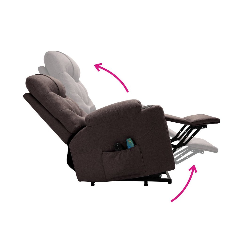 Užite si relaxáciu v polohovateľnom kresle HUDSON v hnedej látke. S elektrickým zdvihom, masážnou funkciou a úložným priestorom vám poskytne maximálny komfort po náročnom dni.