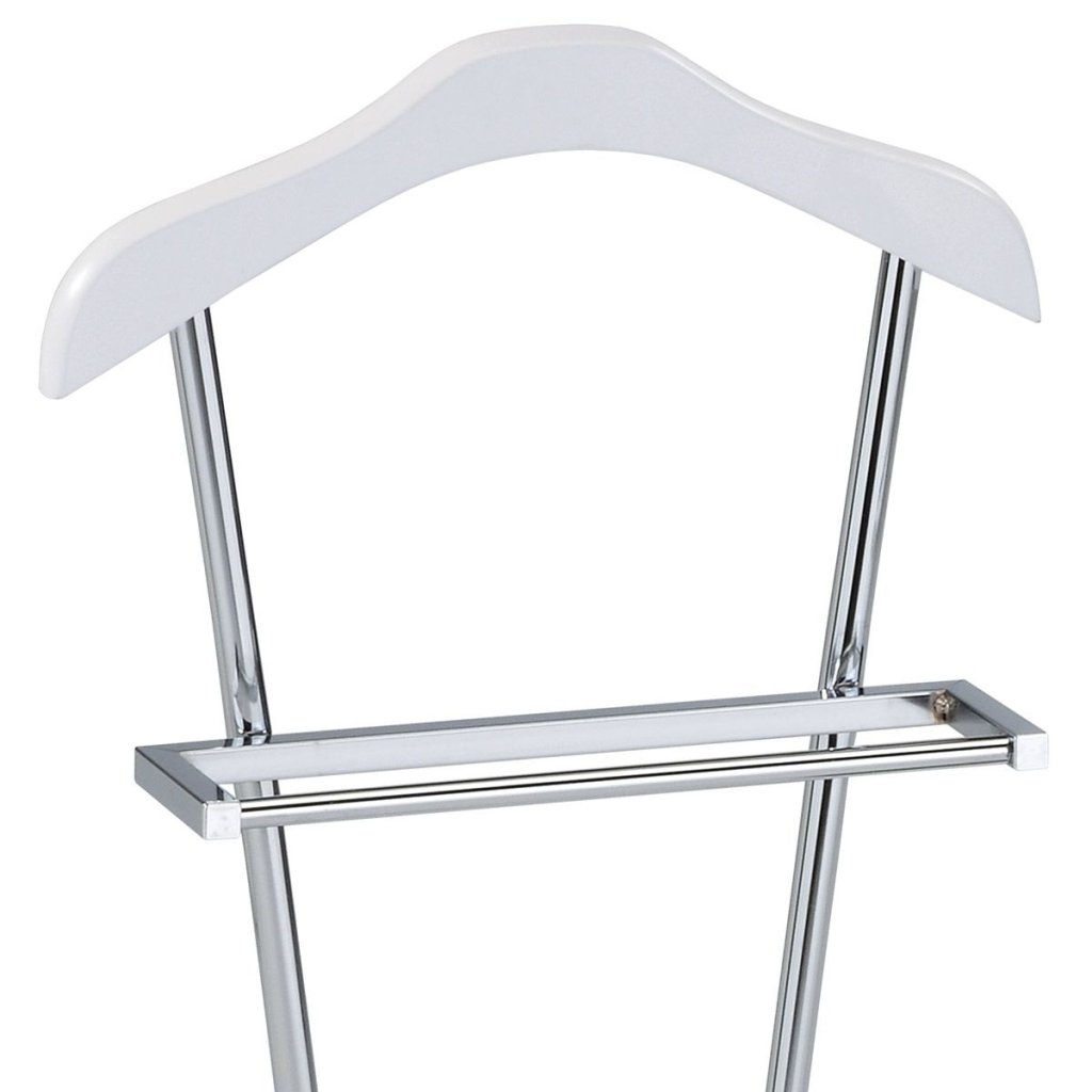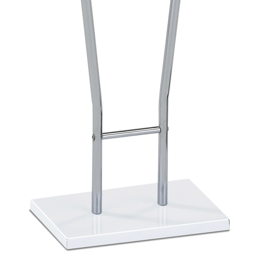 Praktický nemý sluha s moderným dizajnom je ideálnym doplnkom pre každý interiér. Jeho konštrukcia z kombinácie kovových trubiek a masívneho ramena zabezpečuje stabilitu a eleganciu, zatiaľ čo biely matný lak a chrómový povrch dodávajú štýlový vzhľad.