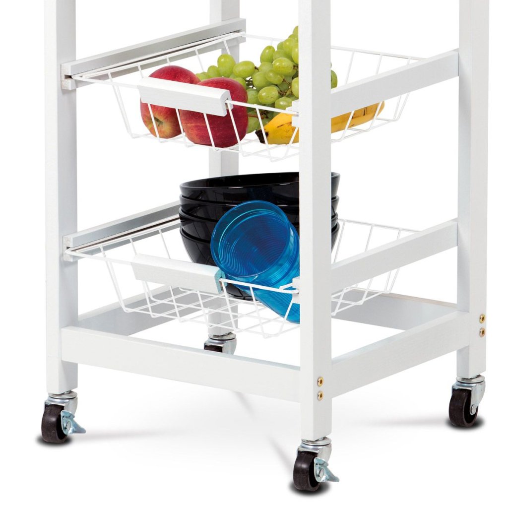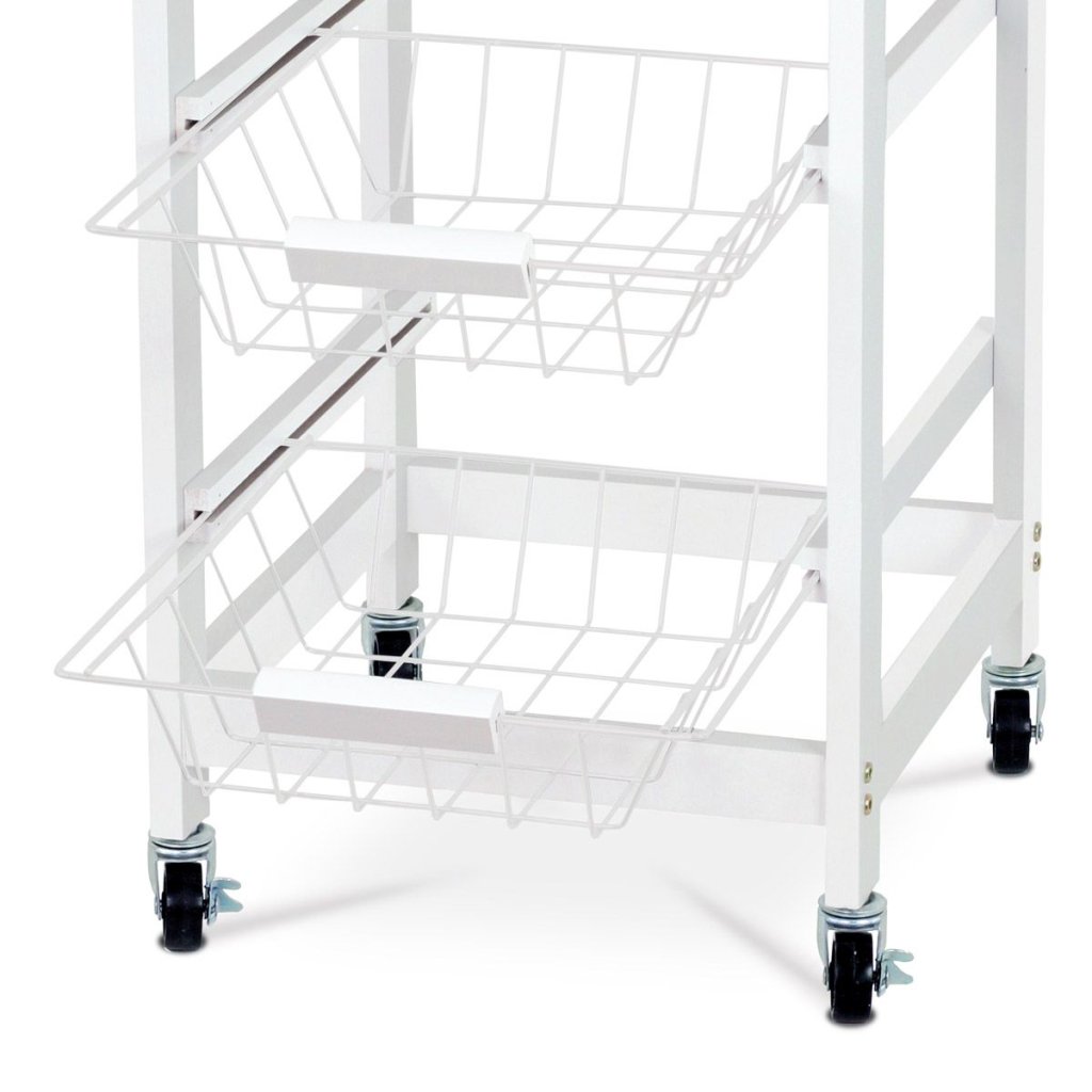 Odkladací stolík v bielej farbe s matným lakom a bambusovou doskou ponúka praktické uskladnenie vďaka trom košom. Štyri pojazdové kolieska zaručujú jednoduchú manipuláciu a stabilitu. Ideálny do kuchy