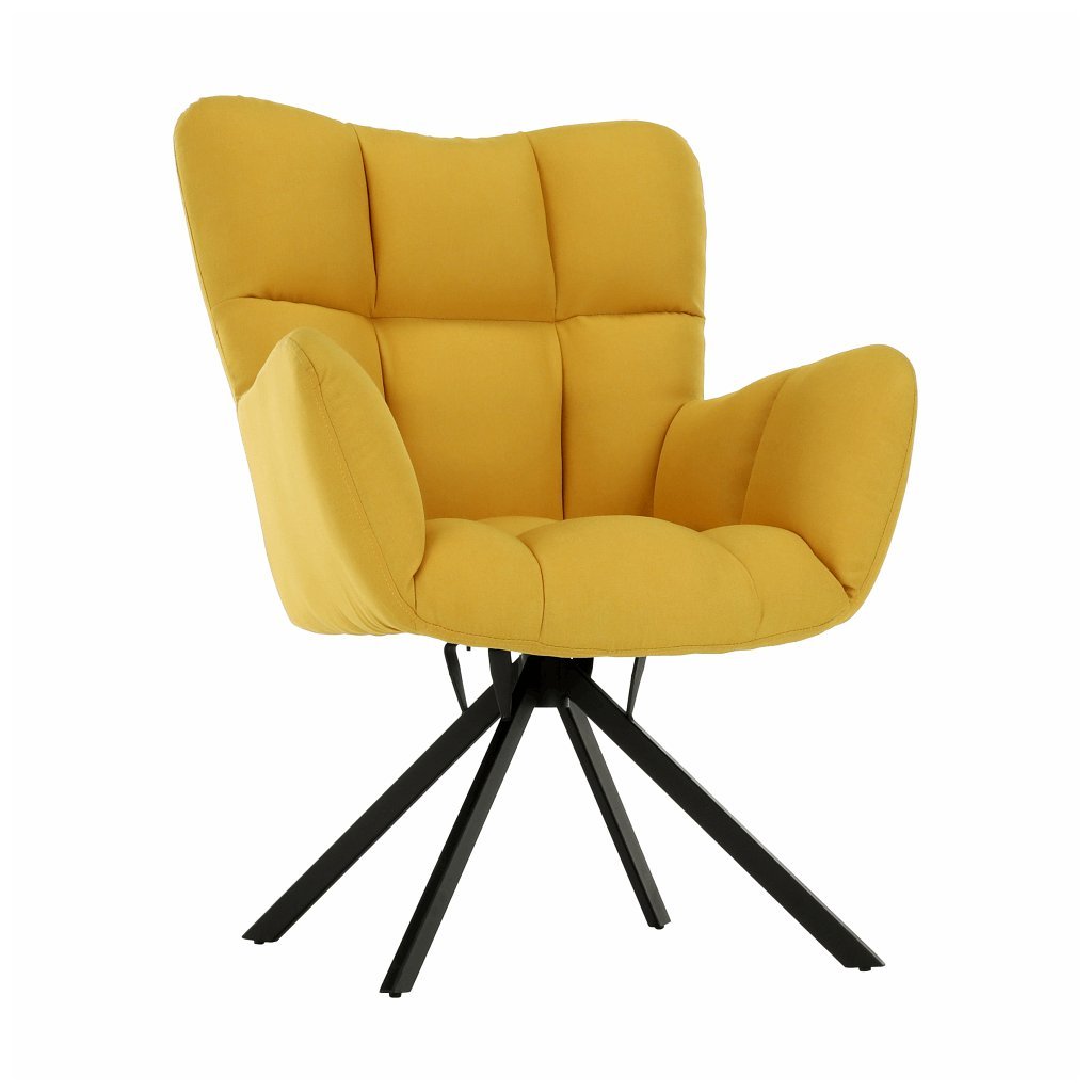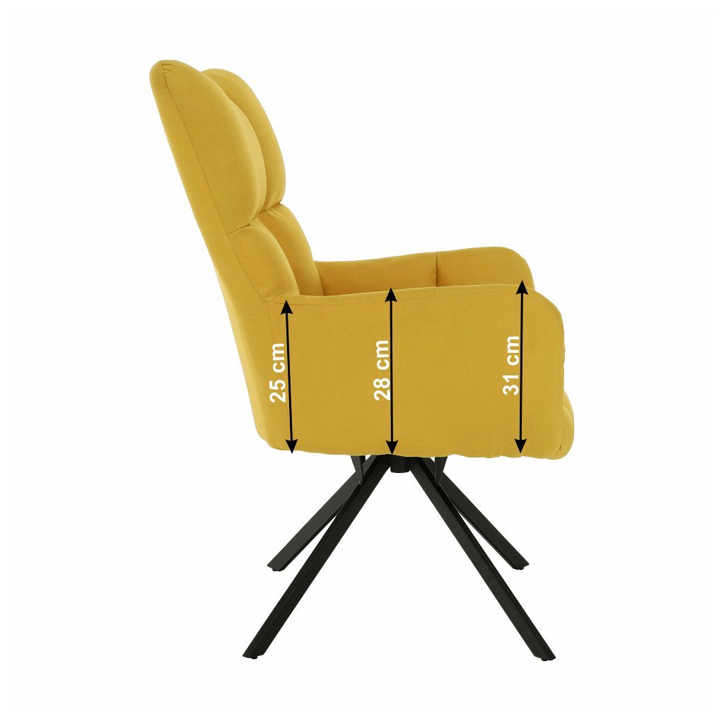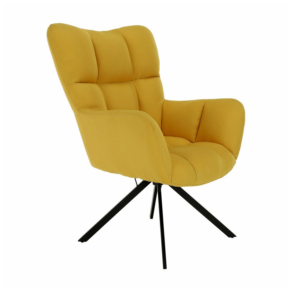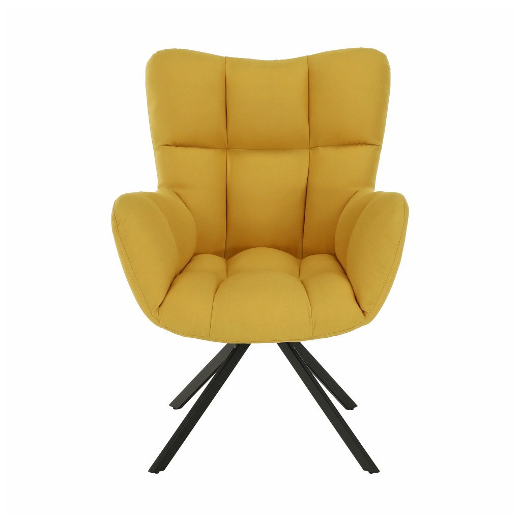 Otočné kreslo KOMODO v žltej látke kombinuje moderný dizajn a pohodlie. Pevné čierne kovové nohy zabezpečujú stabilitu. Rozmery (ŠxHxV): 67x72x97 cm, hmotnosť 11 kg. Dodávané v demonte.
