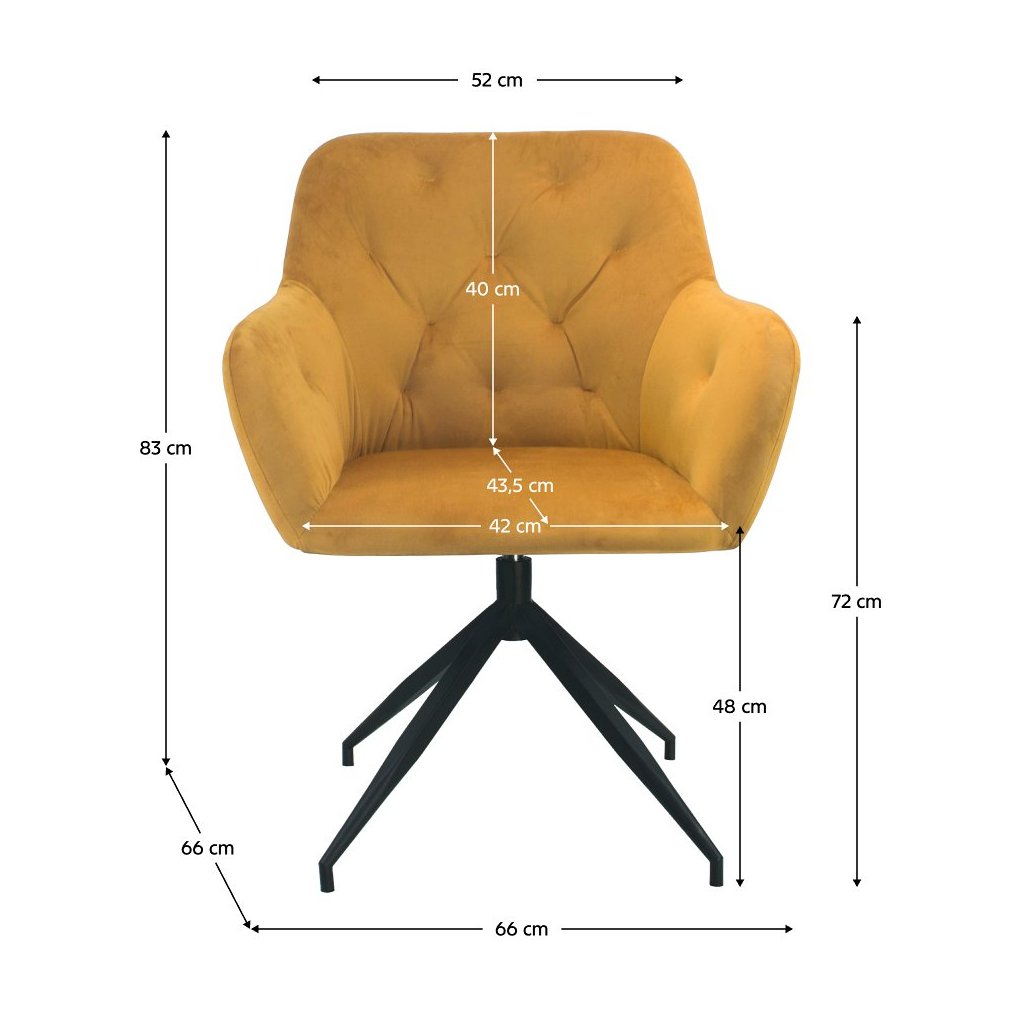 Otočné kreslo VELEZA v žltej zamatovej látke je moderné a pohodlné. Stabilné čierne kovové nohy a prešívané telo s gombíkmi dodajú štýl vašej kancelárii či pracovni. Max. nosnosť 100 kg.