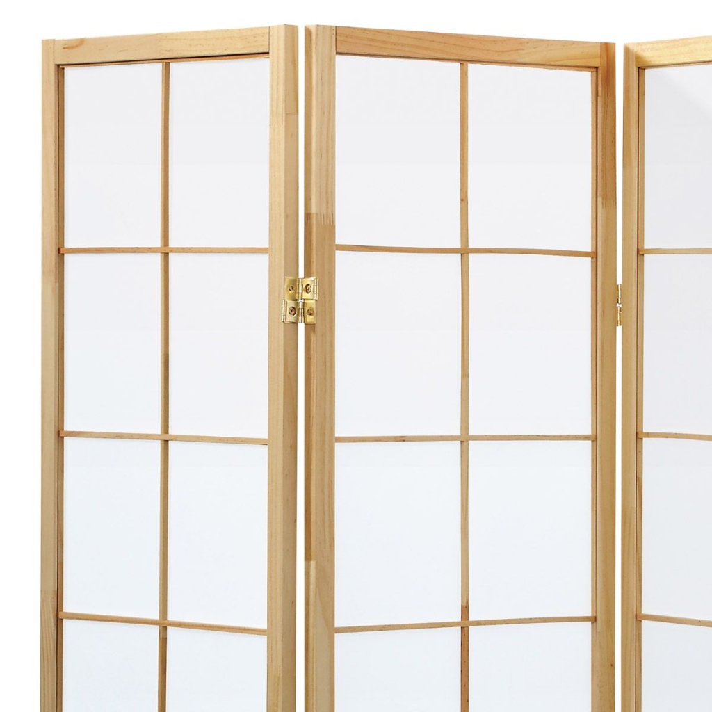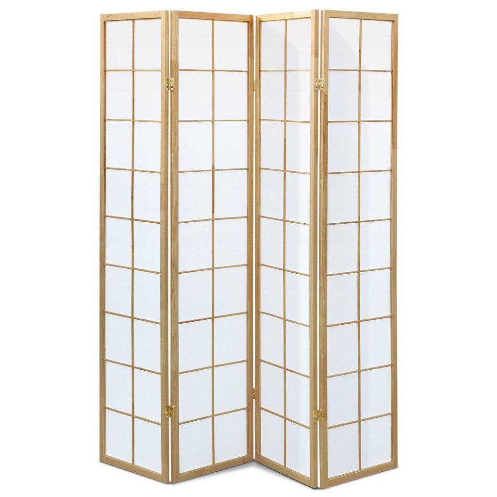 4-dielny voľne stojaci paraván z masívneho smrekového dreva a bielej netkanej textílie. Praktická zástena a optická deliaca priečka pre interiéry aj komerčné priestory. Skladací a ľahký na manipuláciu