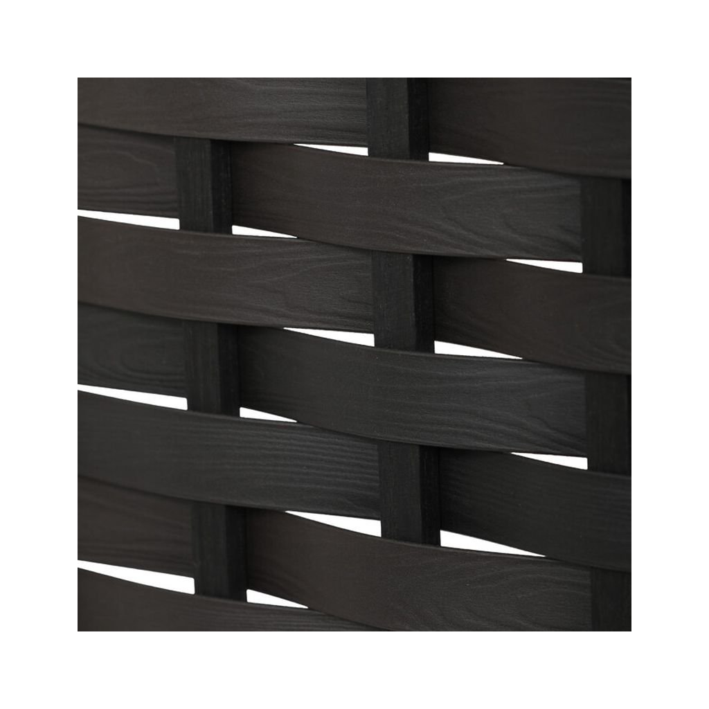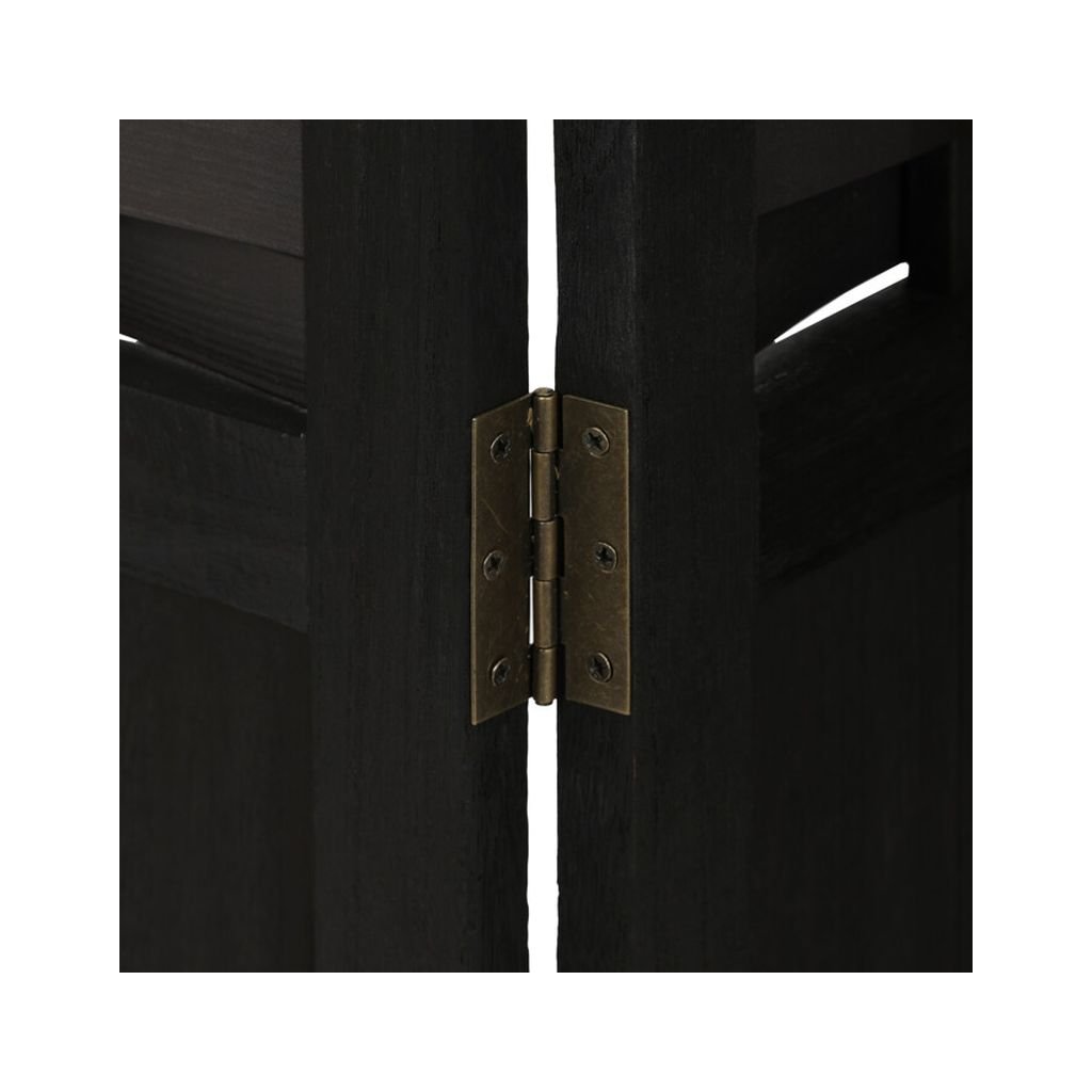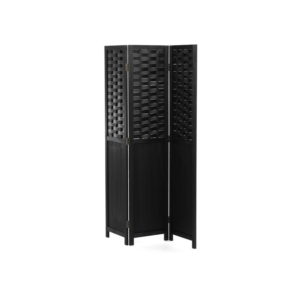 Trojdielny paraván z masívneho smrekového dreva v čiernej farbe efektívne rozdeľuje priestor. Prepletené lamely prepúšťajú svetlo a zabezpečujú súkromie. Pevné pánty umožňujú jednoduché skladanie.
