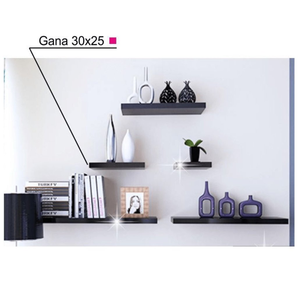 Polica GANA 30 v čiernom lesku je elegantným doplnkom každej steny. Skryté nástenné kovanie zabezpečuje jednoduchú inštaláciu. Rozmery: 30x25x5 cm, nosnosť 5-8 kg.