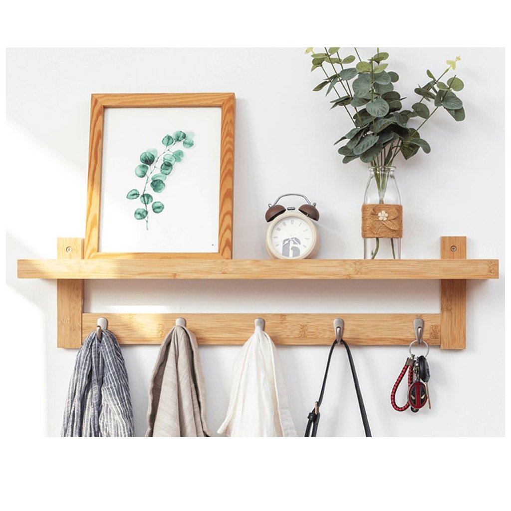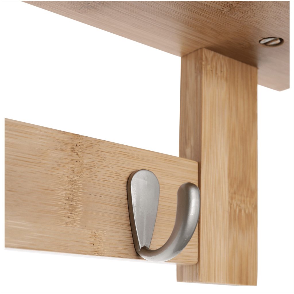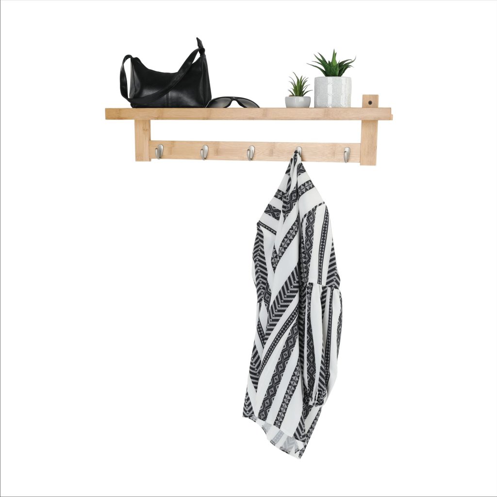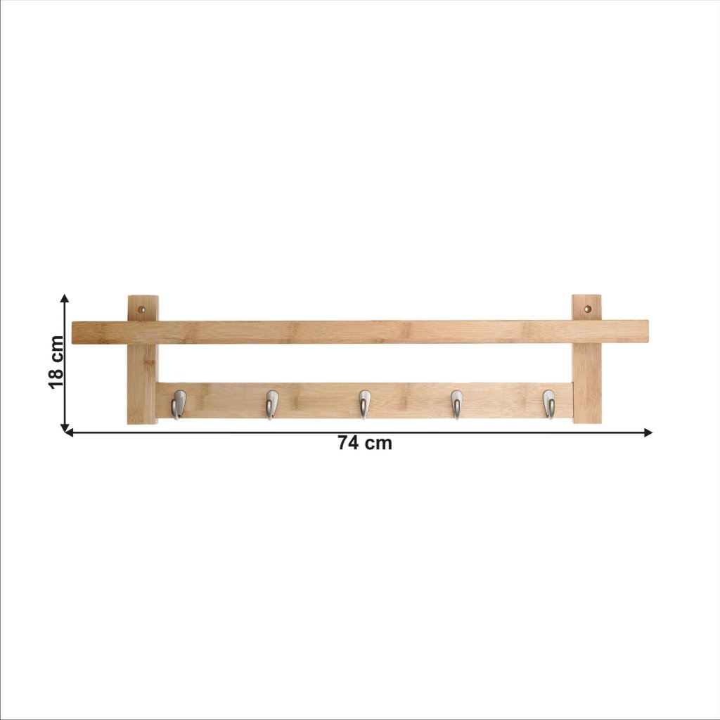 Vyrobená z lakovaného bambusu a ocele, táto polica zabezpečuje vysokú odolnosť a dlhú životnosť. S nosnosťou až 10 kg a piatimi háčikmi je skvelou voľbou na uskladnenie rôznych predmetov a doplnkov, čím prispieva k udržaniu poriadku vo vašom priestore.