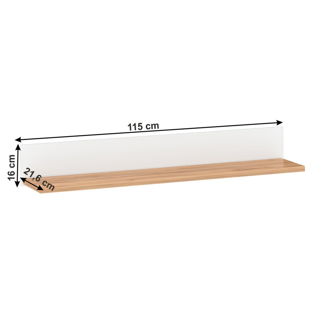 Polica LANZETTE v kombinácii bielej a dubu craft je praktickým doplnkom do vášho interiéru. Rozmery 115x21,6x16 cm, hrúbka 16 mm. Dodávaná v demonte.
