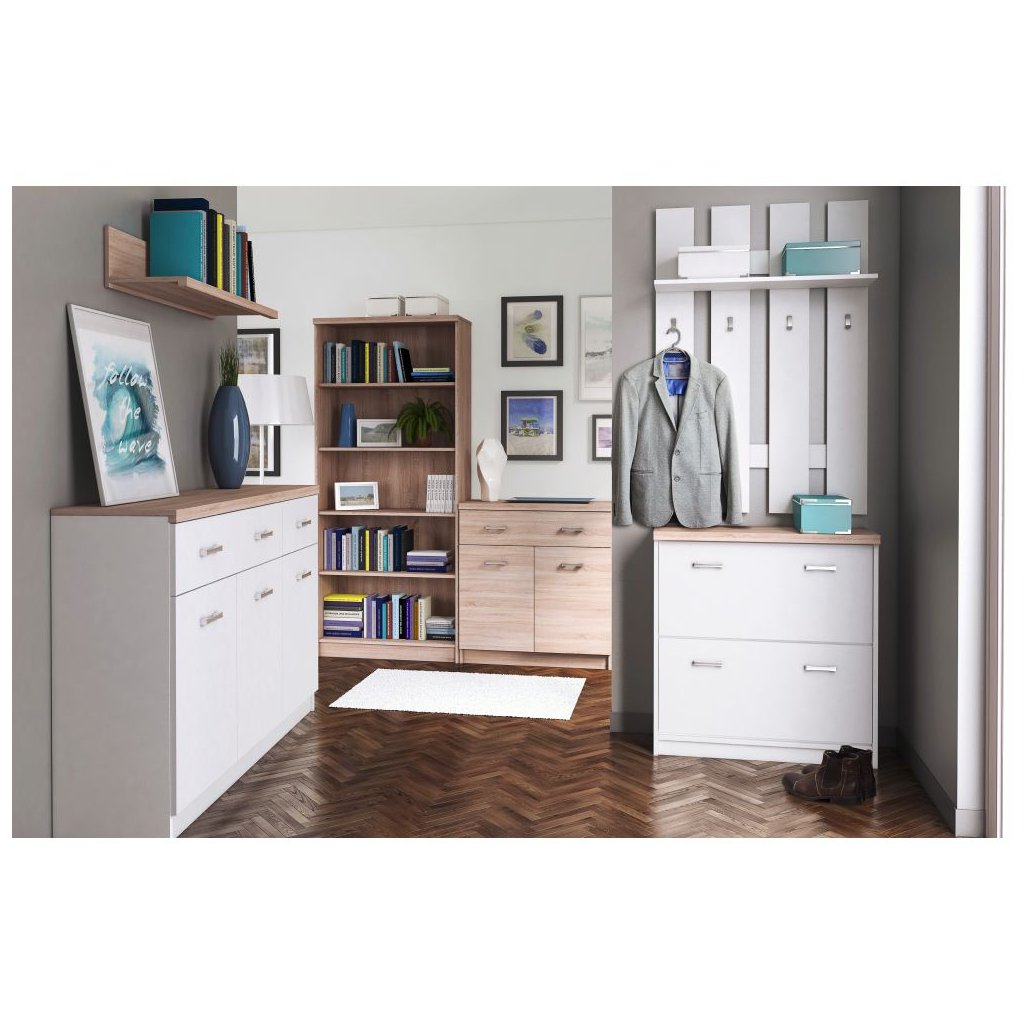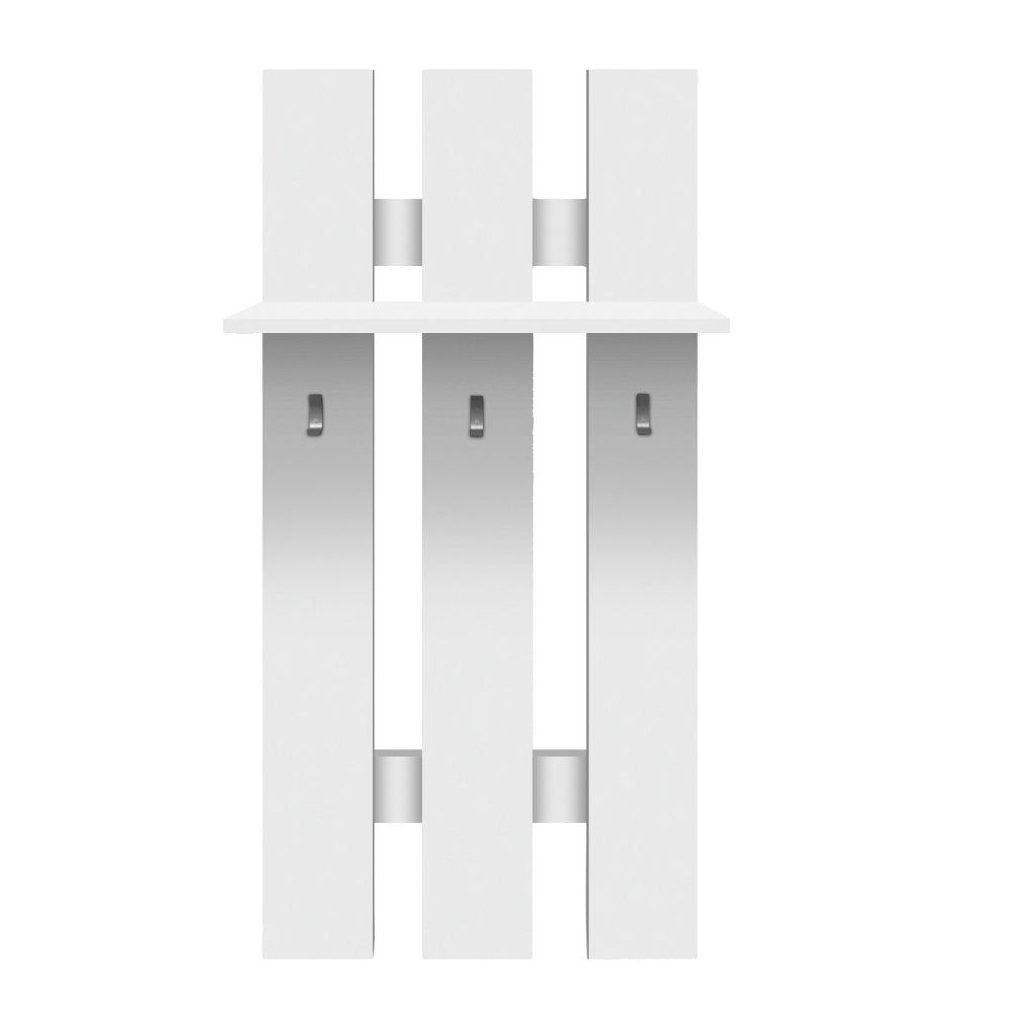 Biela polica s vešiakom ponúka praktické riešenie pre usporiadanie priestoru. Rozmery 60x23x100 cm, nosnosť police 3 kg, tri vešiaky. Dodávané v demonte.