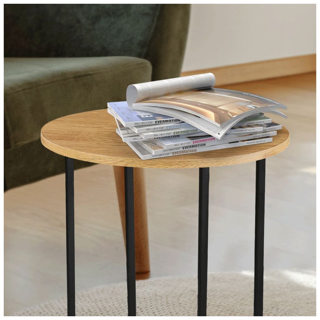 Príručný stolík IMSAR v kombinácii dub/čierna je praktickým doplnkom do každého interiéru. S rozmermi 40x50 cm a kombinovaným materiálom MDF a kov je elegantný a funkčný. Dodávané v demonte.
