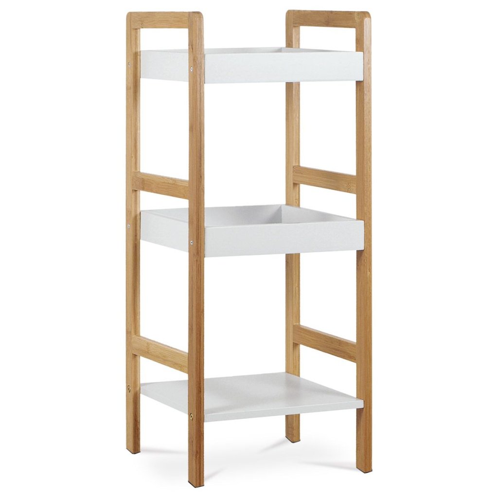 Regál JASNI v bielom prevedení je kombináciou masívneho bambusu a matného MDF. S tromi policami a nosnosťou 9 kg na poličku ponúka praktické úložné riešenie s prírodným vzhľadom.
