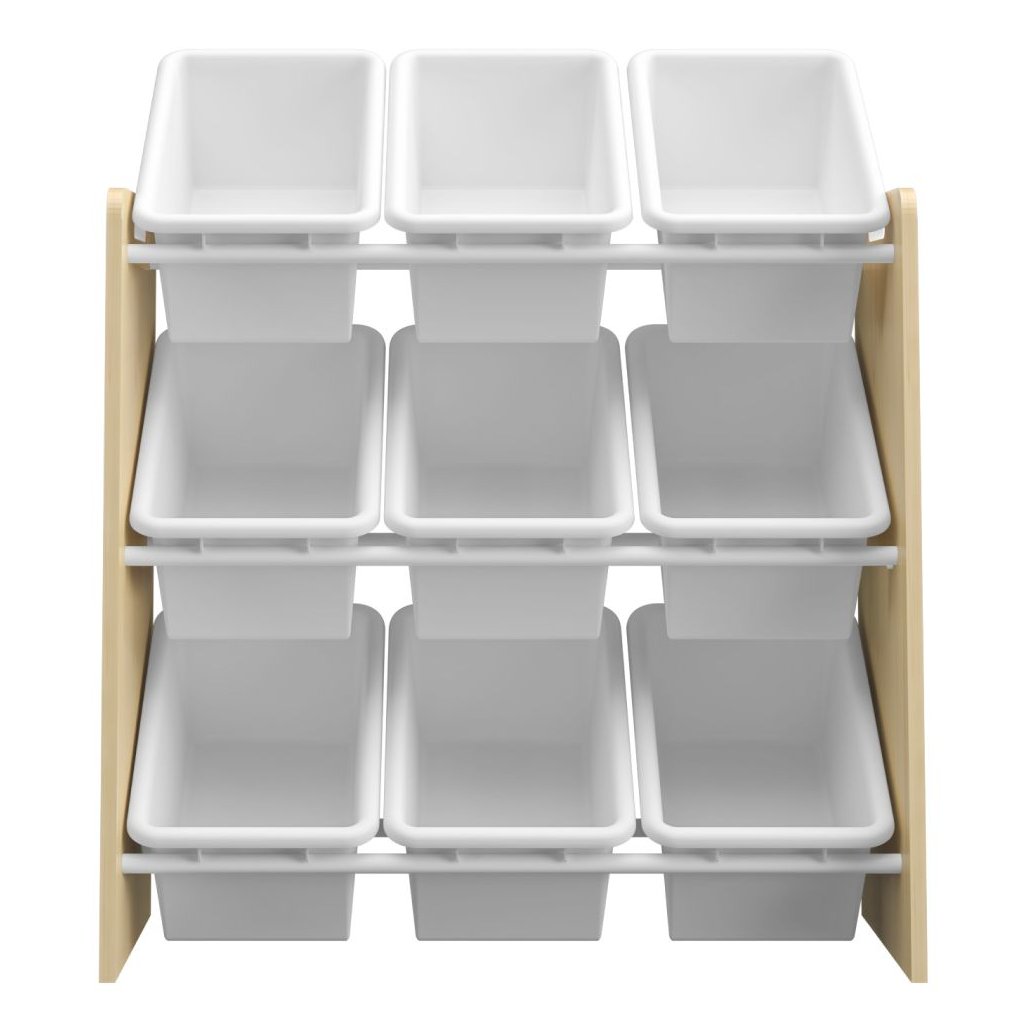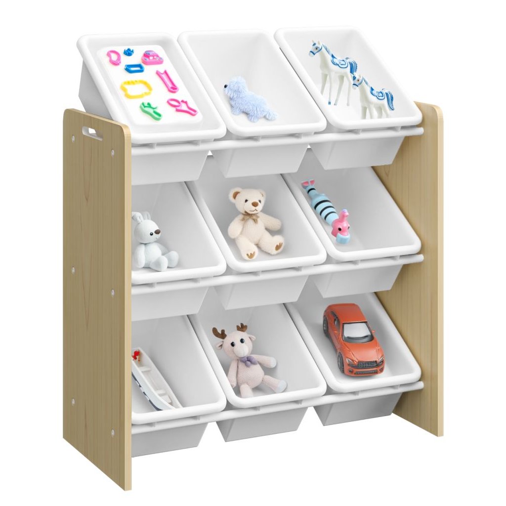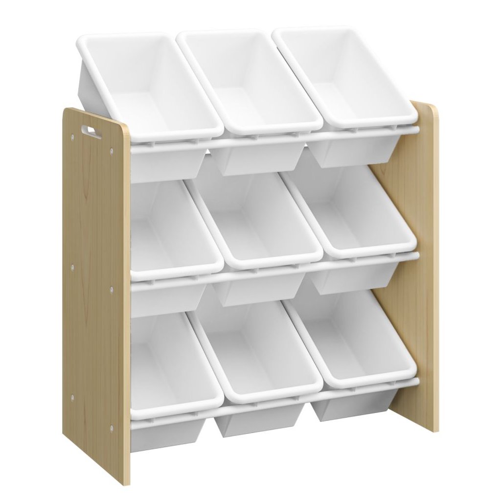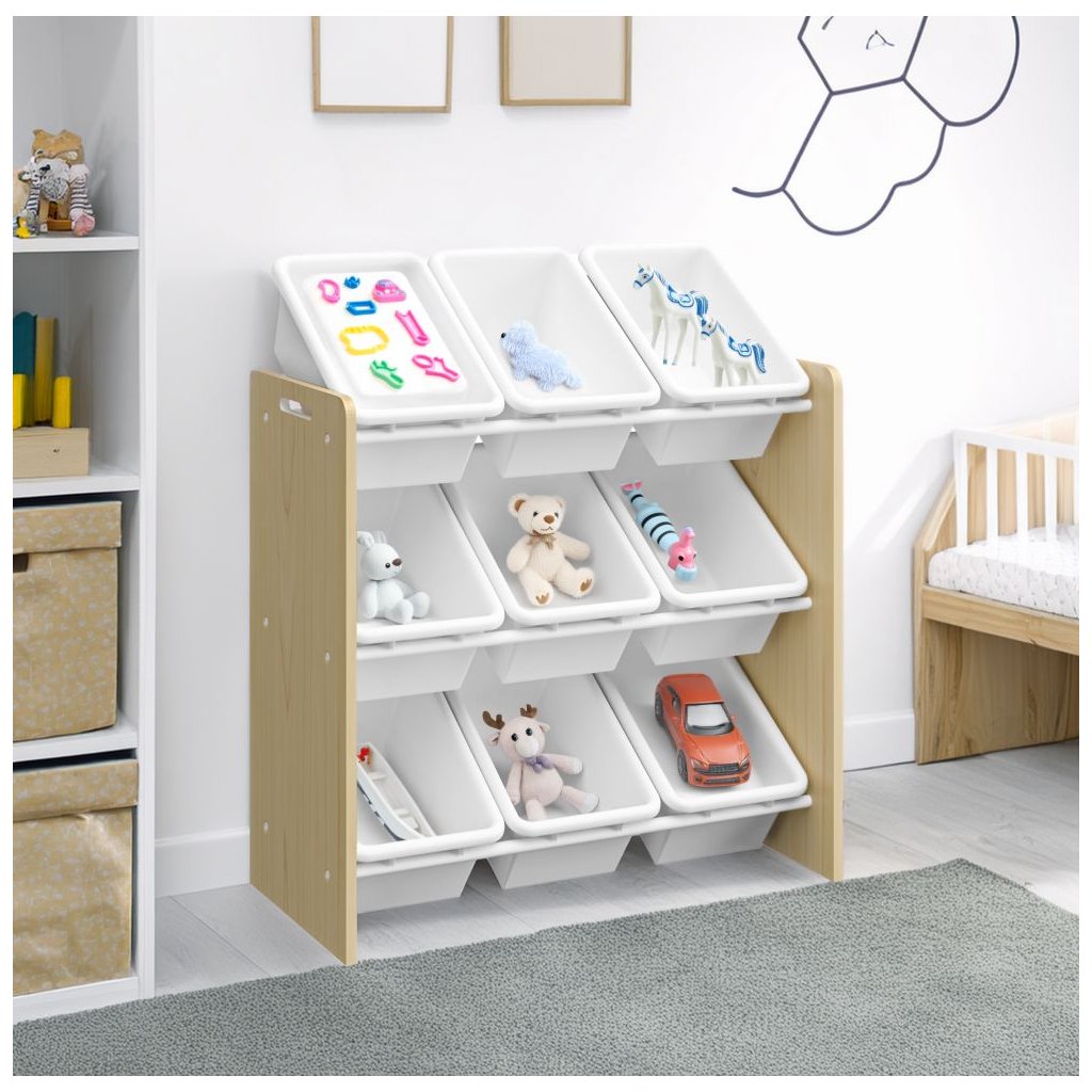 Praktický trojposchodový regál na hračky s 9 plastovými boxmi. Vyrobený z MDF a kovu, ideálny na organizáciu hračiek, kníh a školských potrieb v detskej izbe. Dodávané v demonte.
