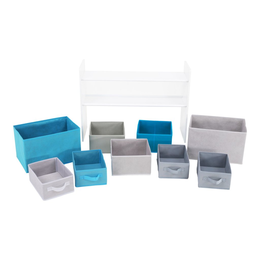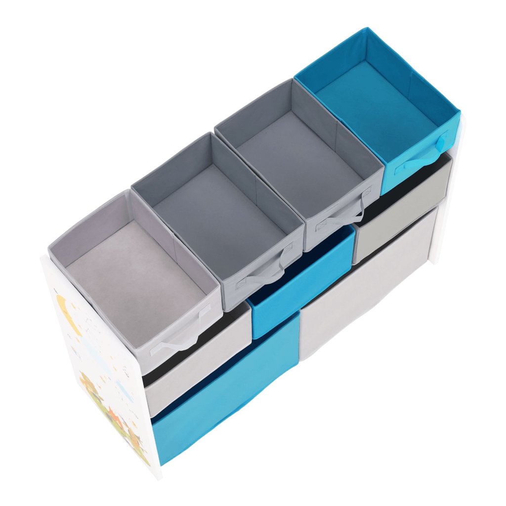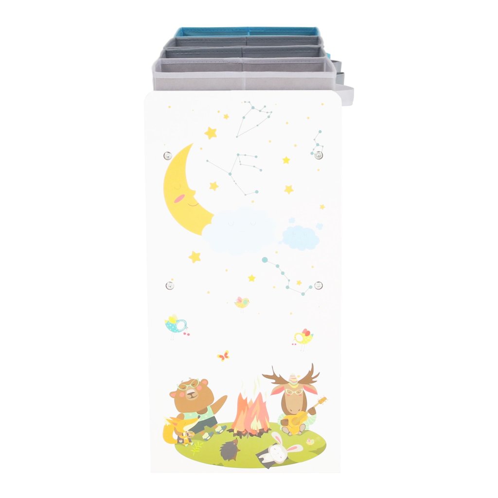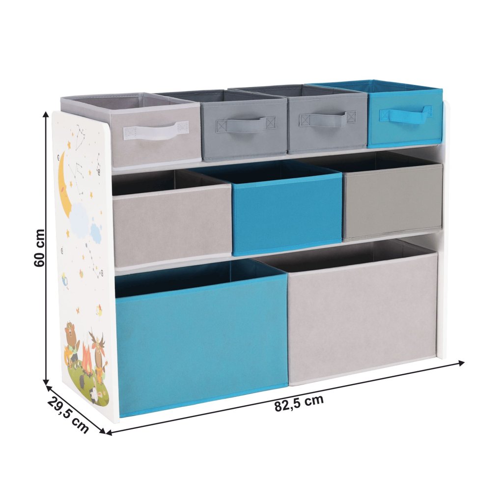 Regál sa skladá z praktických látkových boxov a kovových tyčí, ktoré zabezpečujú stabilitu a trvácnosť. S jeho pomocou si deti môžu samostatne ukladať svoje veci, čo podporuje ich zodpovednosť a samostatnosť. Vďaka skladacím boxom je regál flexibilný a ľahko prispôsobiteľný potrebám každého dieťaťa.