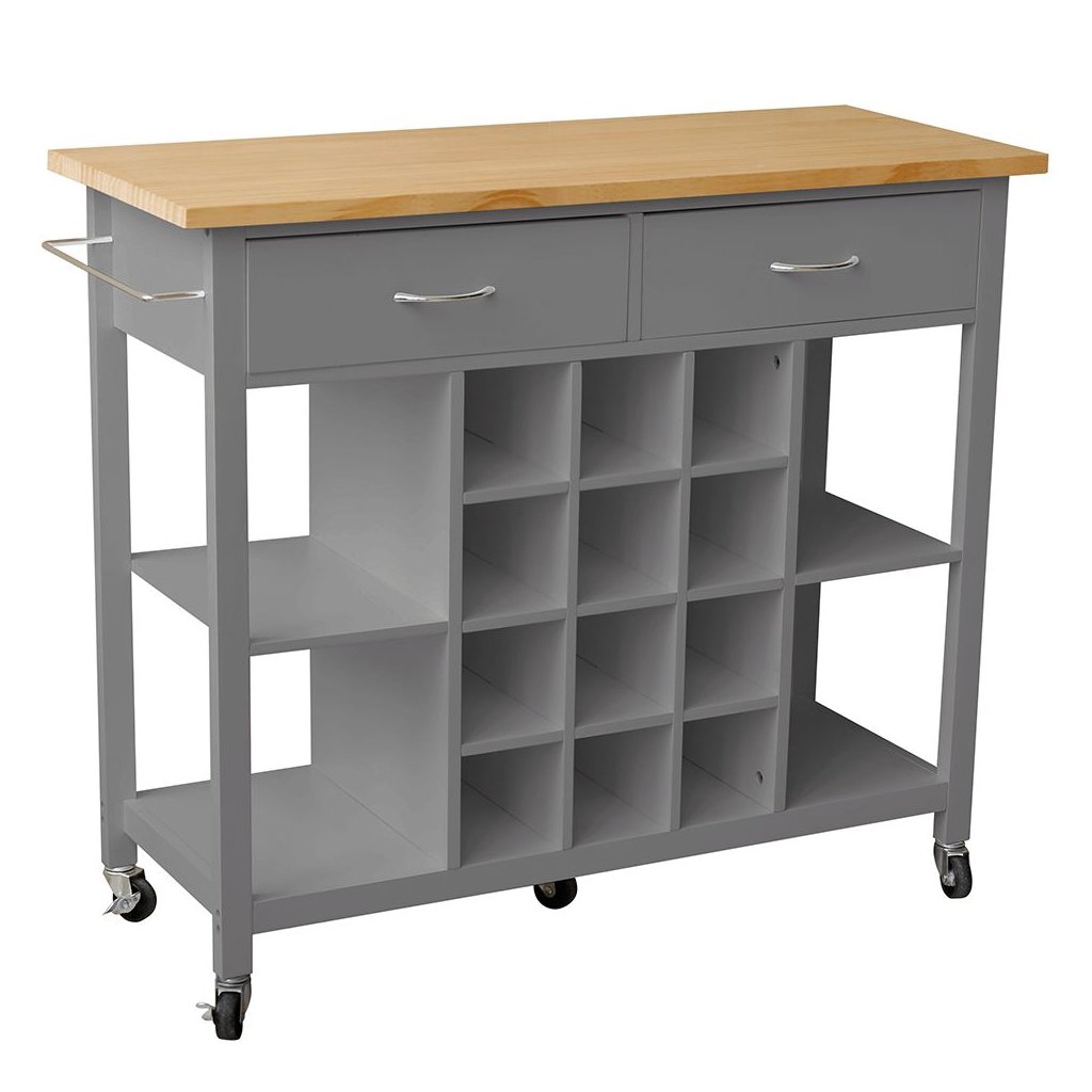 Servírovací stolík DILIA v tmavosivej farbe s prírodnou masívnou borovicovou doskou. Rozmery 100x40x85 cm, nosnosť 40 kg. Obsahuje regál na fľaše, držiak na poháre, zásuvky a otvorené úložné priestory