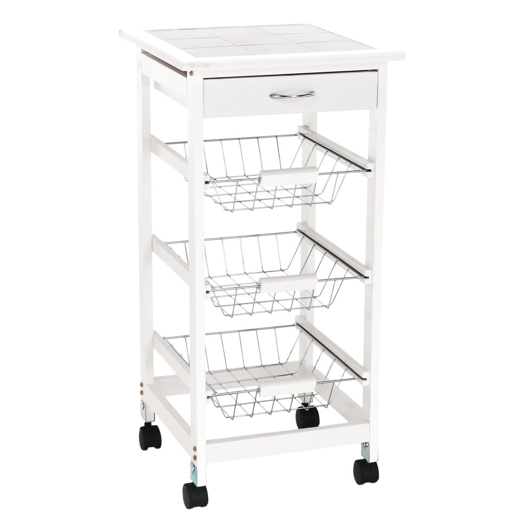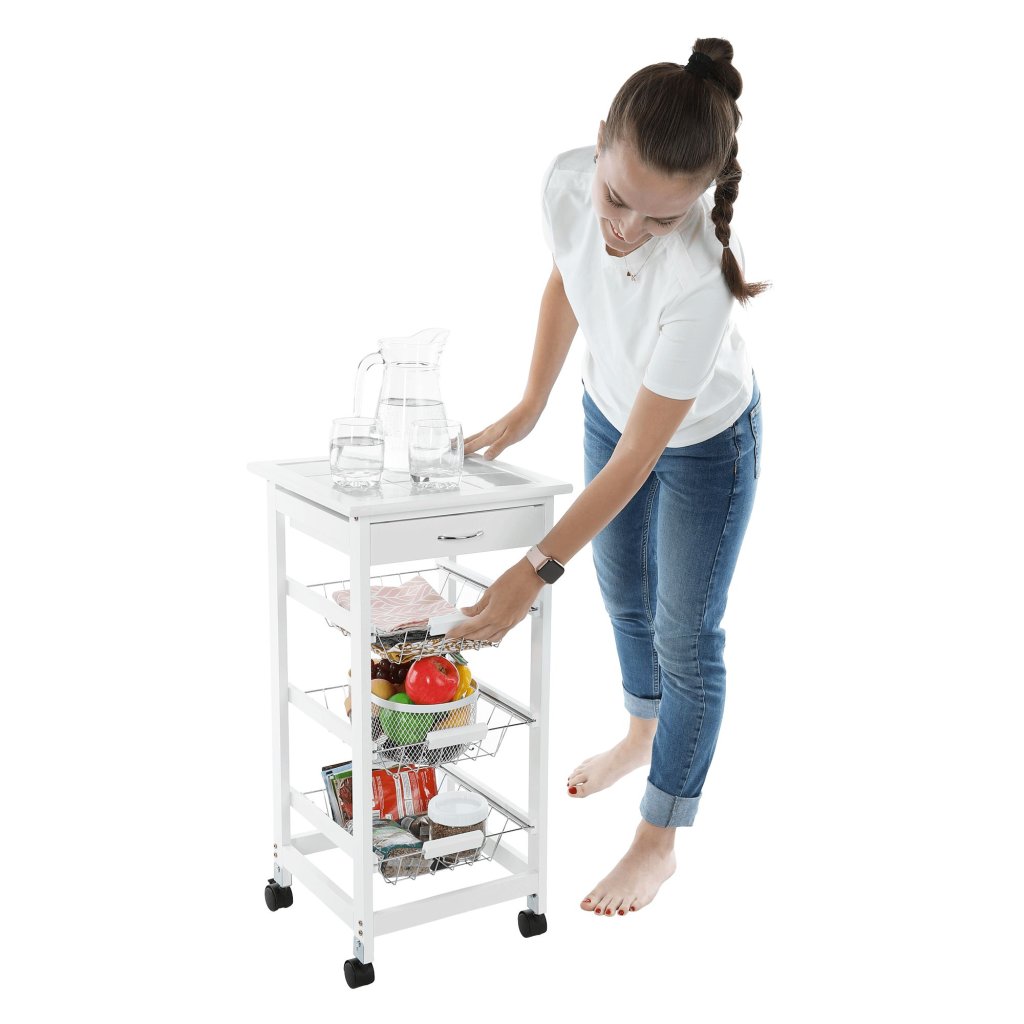 Servírovací stolík KORUS v bielej farbe s MDF konštrukciou a keramickou vrchnou doskou. Má tri vyberateľné kovové košíky, jednu zásuvku a kolieska s brzdami pre jednoduché premiestnenie. Rozmery 37x37