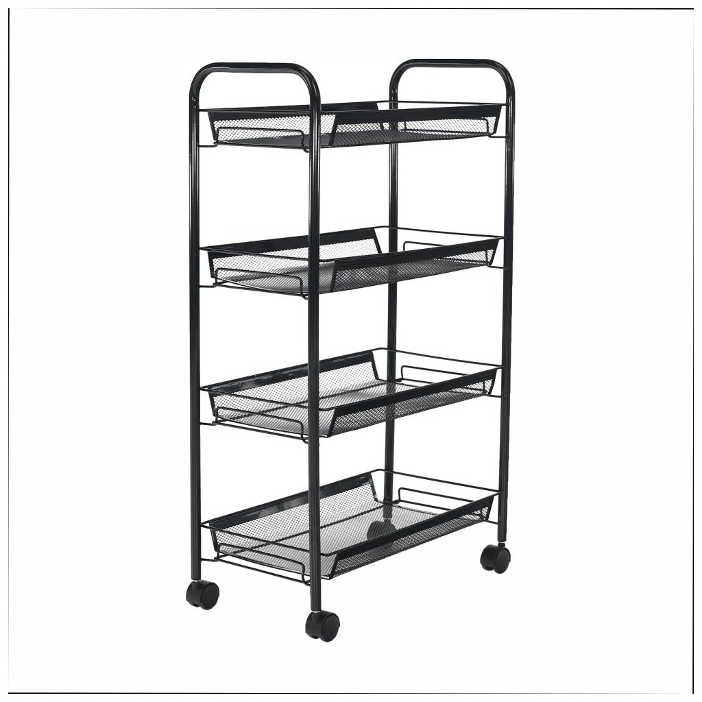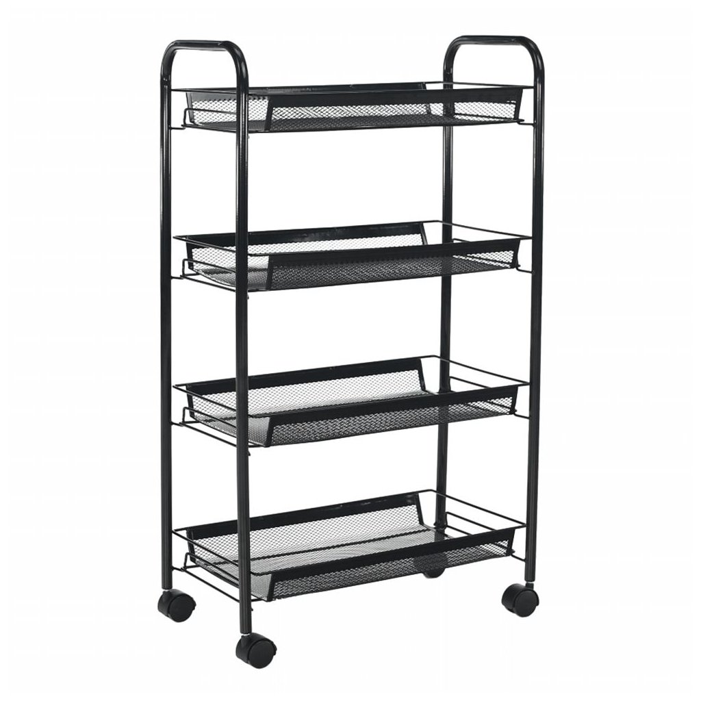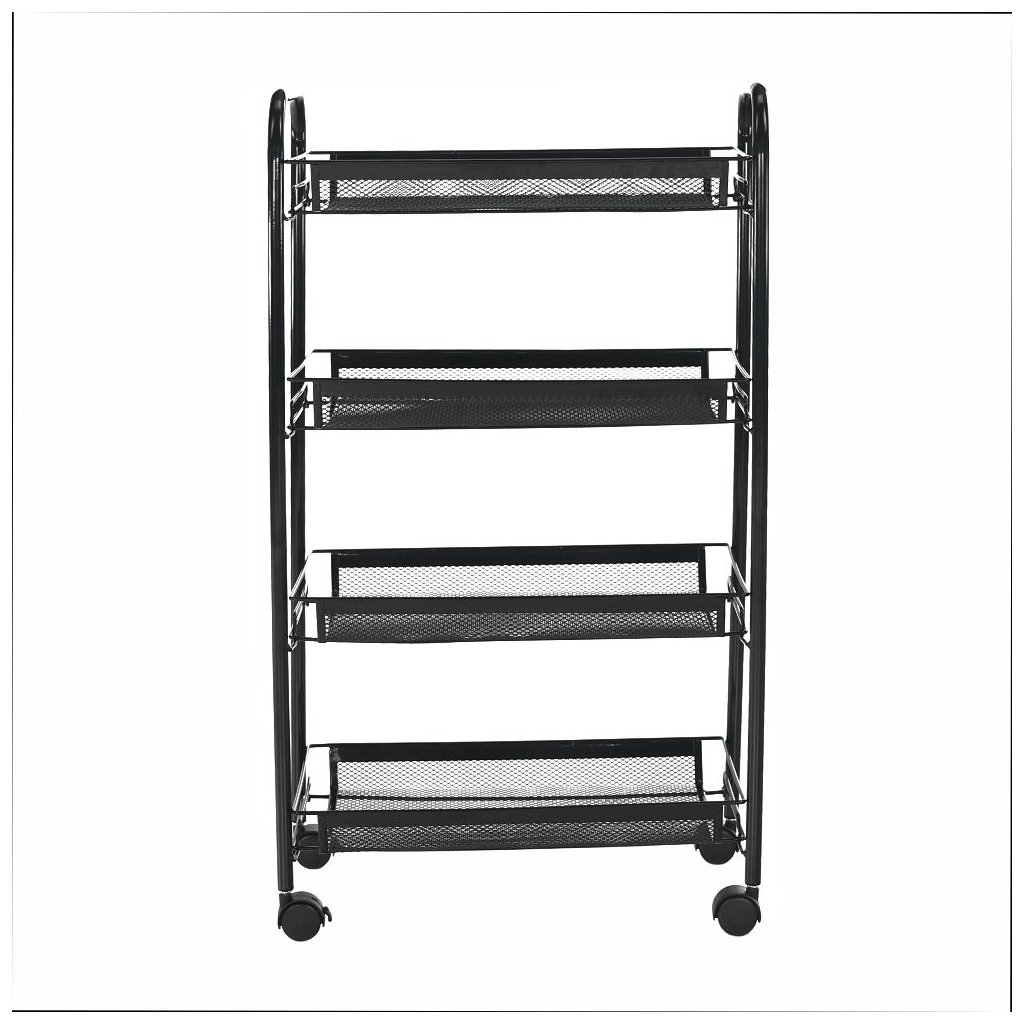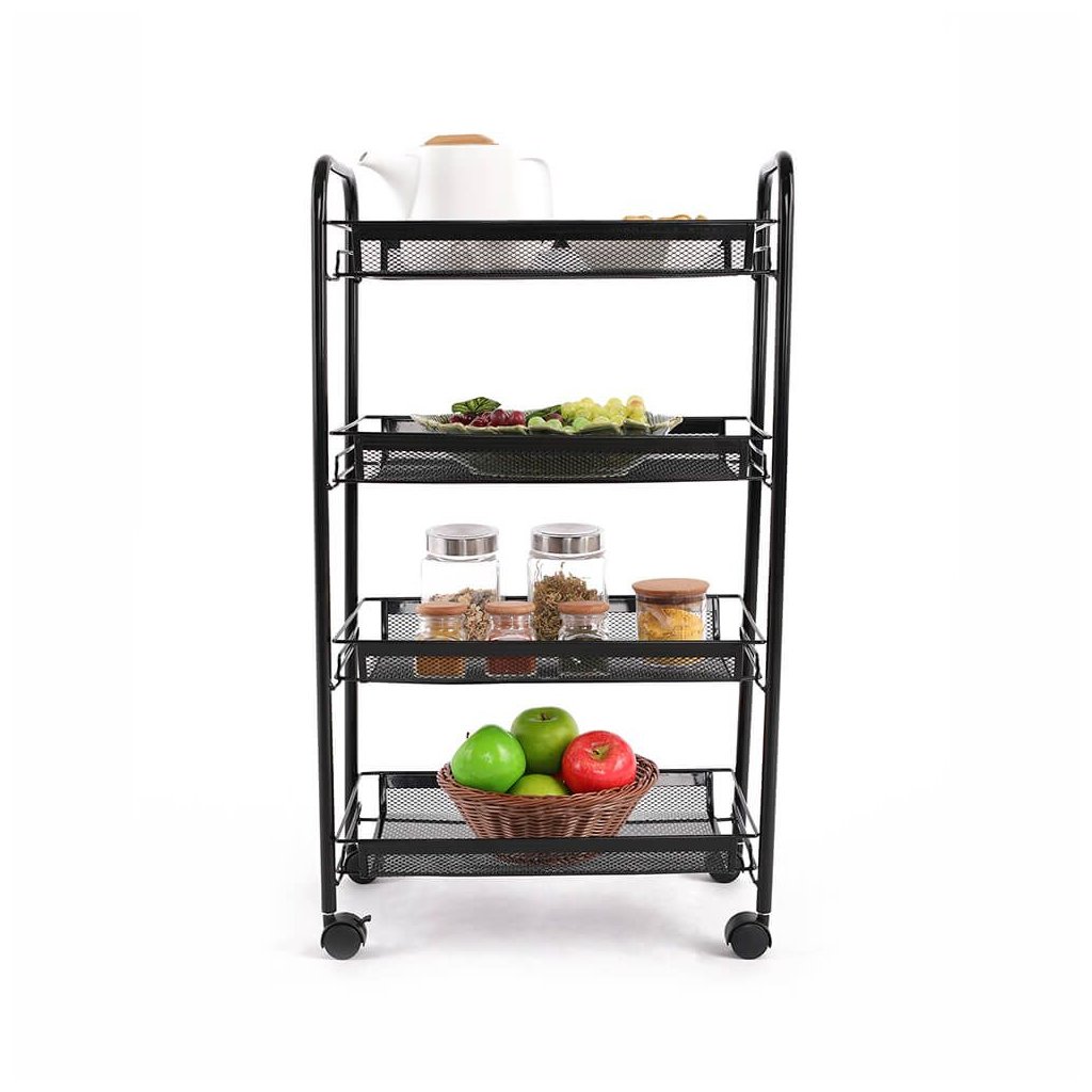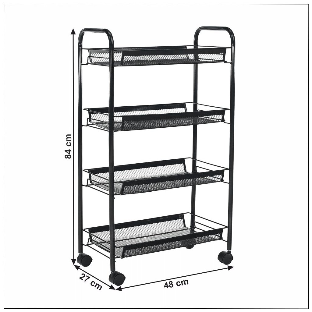 Moderný servírovací stolík MYRIS v čiernej farbe s kovovou a plastovou konštrukciou. Vhodný do každej miestnosti, s 4 policami a nosnosťou 35 kg. S kolieskami pre jednoduchú manipuláciu. Dodávaný v de