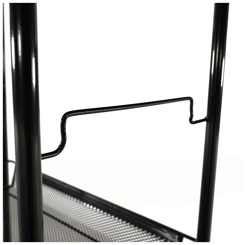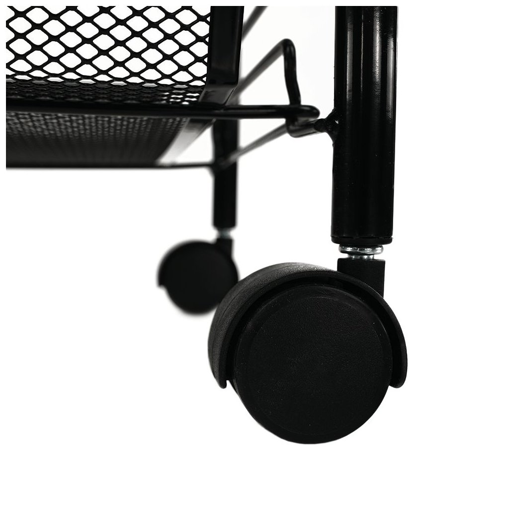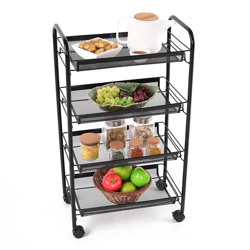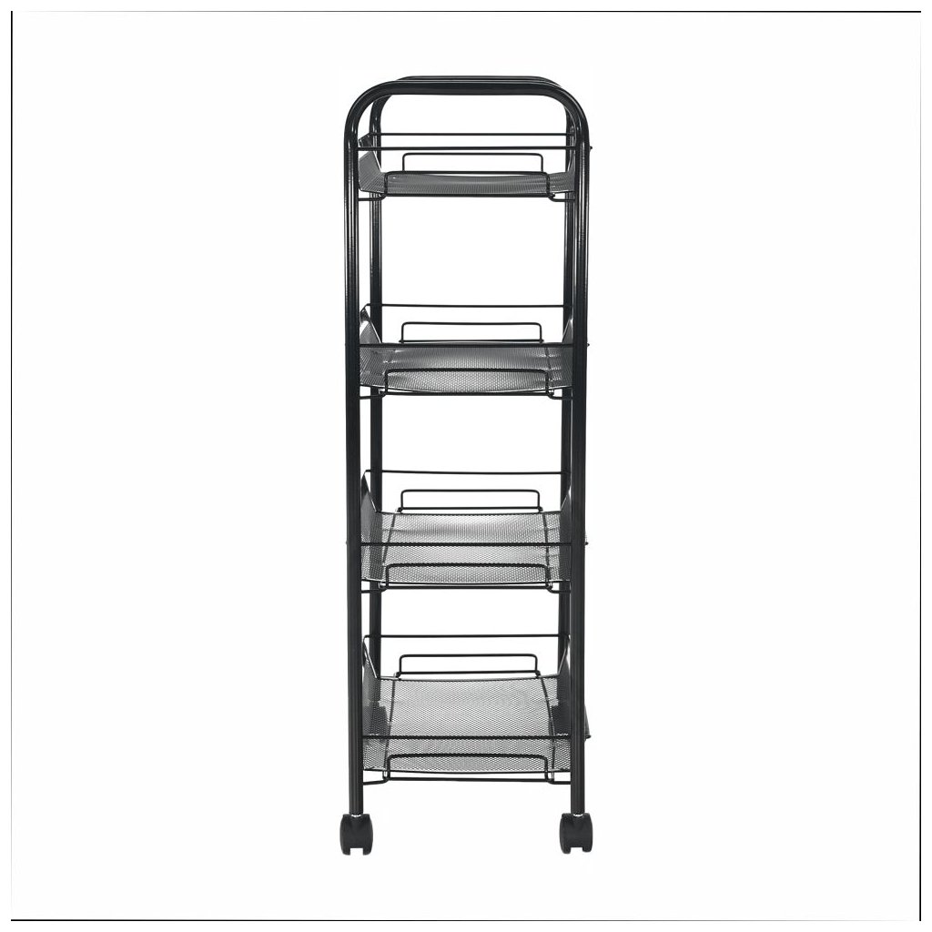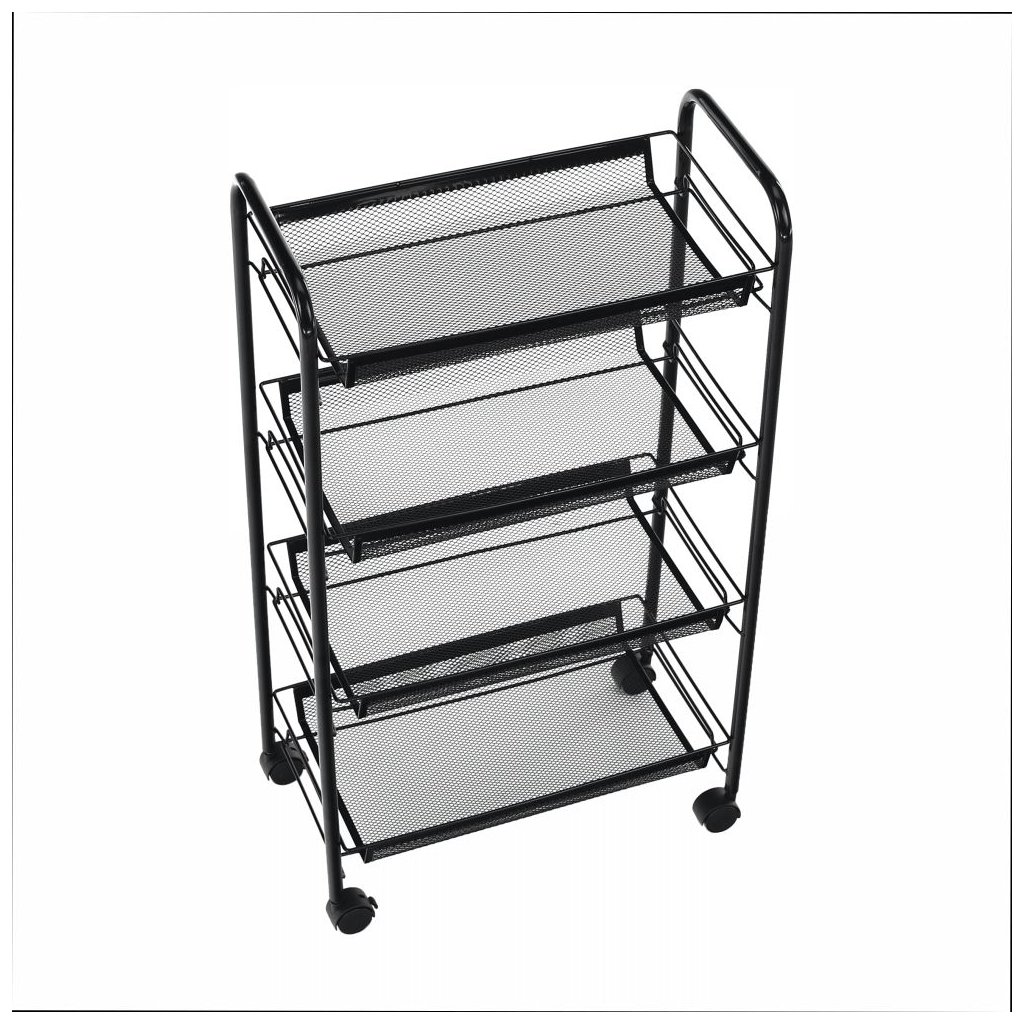 Moderný servírovací stolík MYRIS v čiernej farbe s kovovou a plastovou konštrukciou. Vhodný do každej miestnosti, s 4 policami a nosnosťou 35 kg. S kolieskami pre jednoduchú manipuláciu. Dodávaný v de