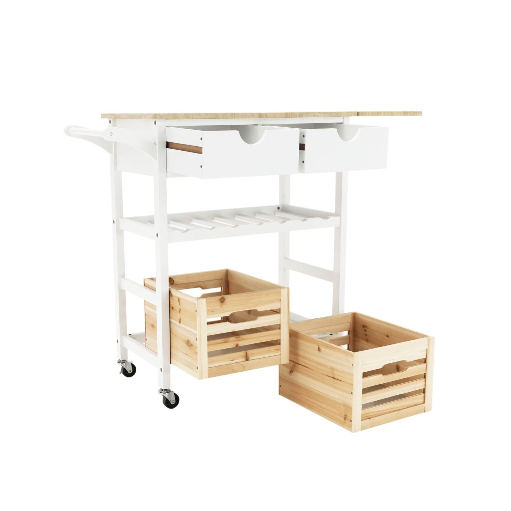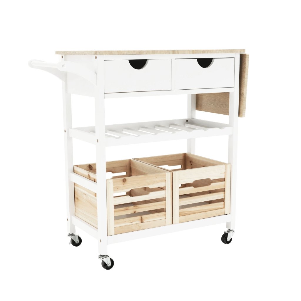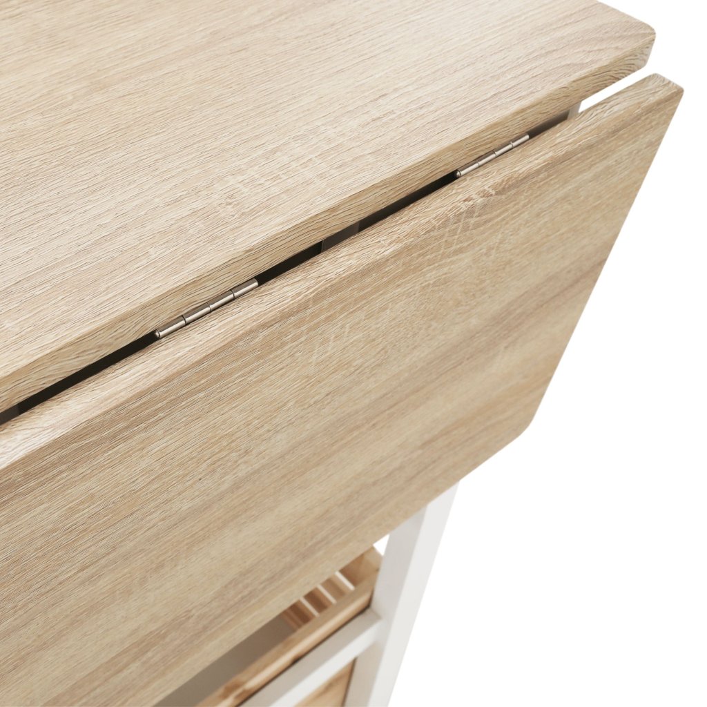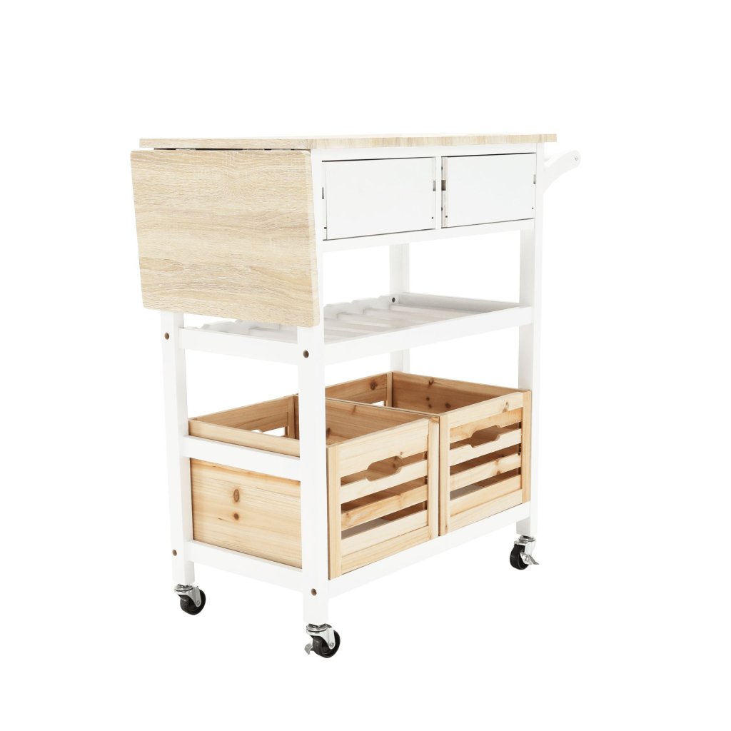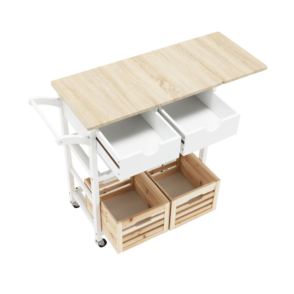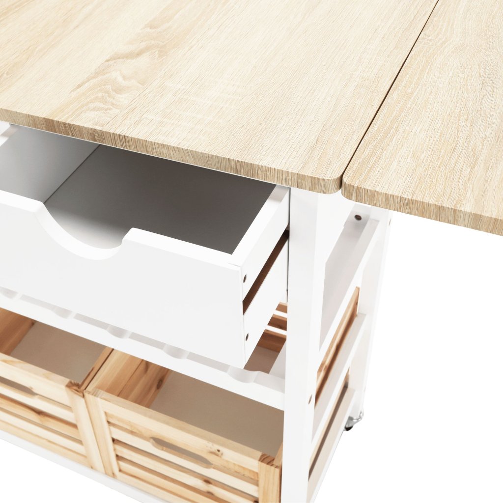 Servírovací stolík PASSAT v bielej a prírodnej farbe kombinuje moderný dizajn s praktickosťou. Sklápacia doska, kolieska, 2 šuplíky a vyberateľné košíky zabezpečujú dostatok úložného priestoru. Dodáva