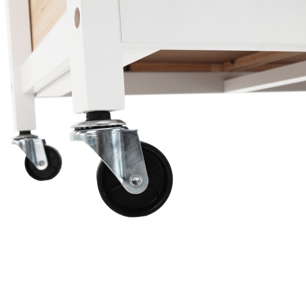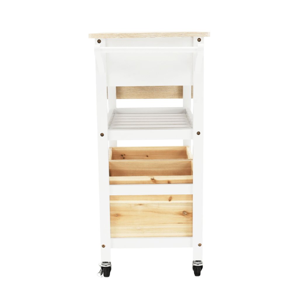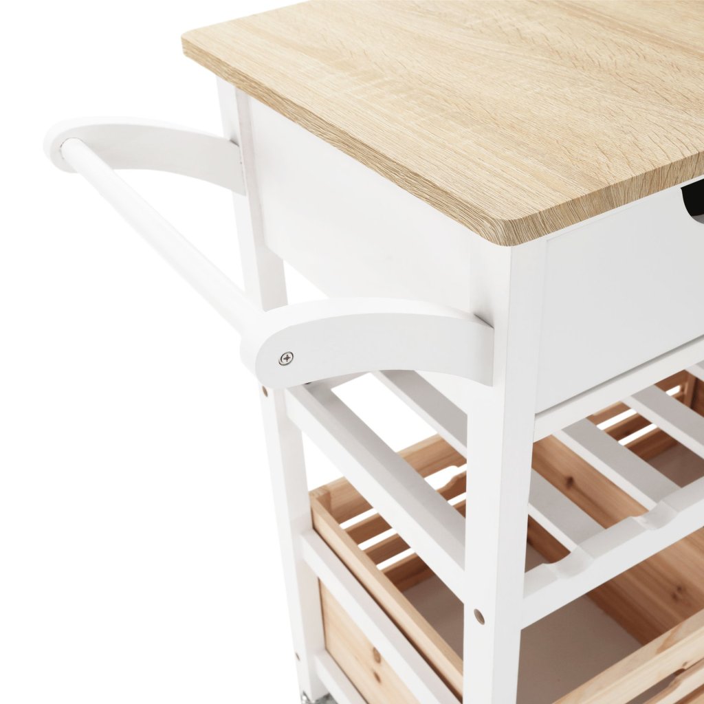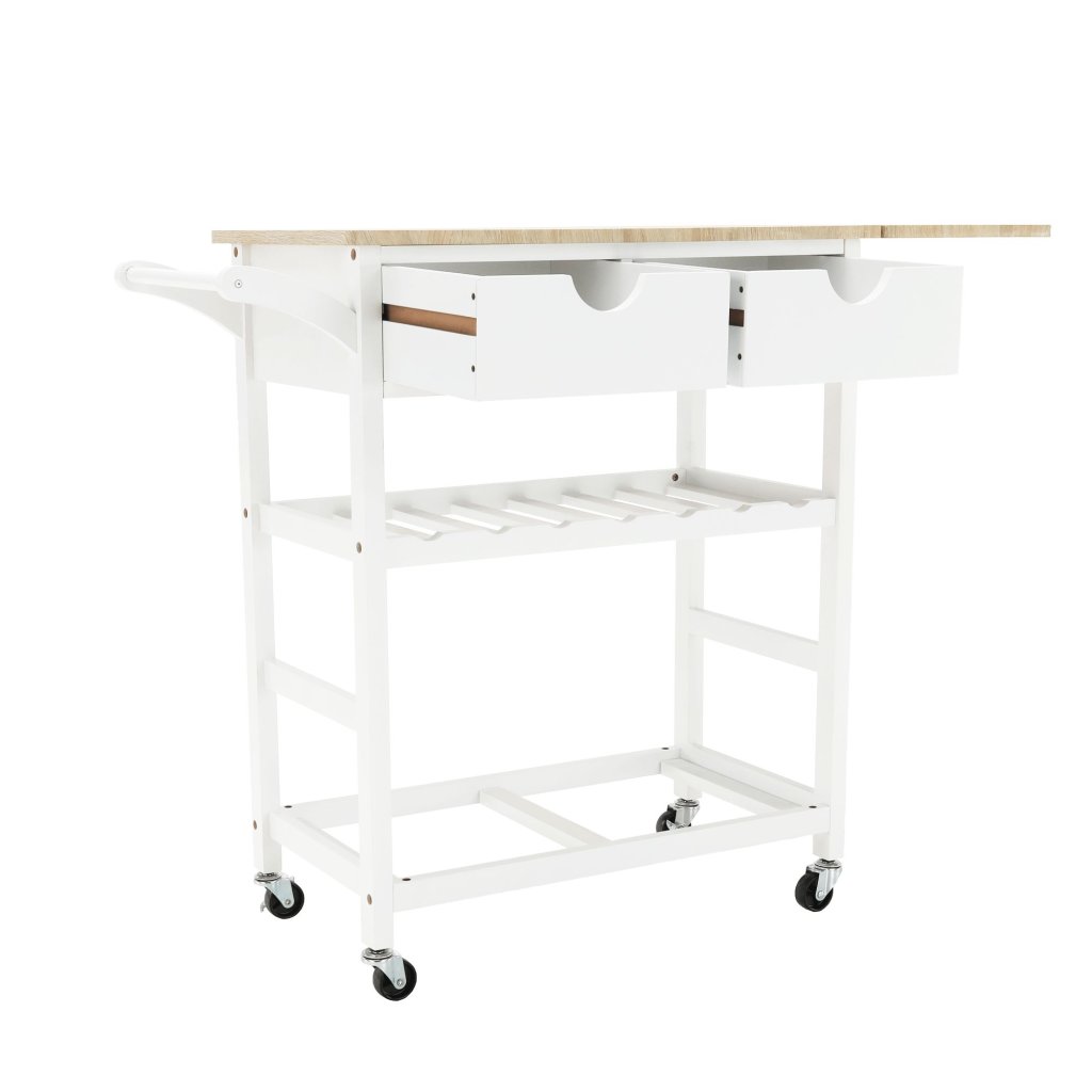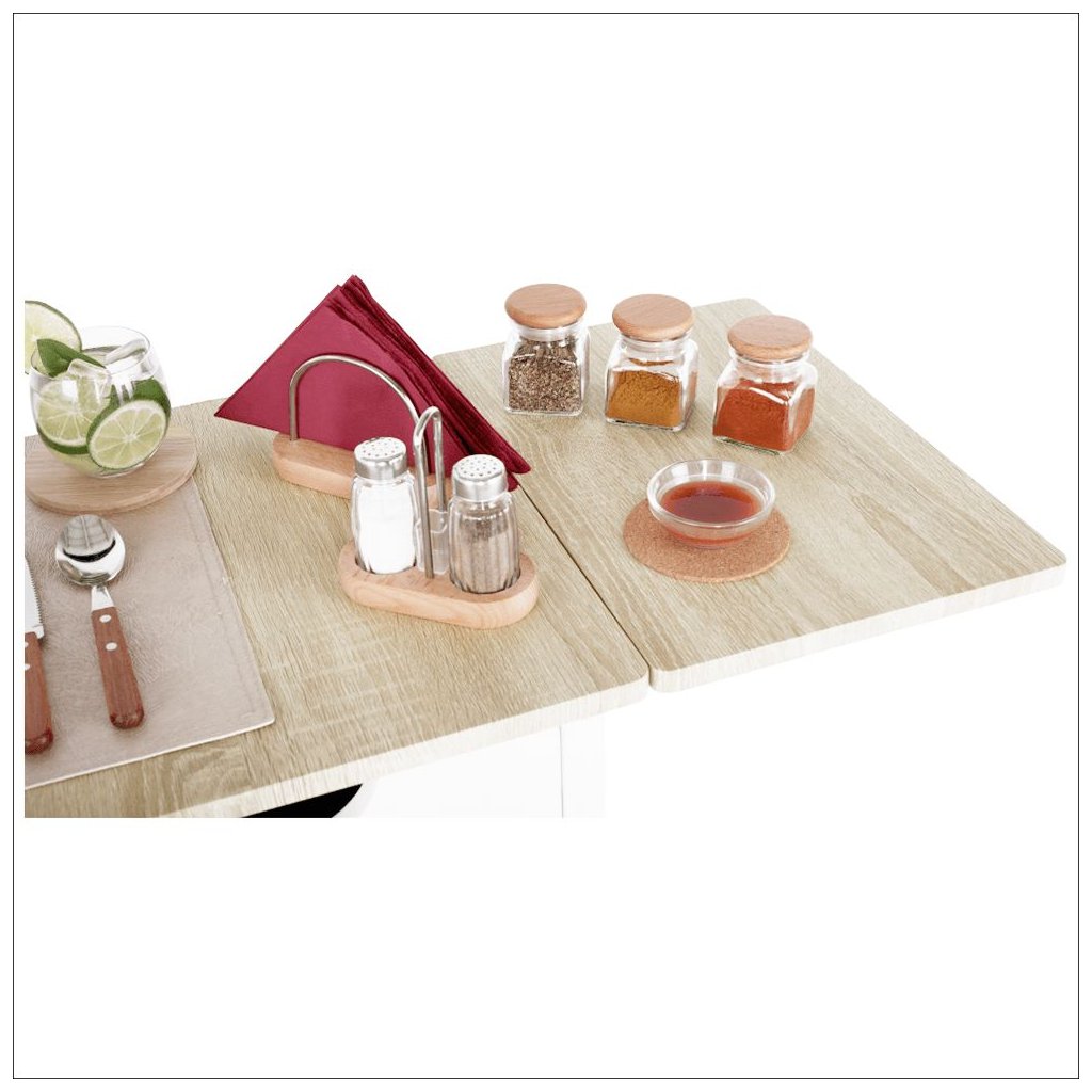 Servírovací stolík PASSAT v bielej a prírodnej farbe kombinuje moderný dizajn s praktickosťou. Sklápacia doska, kolieska, 2 šuplíky a vyberateľné košíky zabezpečujú dostatok úložného priestoru. Dodáva
