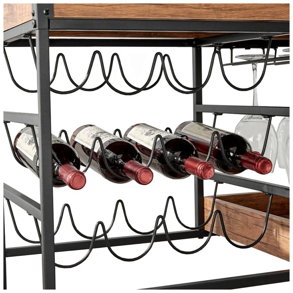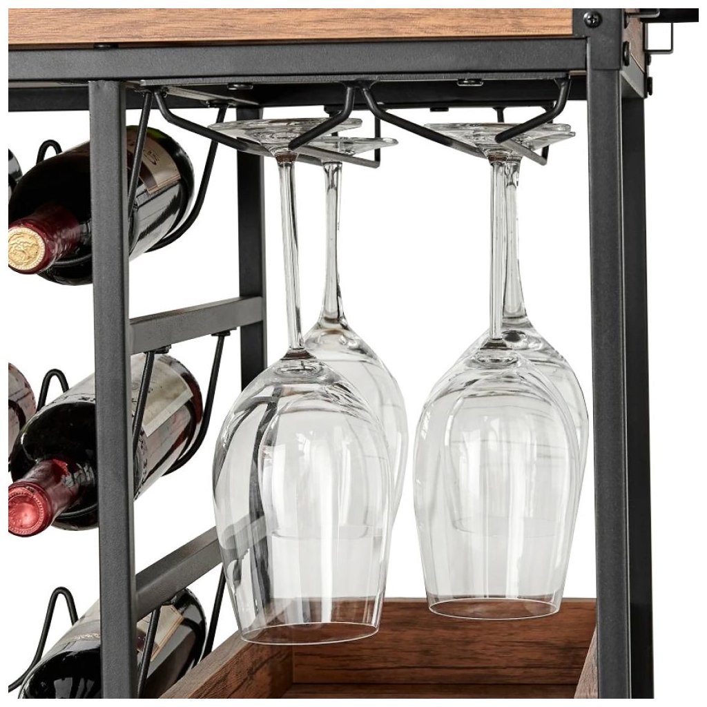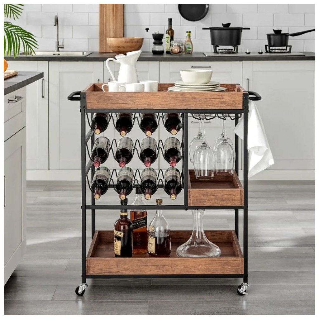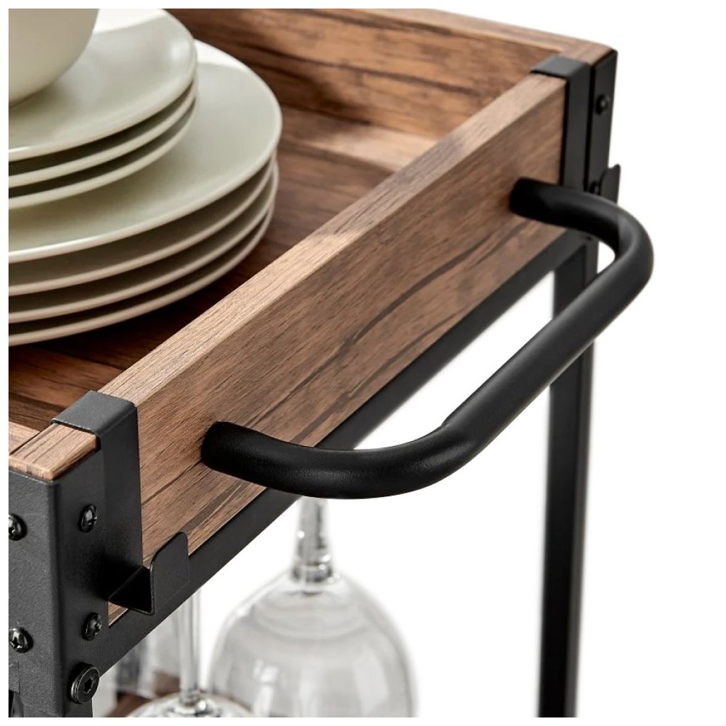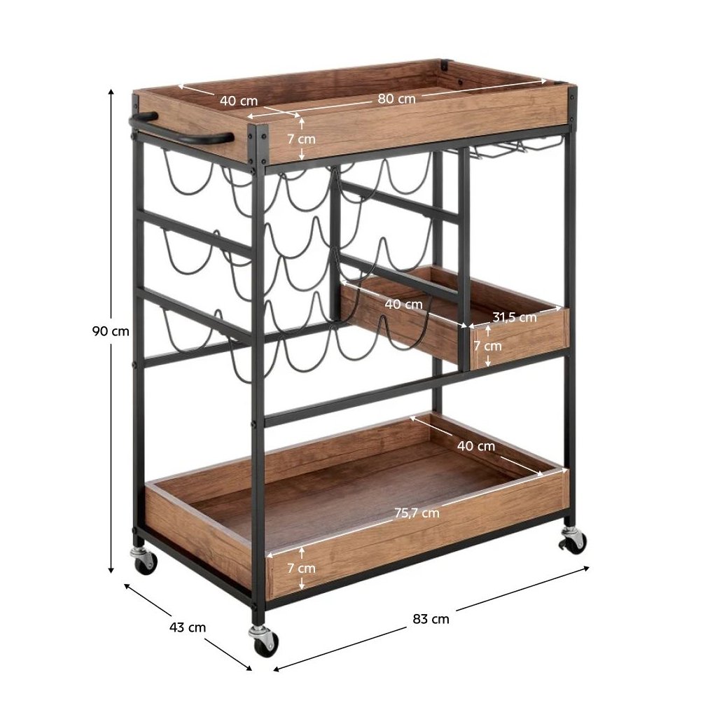 Servírovací stolík PORTIS v tmavo-dubovej farbe s čiernymi prvkami je praktickým a štýlovým doplnkom. S kolieskami a brzdami, odnímateľnou vrchnou policou a držiakmi na fľaše a poháre ponúka multifunk