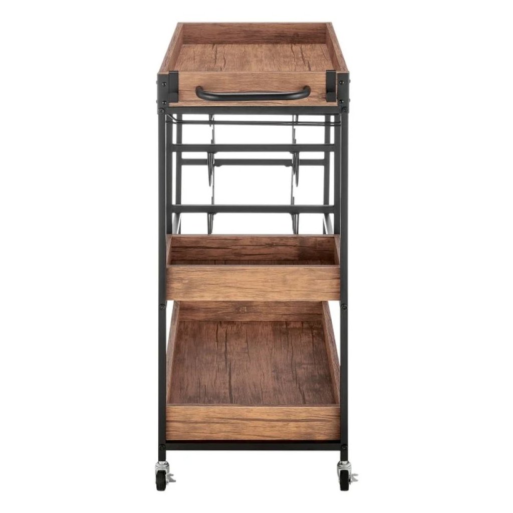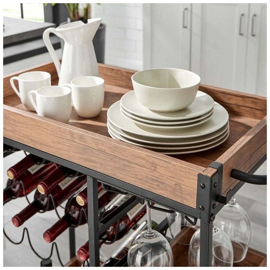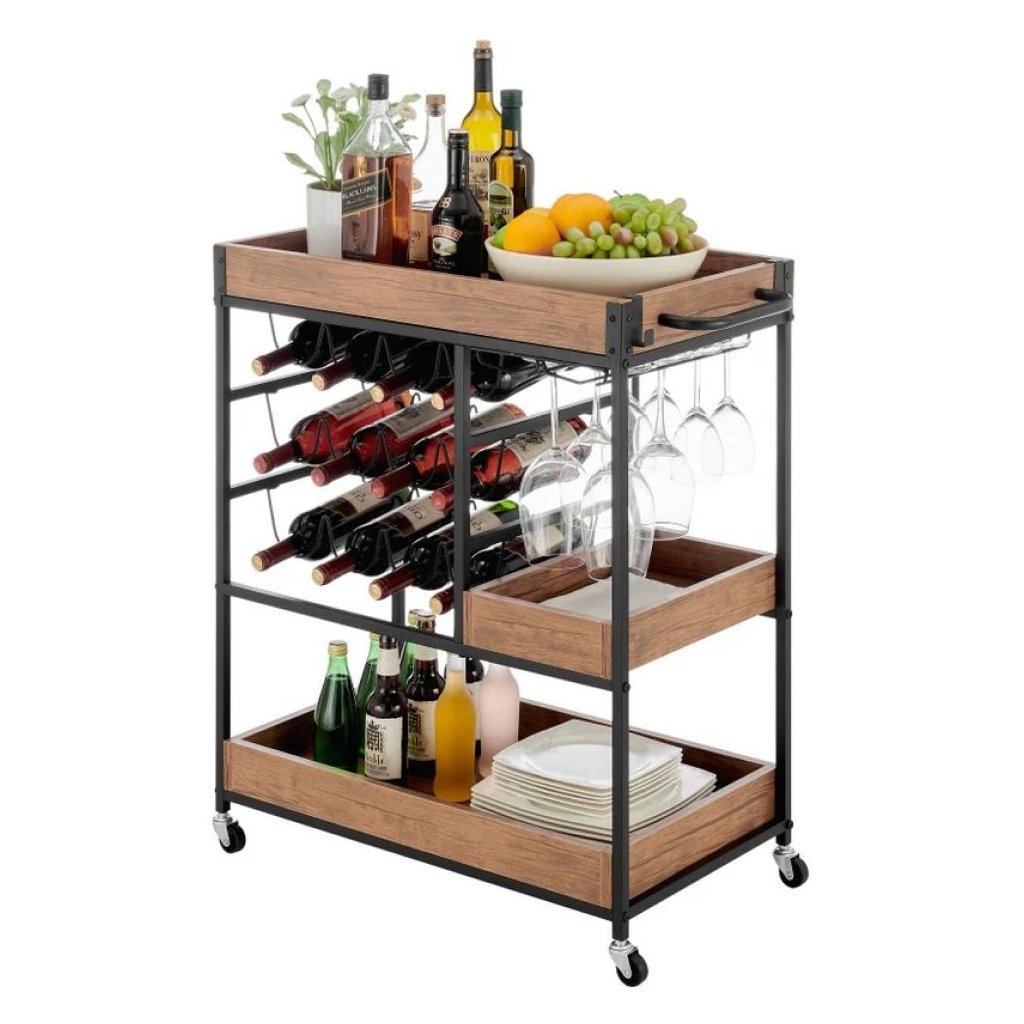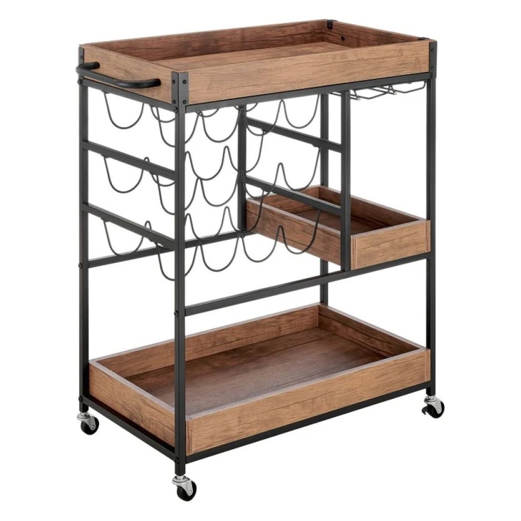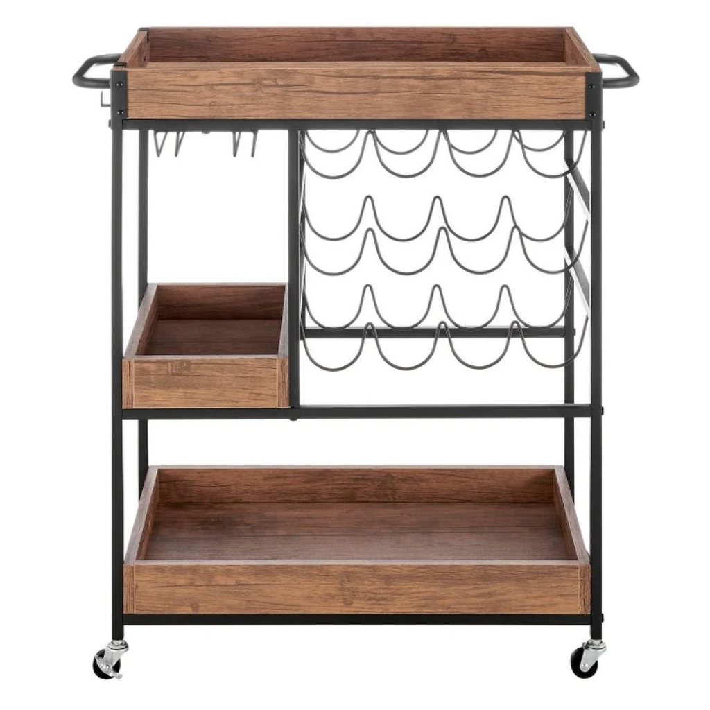 Servírovací stolík PORTIS v tmavo-dubovej farbe s čiernymi prvkami je praktickým a štýlovým doplnkom. S kolieskami a brzdami, odnímateľnou vrchnou policou a držiakmi na fľaše a poháre ponúka multifunk
