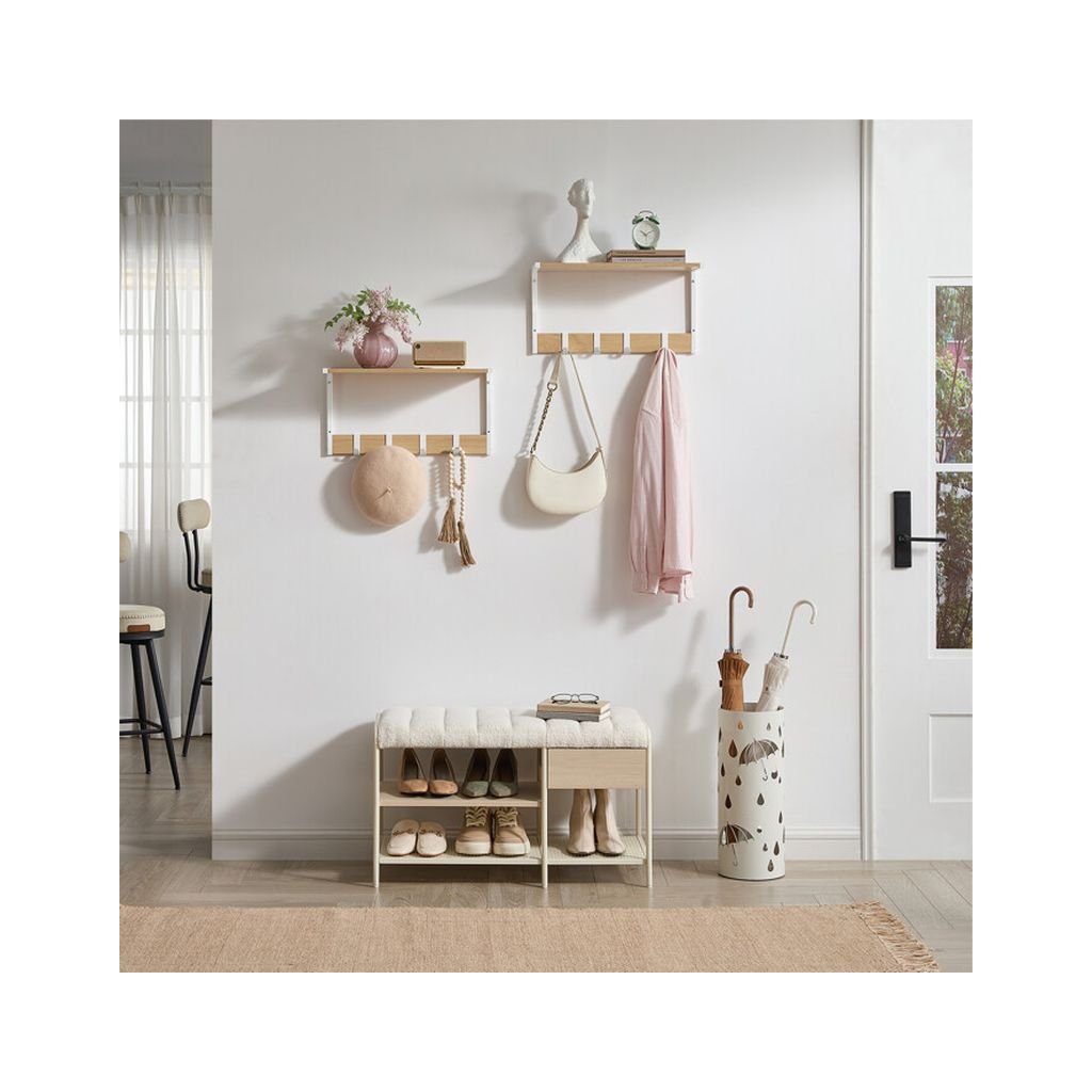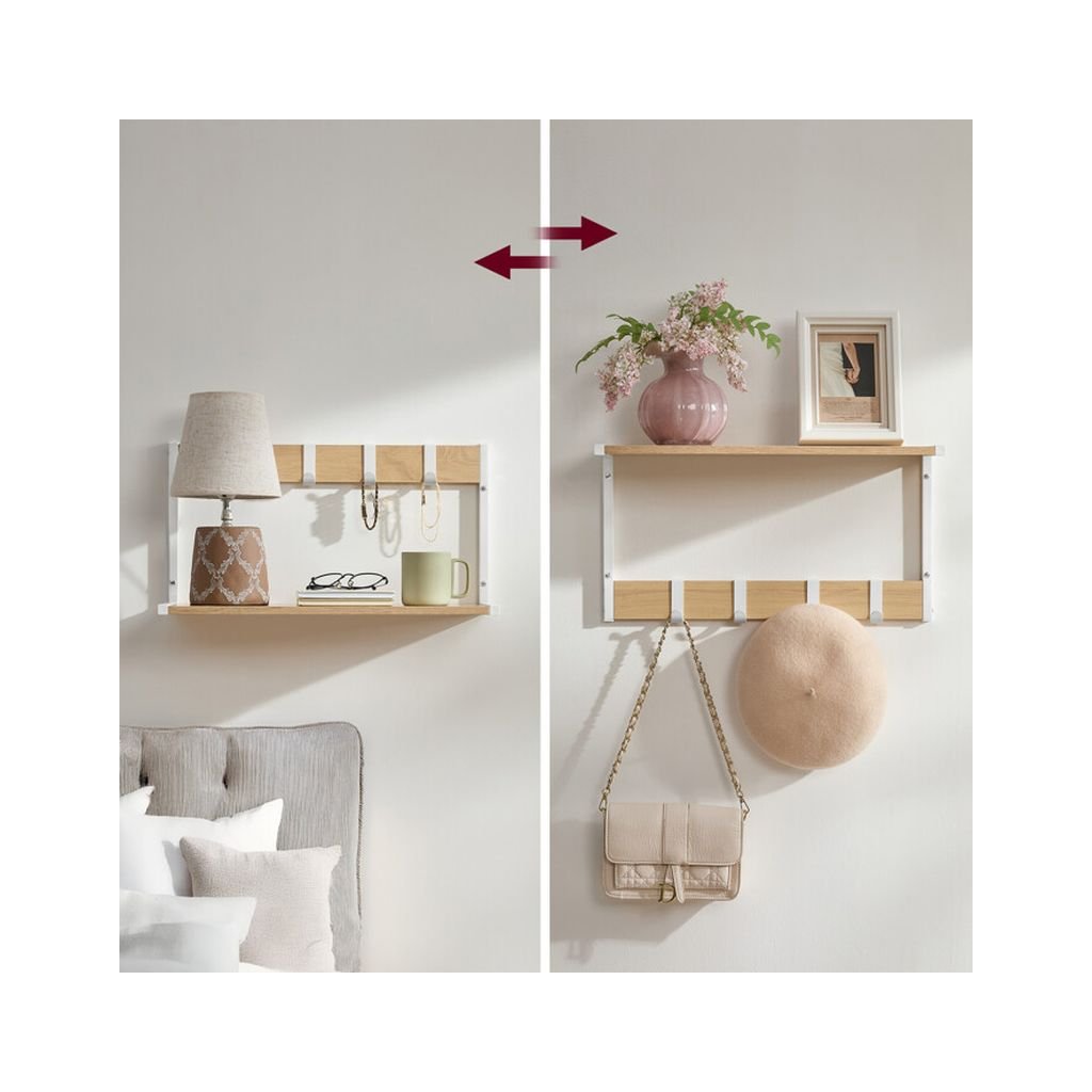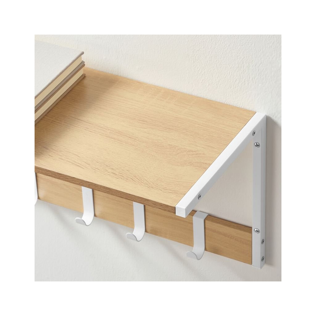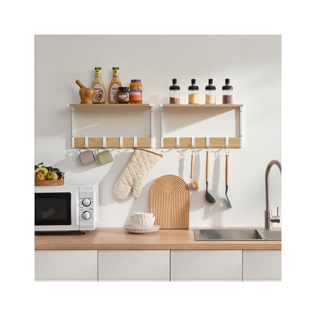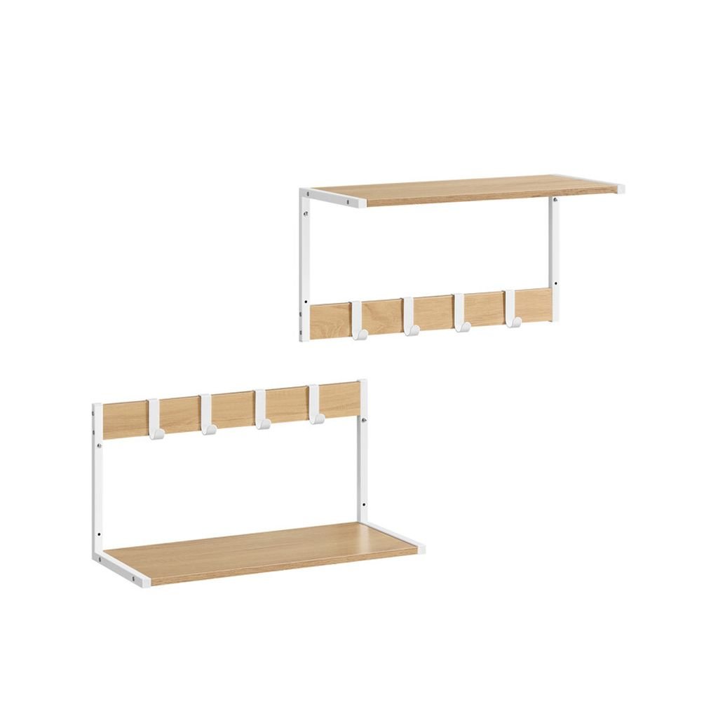 Set dvoch nástenných poličiek v bielej farbe ponúka praktický odkladací priestor a štyri háčiky na zavesenie drobností. Pevná konštrukcia z MDF a kovu zaručuje stabilitu a dlhú životnosť. Rozmery 50x2