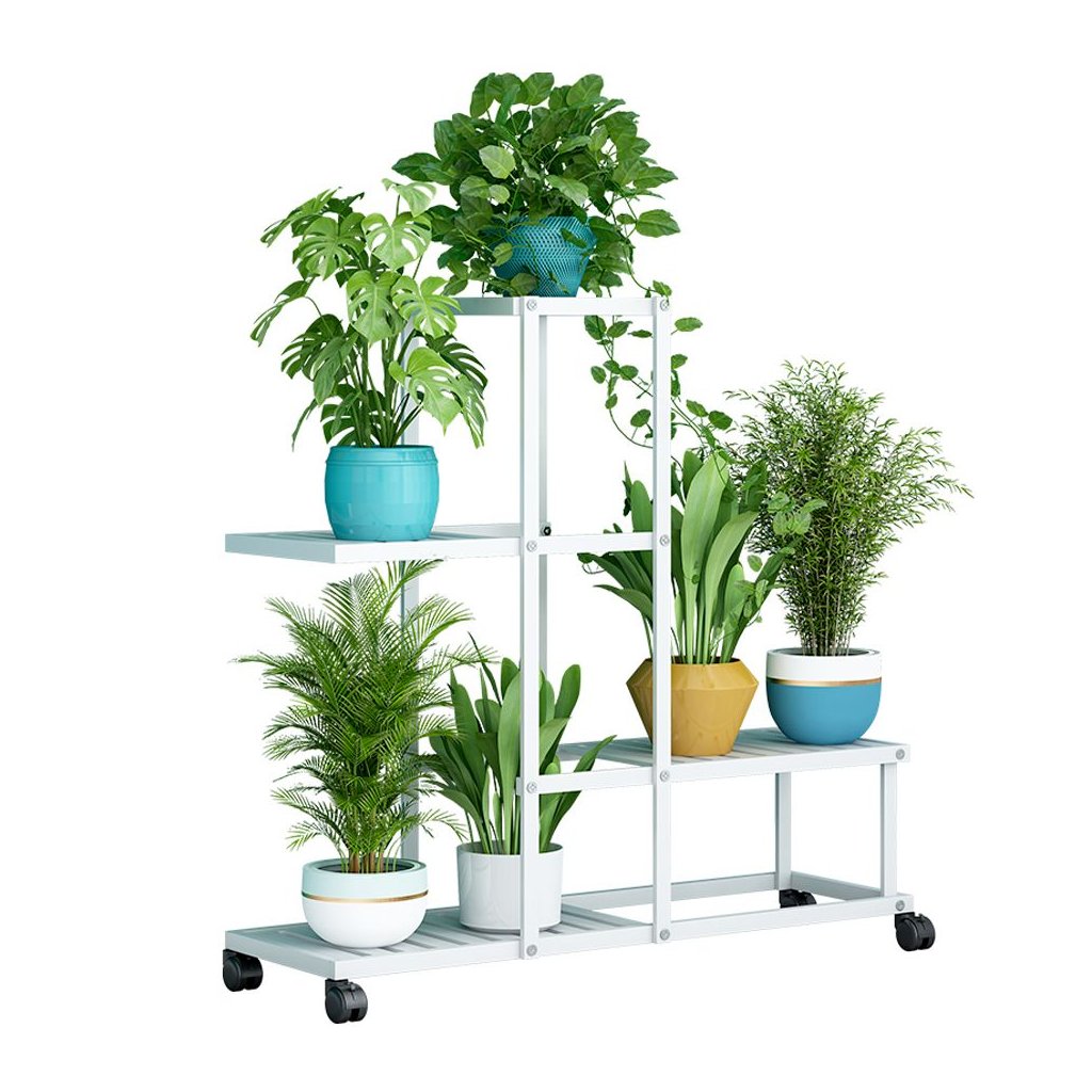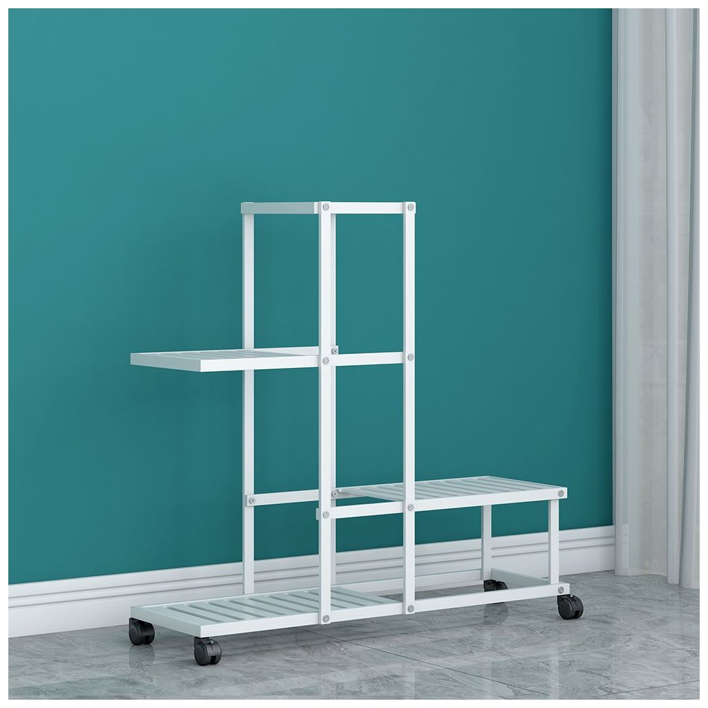 Biely kovový stojan na kvetináče s moderným dizajnom a 4 úrovňami. Rozmery 63x22,5x61,5 cm, plastové kolieska pre jednoduchú manipuláciu. Nosnosť políc 4 kg. Ideálny na dekoráciu interiéru.