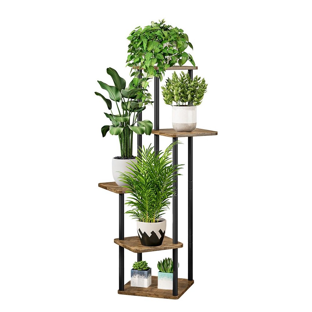 Stojan na kvety s kovovou konštrukciou a rustikálnym drevom. Má 5 políc, nosnosť 3 kg na policu. Moderný dizajn, rozmery 30x30x106,5 cm, dodávaný v demonte. Ideálny na črepníkové rastliny.