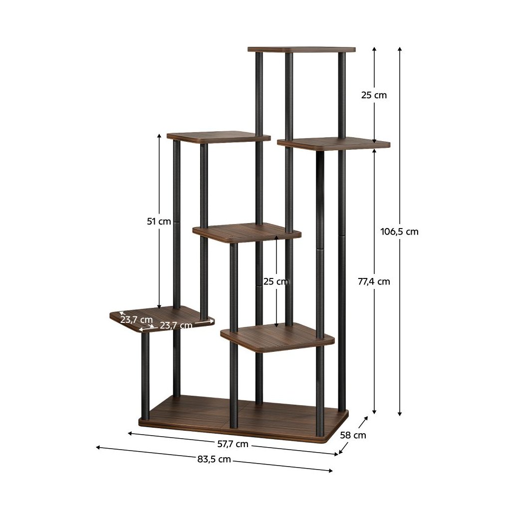 Vyrobený z kombinácie kovu a drevotriesky, ponúka tento stojan nielen estetický zážitok, ale aj praktickosť. S celkom siedmimi policami a dostatočnou nosnosťou je skvelým doplnkom do obývacích izieb, kancelárií alebo zimných záhrad.