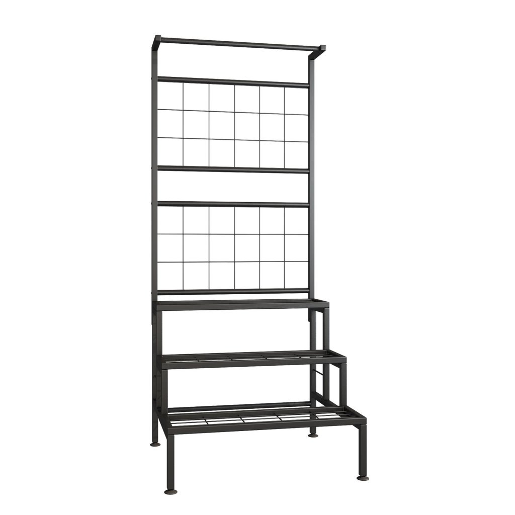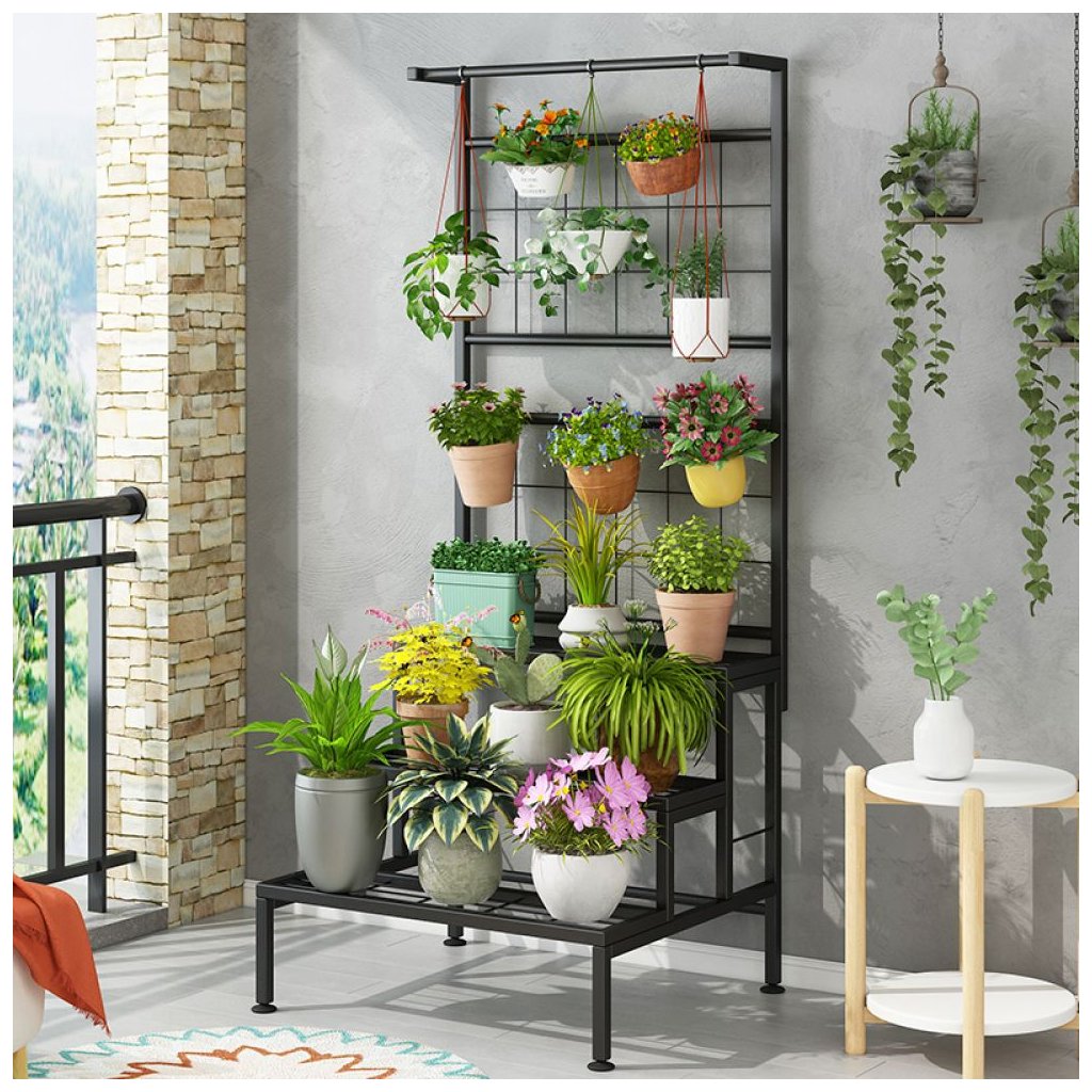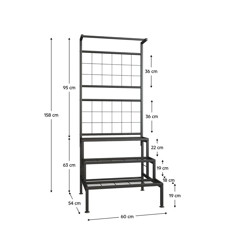 Stojan na kvety BALKO v čiernej farbe je praktický kovový doplnok do vašej záhrady či na balkón. S tromi policami a tyčou na zavesenie ponúka dostatok priestoru pre vaše kvety. Rozmery: 60x54x158 cm.