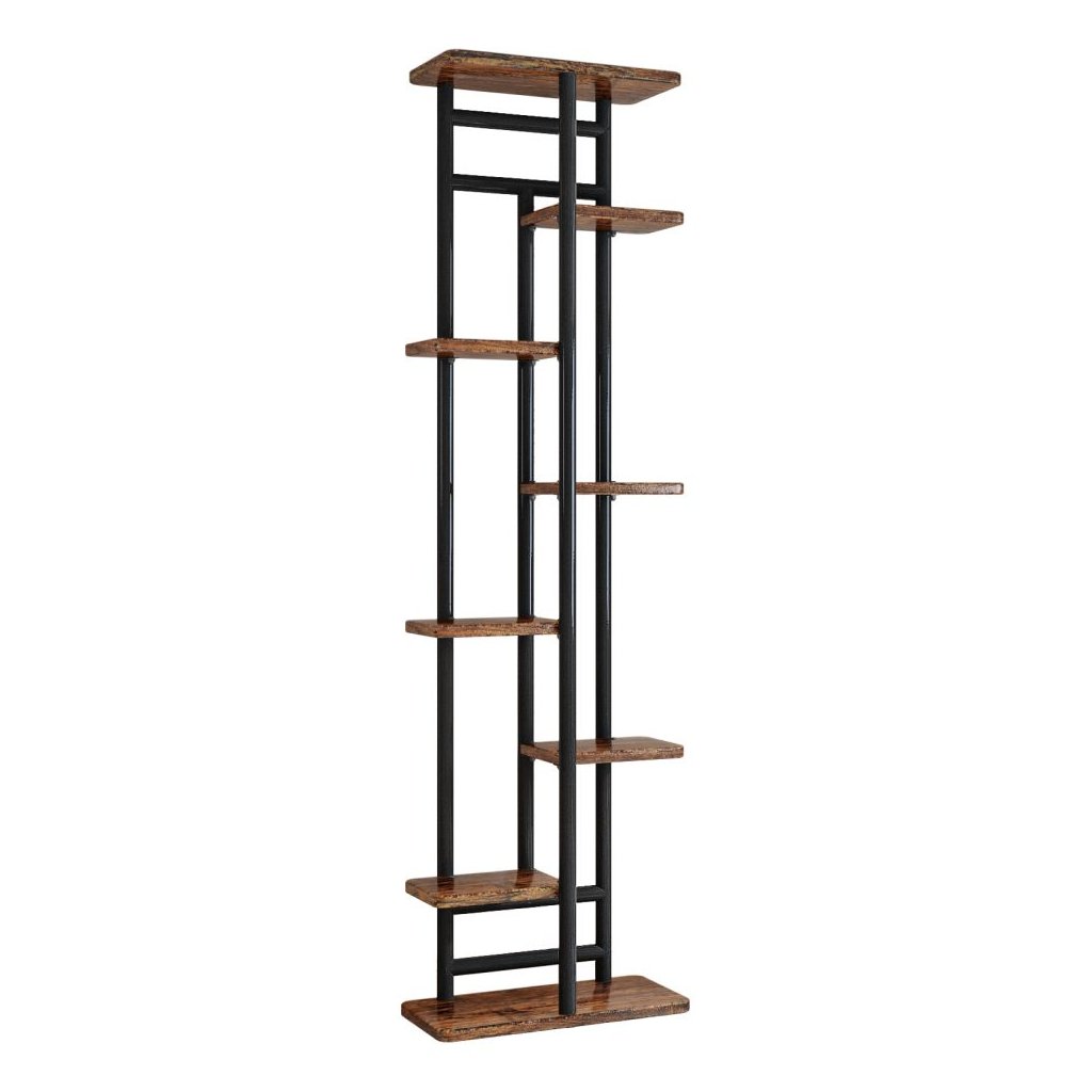 Praktický stojan na kvety s moderným dizajnom, vyrobený z kovu a DTD v čiernej farbe s rustikálnym drevom. Rozmery 36x23x136 cm, nosnosť 2 kg na policu. Ideálny na črepníkové rastliny. Dodávaný v demo