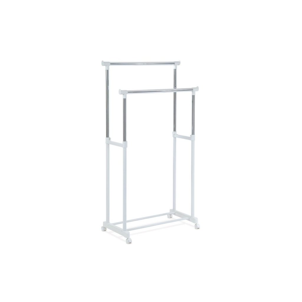 Dvojramenný stojan na šaty v bielej farbe s kovovými tyčami a chrómovanými detailmi. Výškovo nastaviteľný, s odkladacím priestorom a štyrmi kolieskami pre jednoduchú manipuláciu. Ideálny do domácností