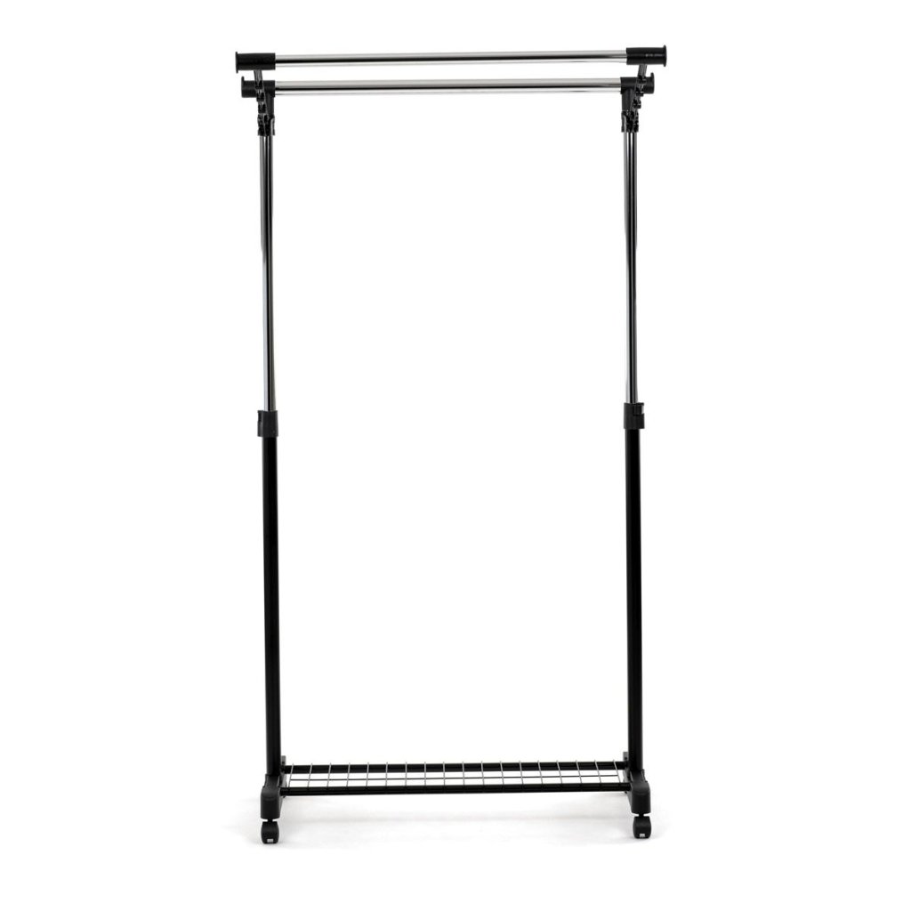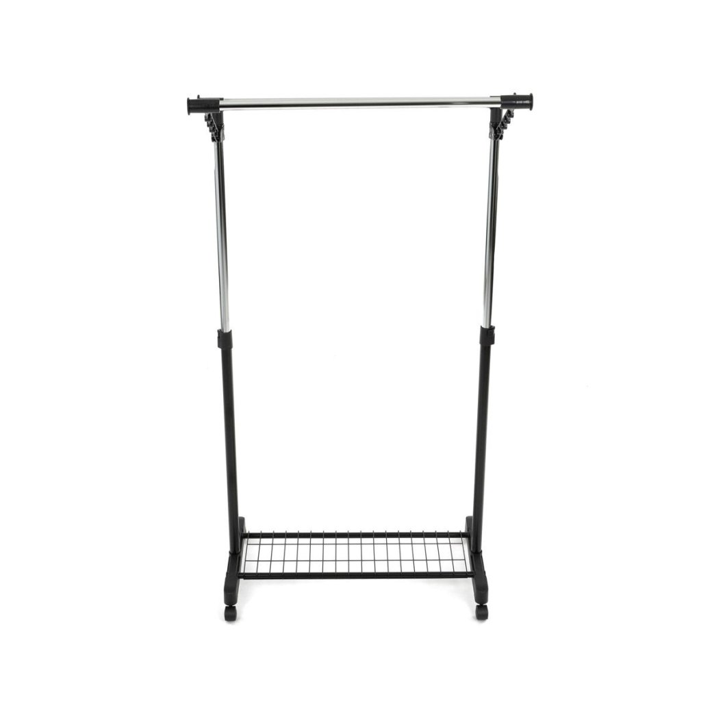 Mobilný stojan na šaty v čiernej farbe s chrómovými detailmi spojuje moderný dizajn a funkčnosť. Nastaviteľná výška a dolná polica poskytujú flexibilitu a extra úložný priestor. Kolieska umožňujú jedn