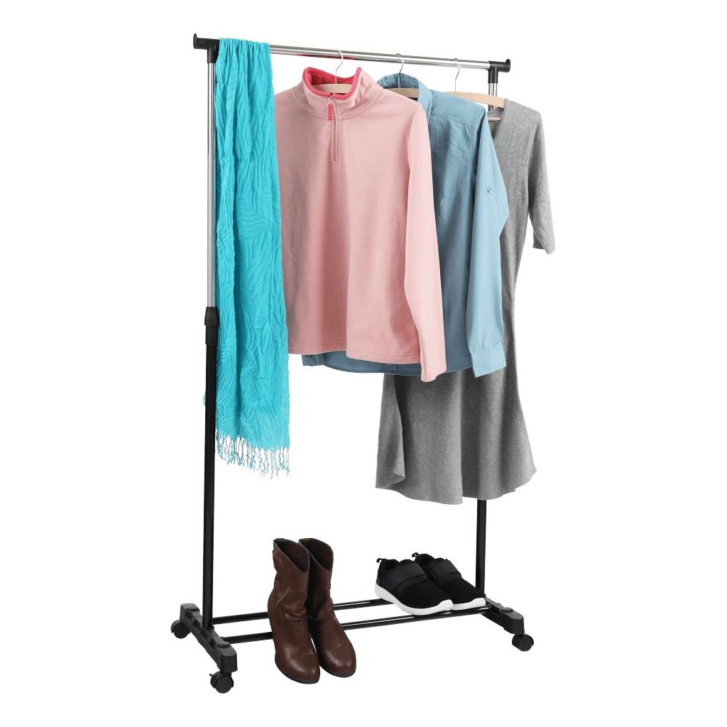 Pojazdný stojan na šaty s jednou výškovo nastaviteľnou tyčou. Vyrobený z kovu a plastu, čiernej farby. Rozmery: 75,5x43x92-159 cm, hmotnosť 1,6 kg. Dodávané v demonte.