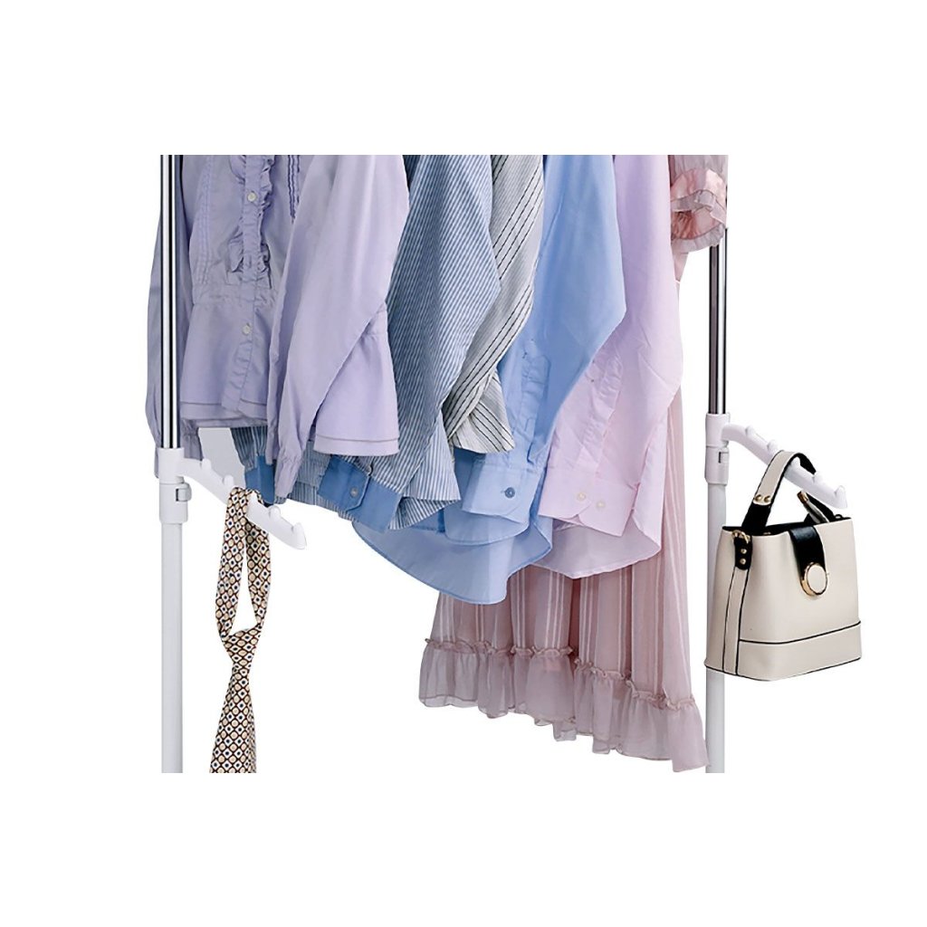 Vďaka výškovo nastaviteľnej tyči si môžete prispôsobiť výšku stojana podľa svojich potrieb. Otočné závesy na bokoch sú praktickým miestom na zavesenie kabeliek, šálov alebo kravát, zatiaľ čo spodný odkladací priestor ponúka možnosť uloženia topánok či krabíc.