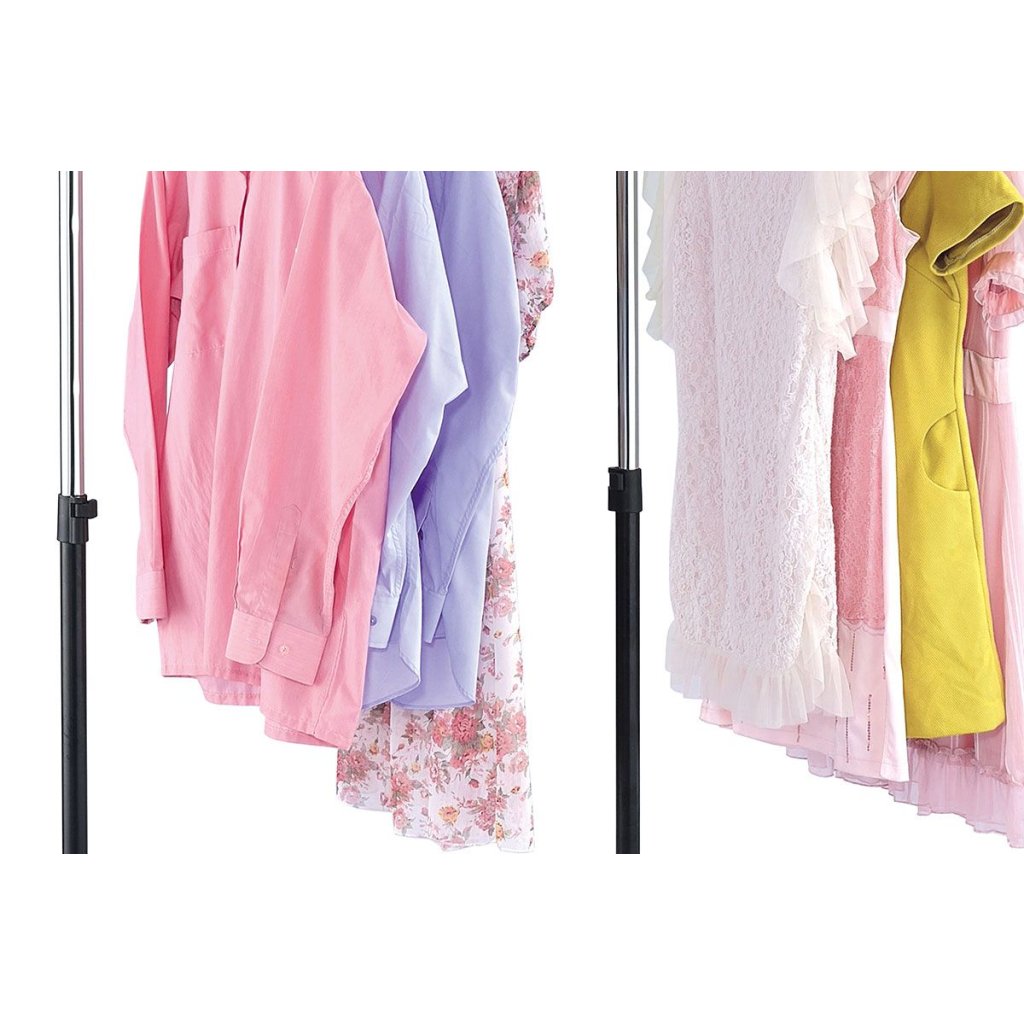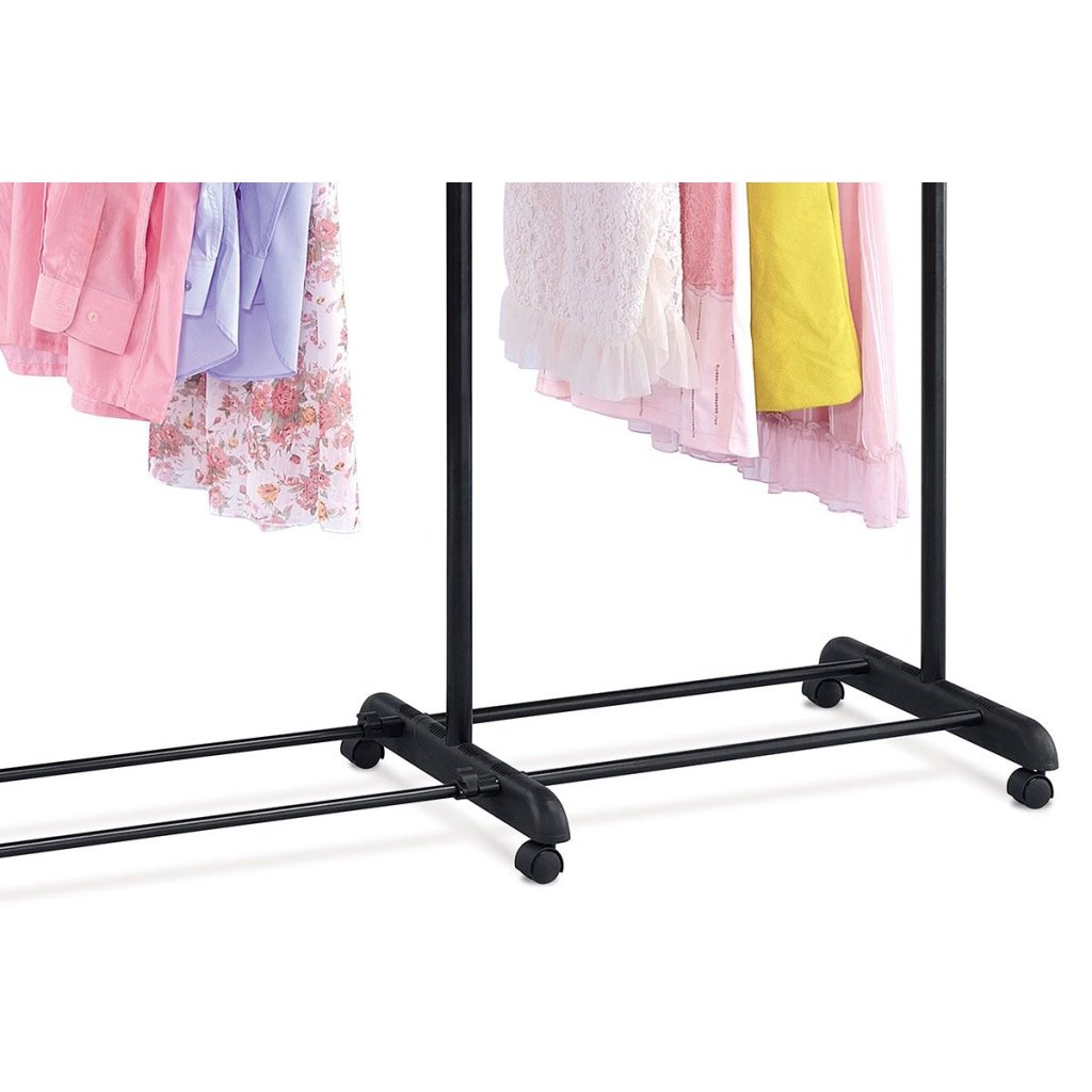 Teleskopický stojan na šaty v čiernej farbe kombinuje kov a plast, ponúka nastaviteľnú výšku a praktický priestor na doplnky. Vybavený kolieskami pre jednoduchú manipuláciu. Ideálny pre domácnosti aj