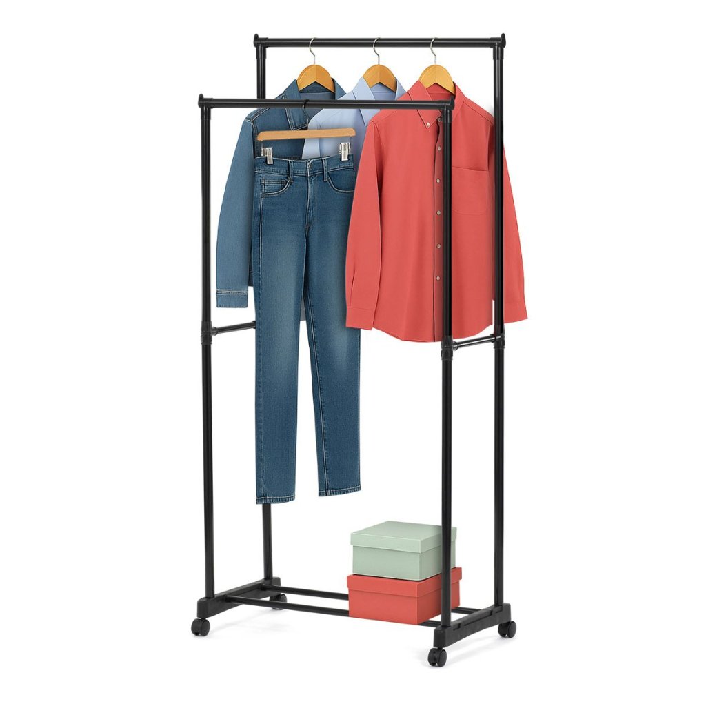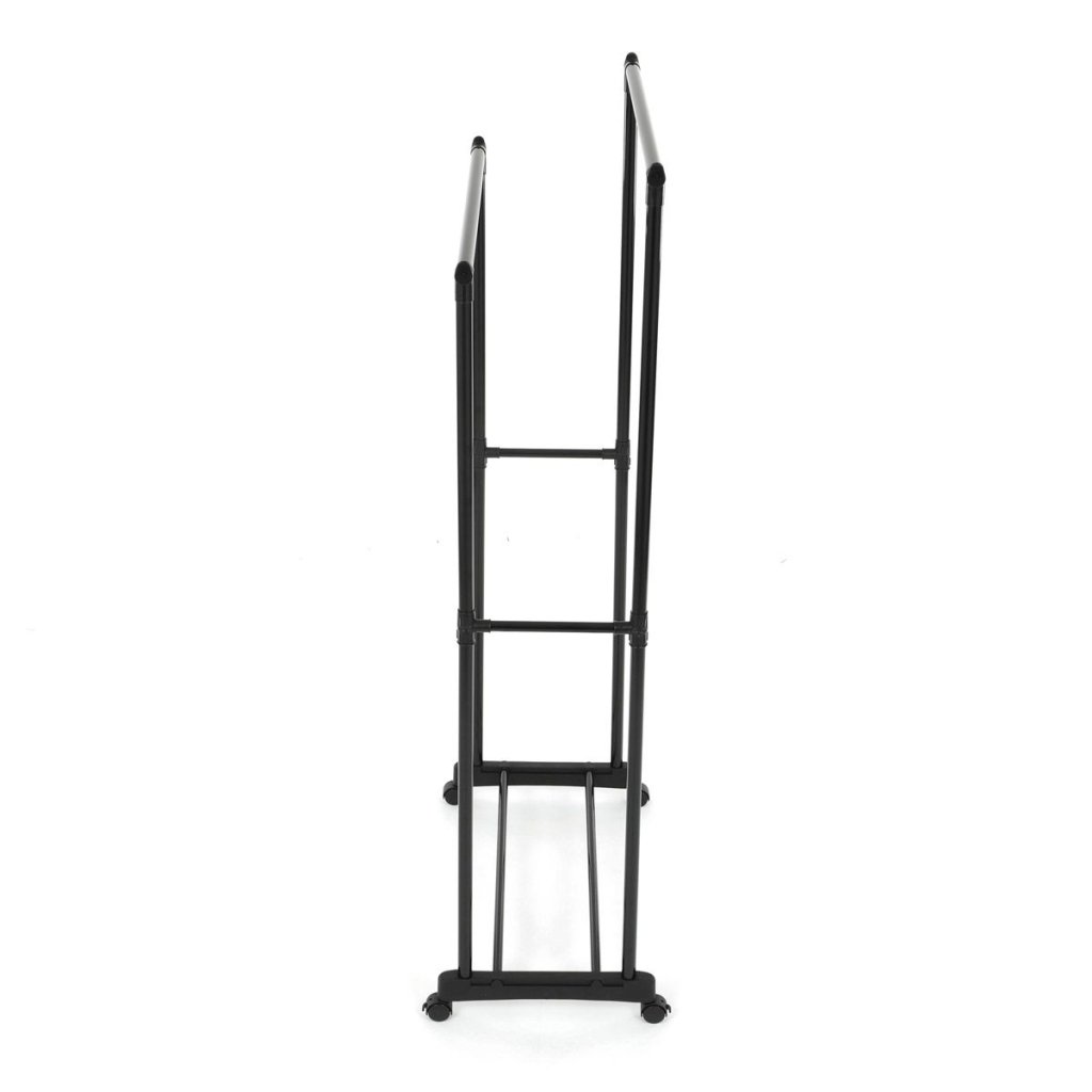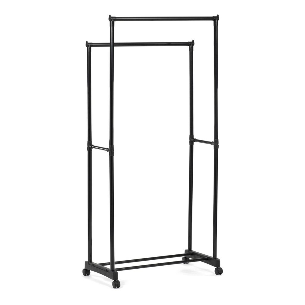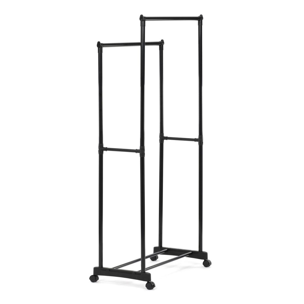 Praktický čierny stojan na šaty ponúka prehľadné usporiadanie oblečenia s dvoma tyčami a dolnou policou. Odolná kovová konštrukcia, nastaviteľná výška a kolieska pre jednoduché premiestnenie.