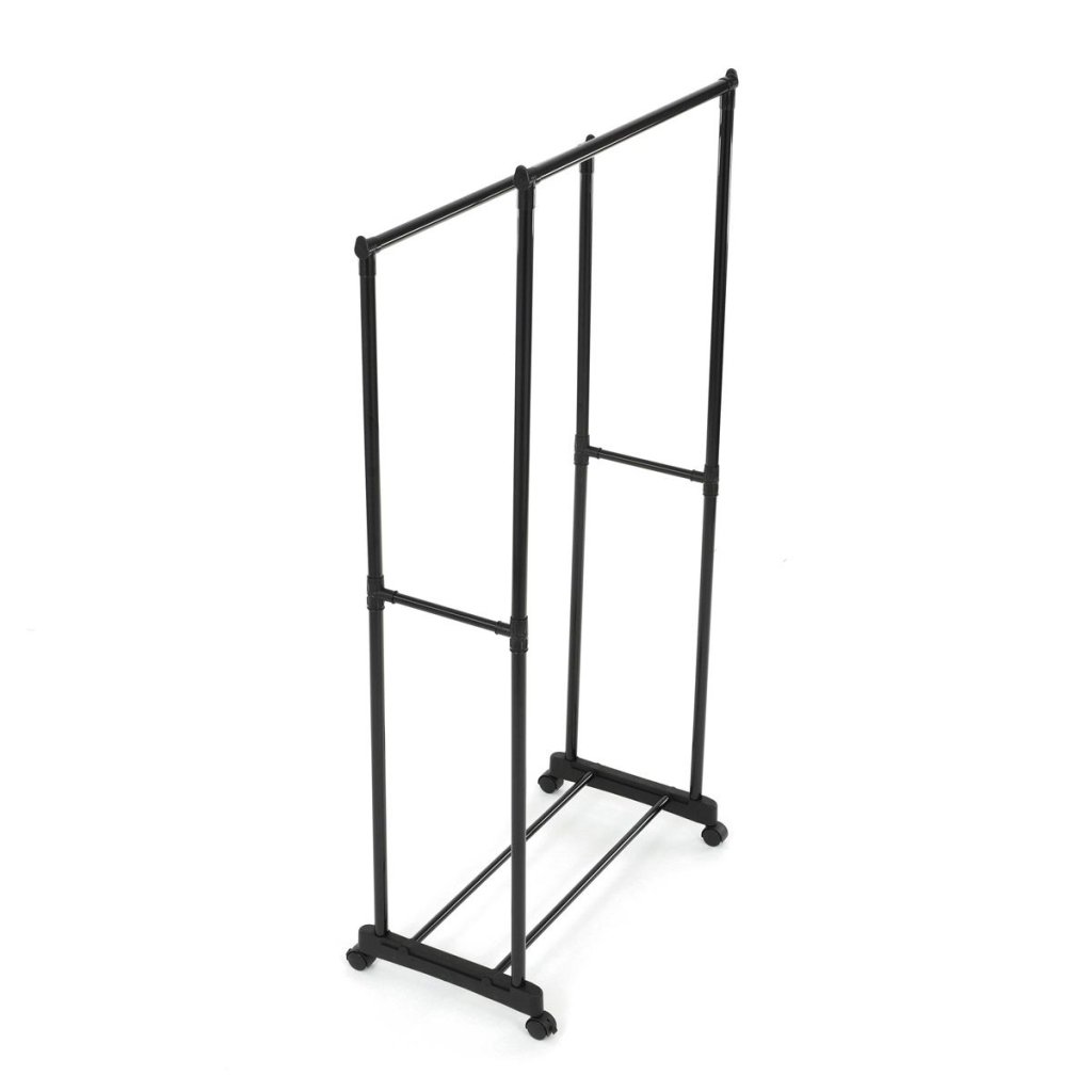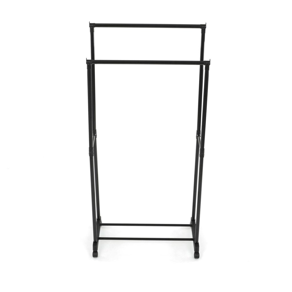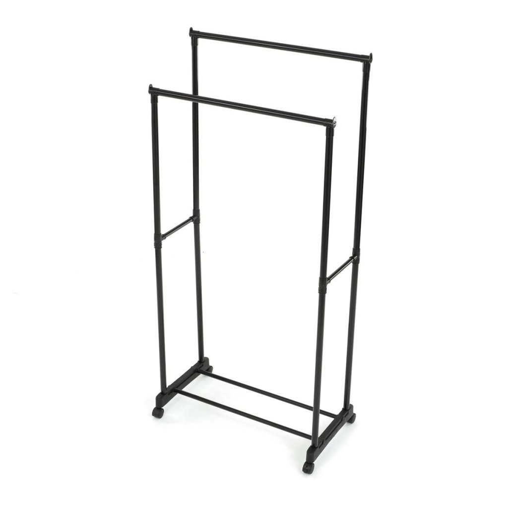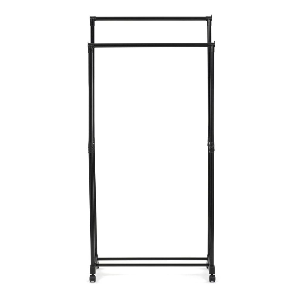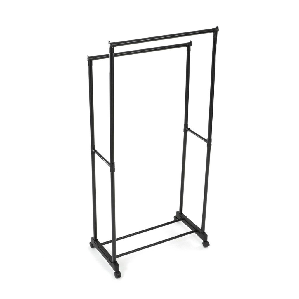 Praktický čierny stojan na šaty ponúka prehľadné usporiadanie oblečenia s dvoma tyčami a dolnou policou. Odolná kovová konštrukcia, nastaviteľná výška a kolieska pre jednoduché premiestnenie.