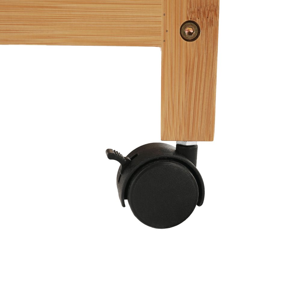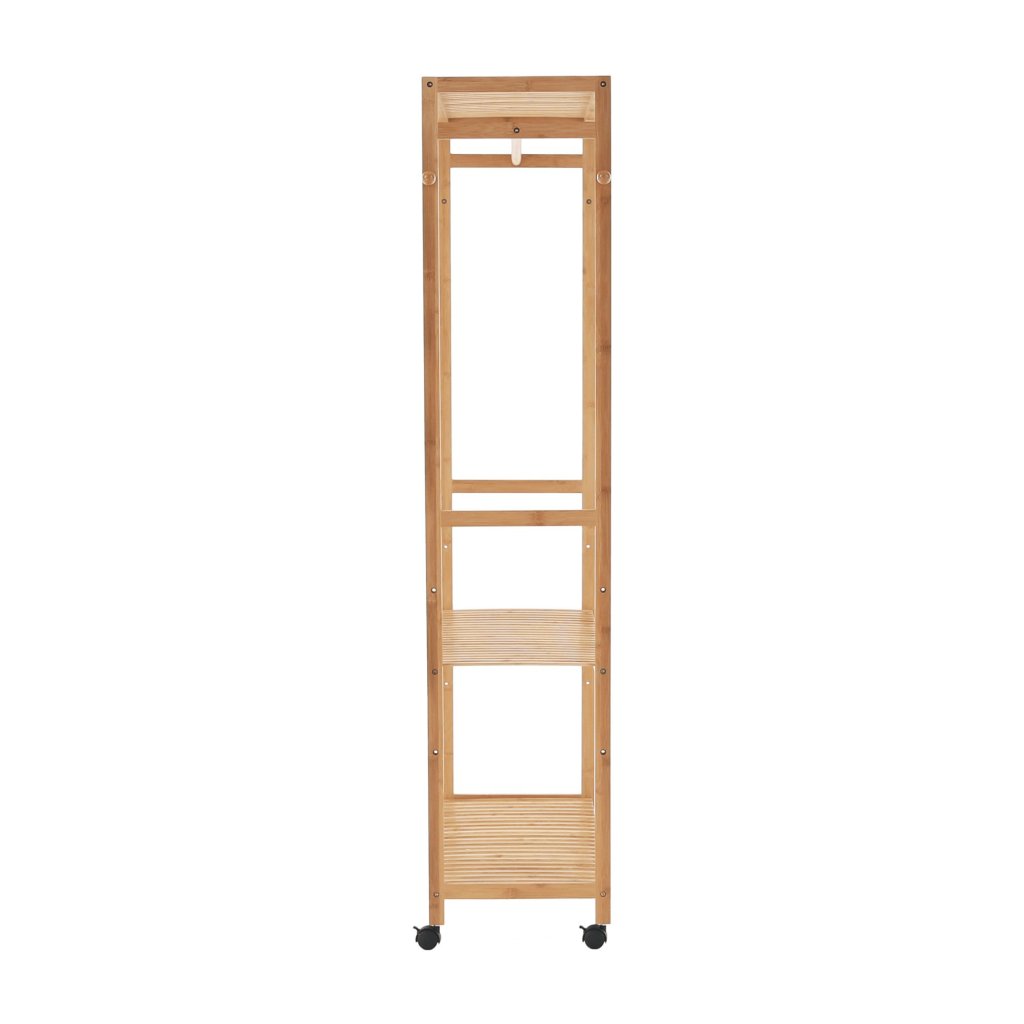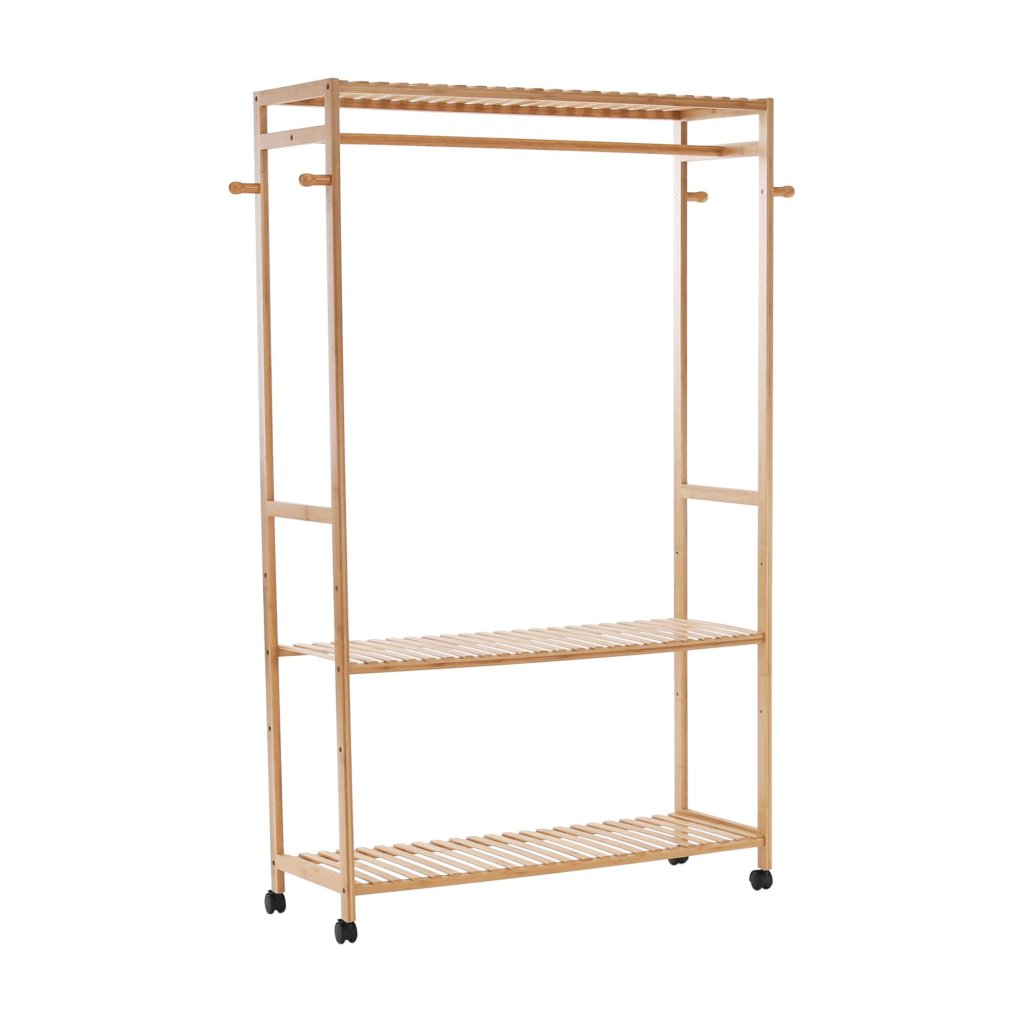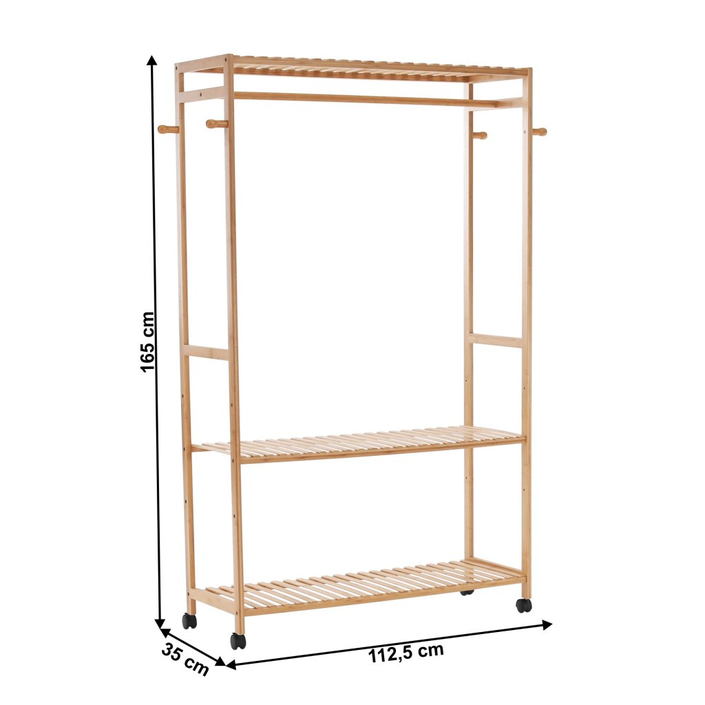 Stojan na šaty MELAR z lakovaného bambusu s prírodným dizajnom. Má 3 police, vešiakovú tyč a 4 háčiky. S kolieskami pre jednoduchú manipuláciu. Nosnosť 10 kg. Dodávaný v demonte.