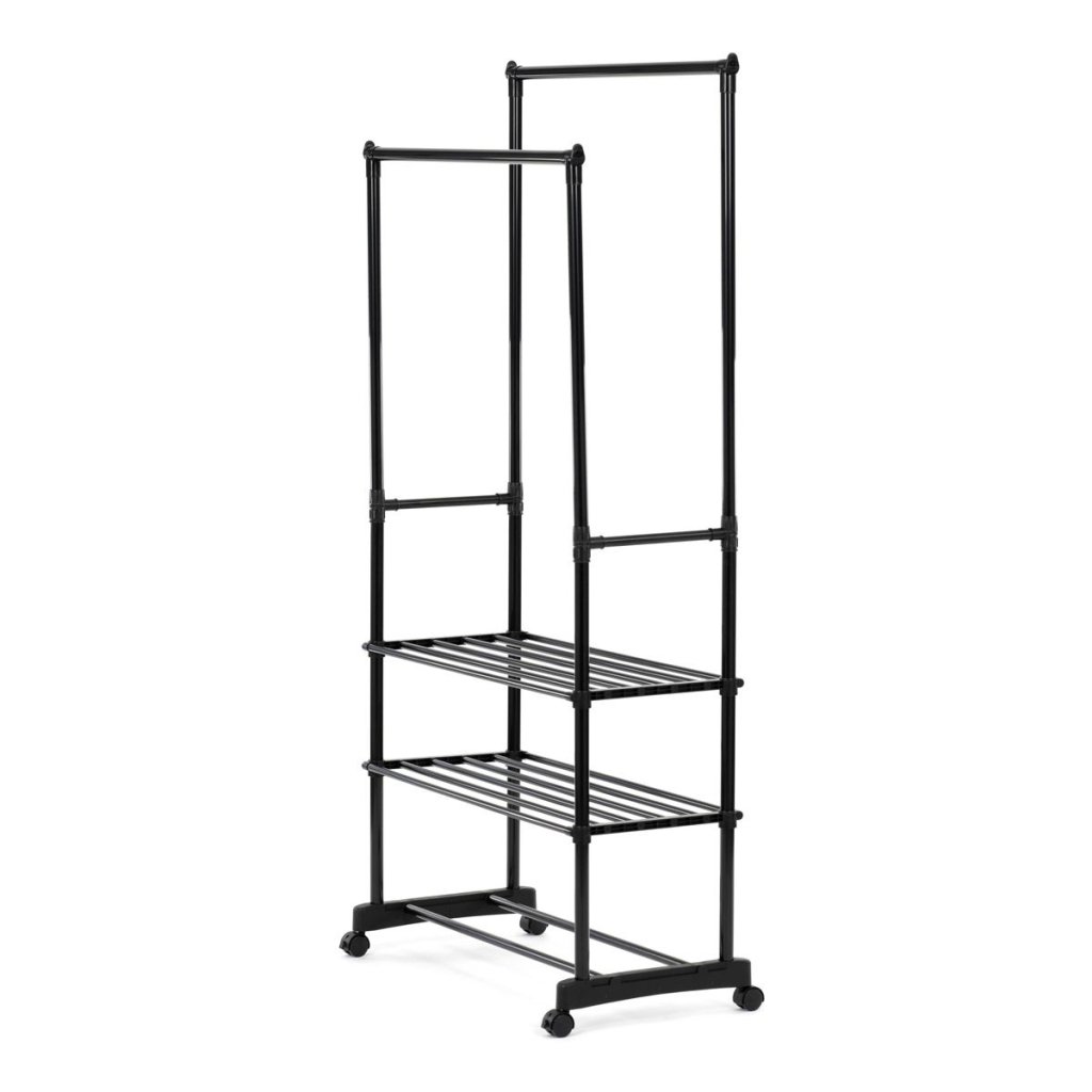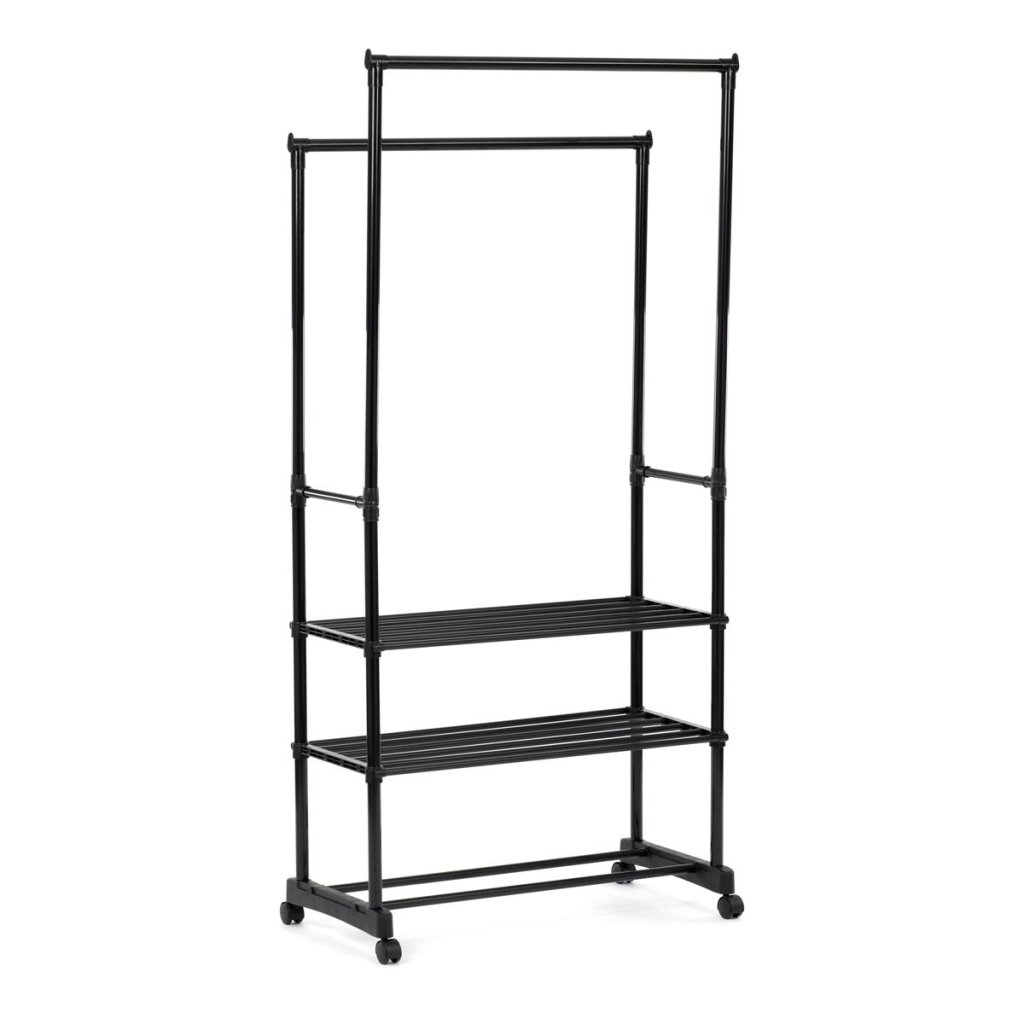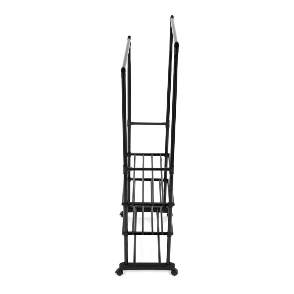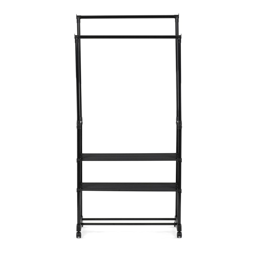 S dvoma tyčami na zavesenie a tromi policami na uloženie topánok alebo doplnkov ponúka dostatok priestoru pre všetky vaše potreby. Pohodlné kolieska umožňujú jednoduchú manipuláciu a prispôsobenie umiestnenia stojana podľa vašich predstáv.