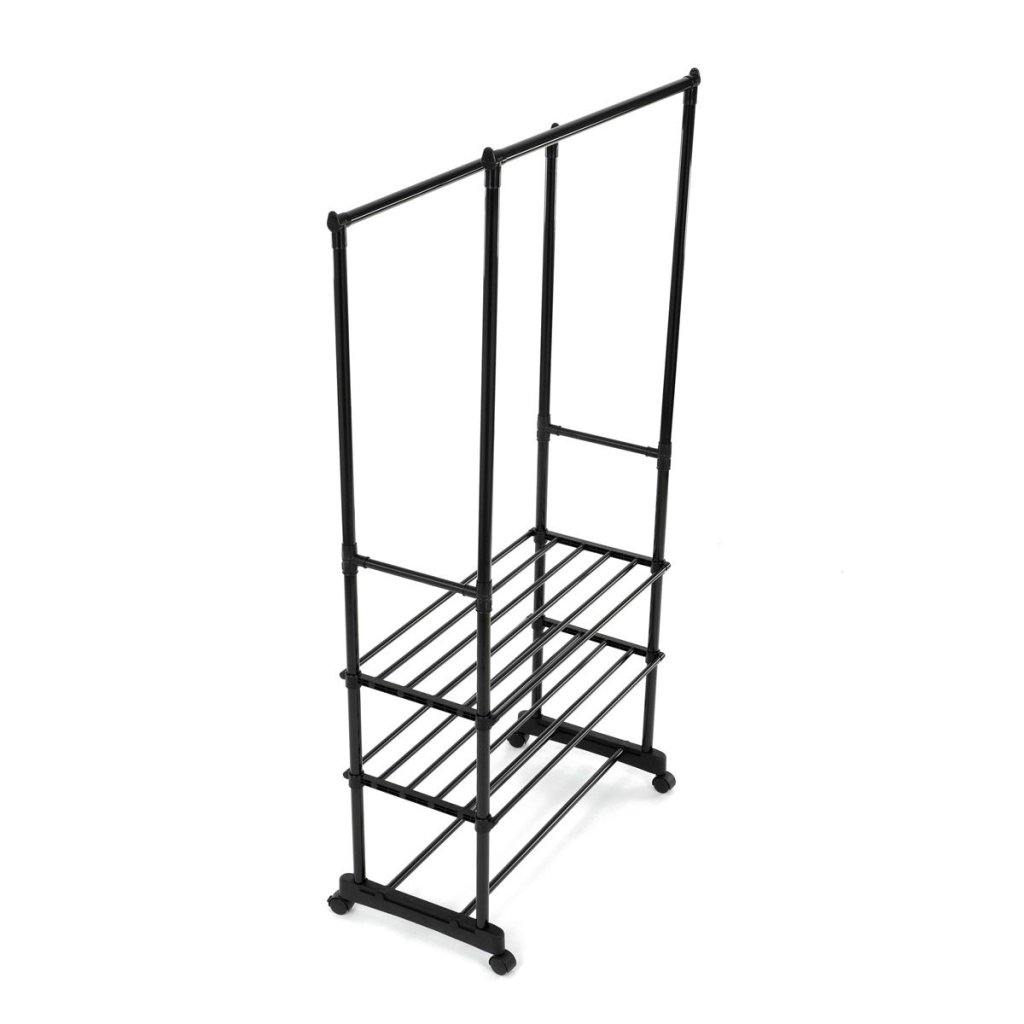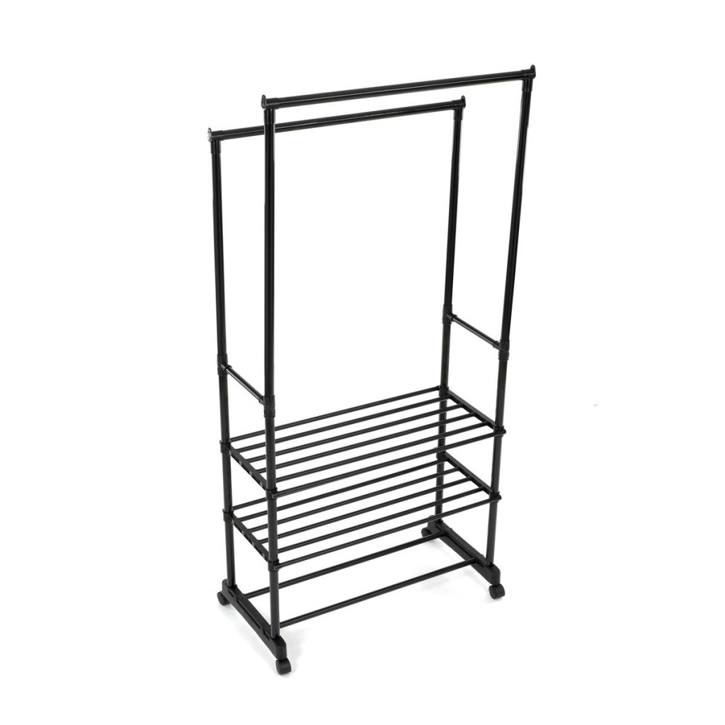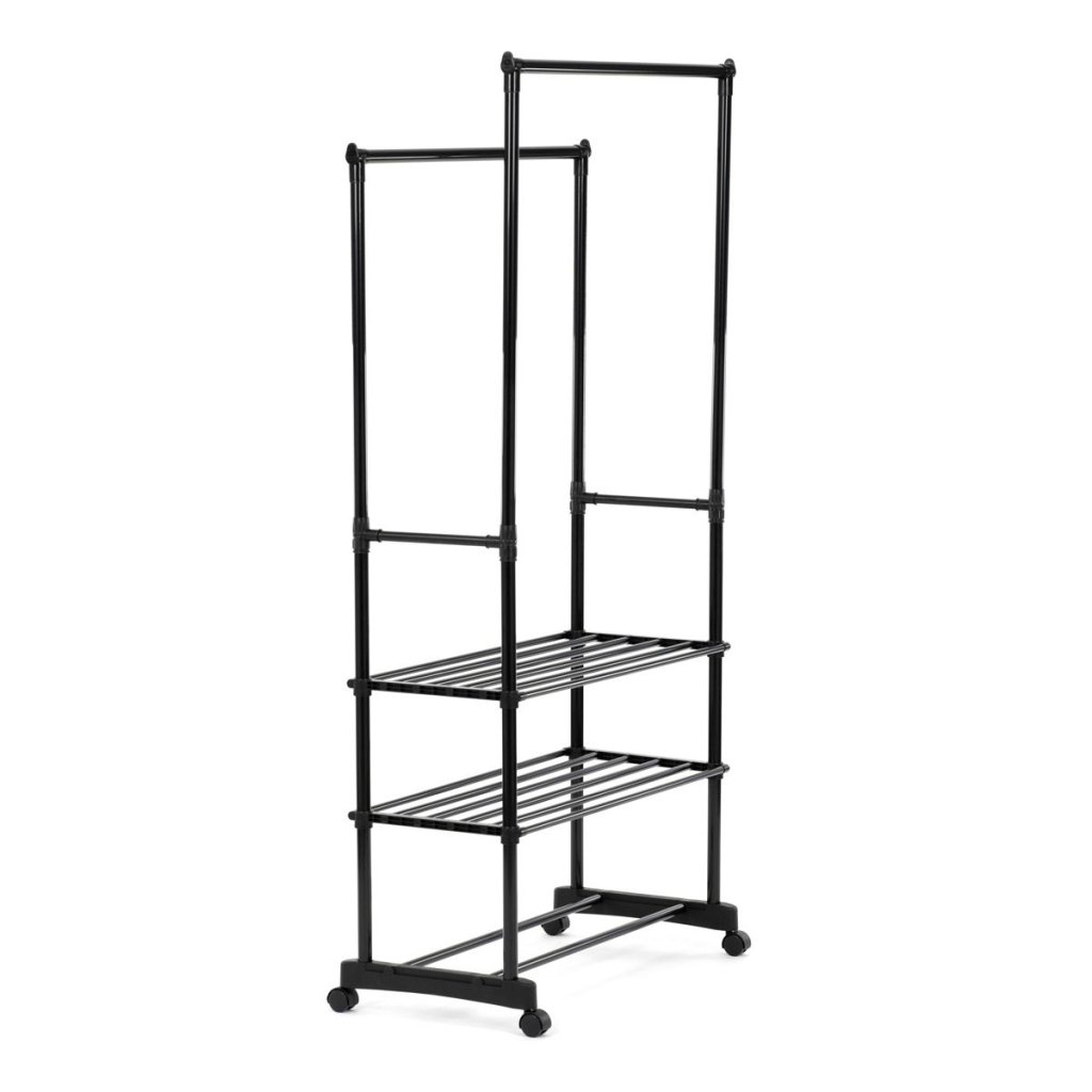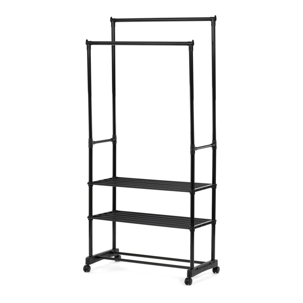 S dvoma tyčami na zavesenie a tromi policami na uloženie topánok alebo doplnkov ponúka dostatok priestoru pre všetky vaše potreby. Pohodlné kolieska umožňujú jednoduchú manipuláciu a prispôsobenie umiestnenia stojana podľa vašich predstáv.