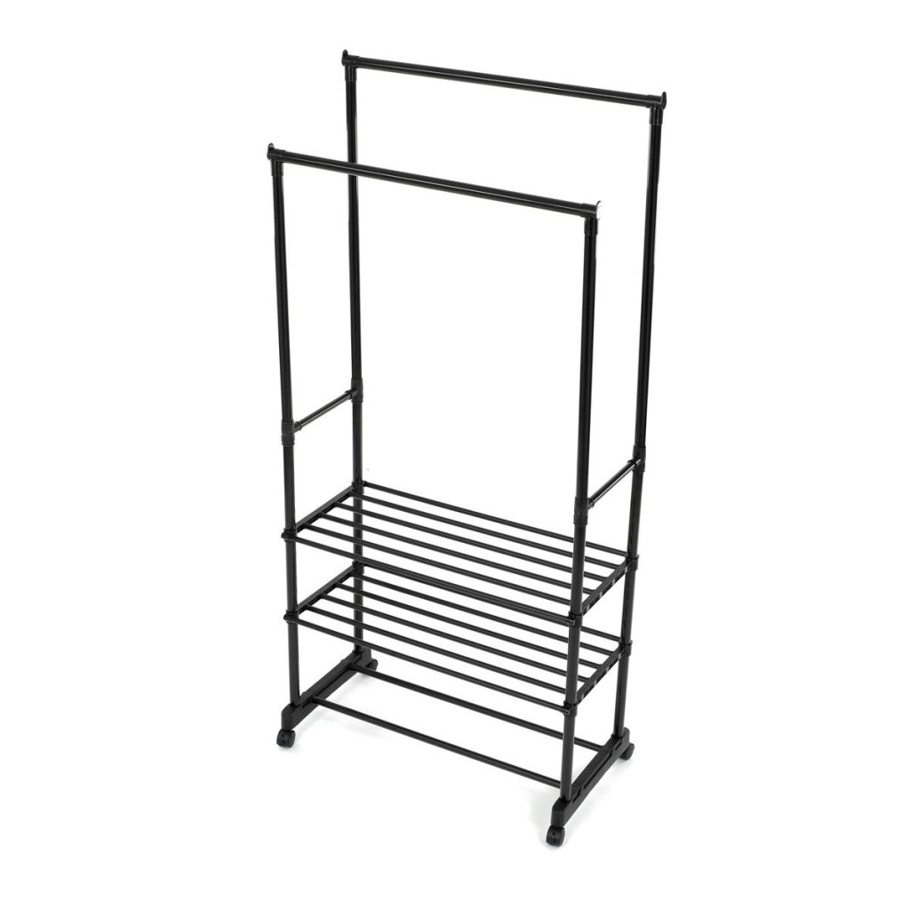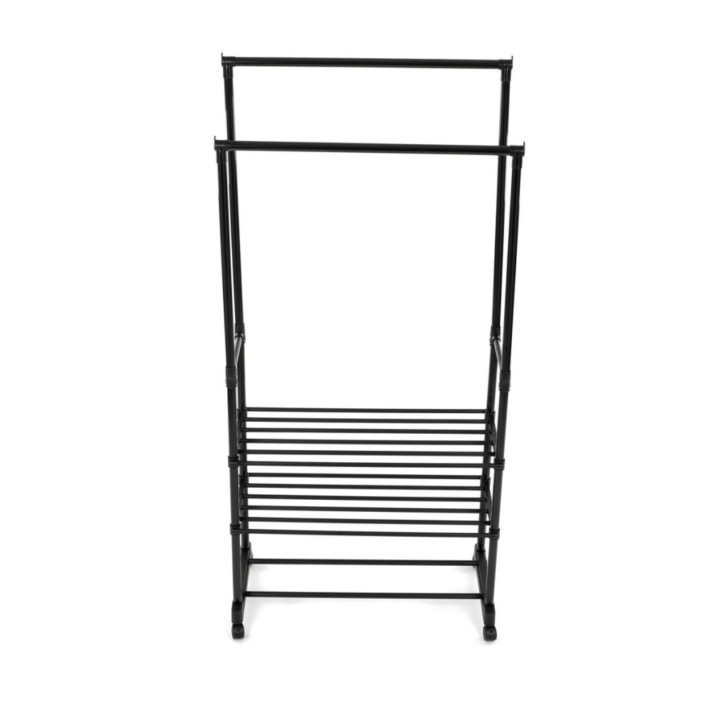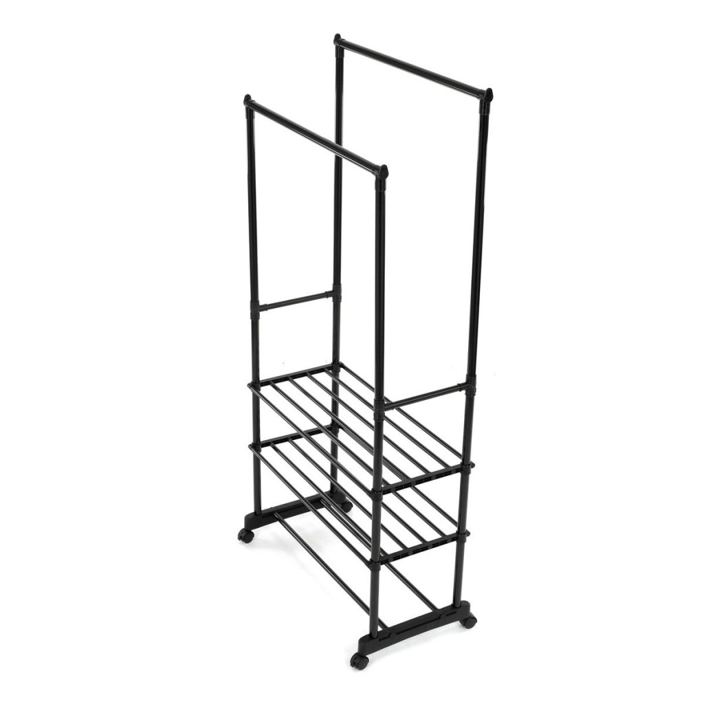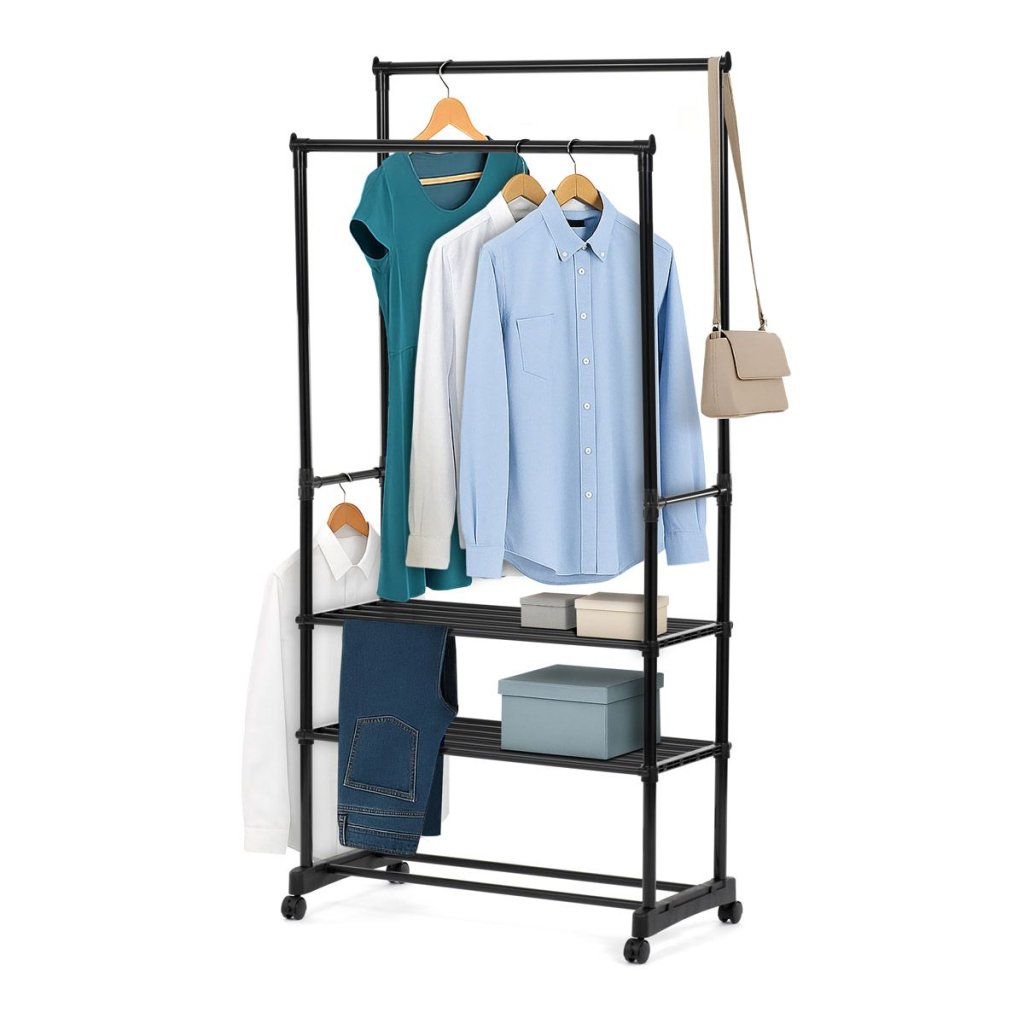 S dvoma tyčami na zavesenie a tromi policami na uloženie topánok alebo doplnkov ponúka dostatok priestoru pre všetky vaše potreby. Pohodlné kolieska umožňujú jednoduchú manipuláciu a prispôsobenie umiestnenia stojana podľa vašich predstáv.