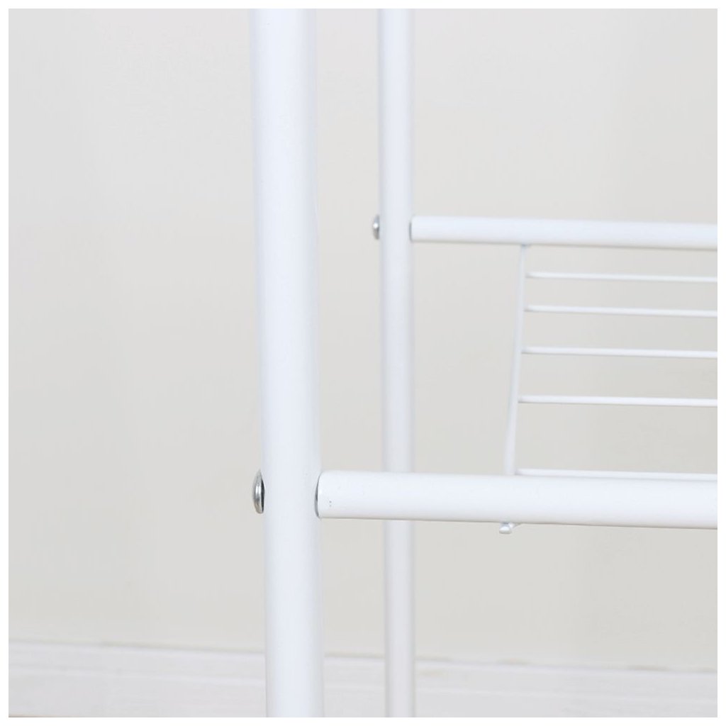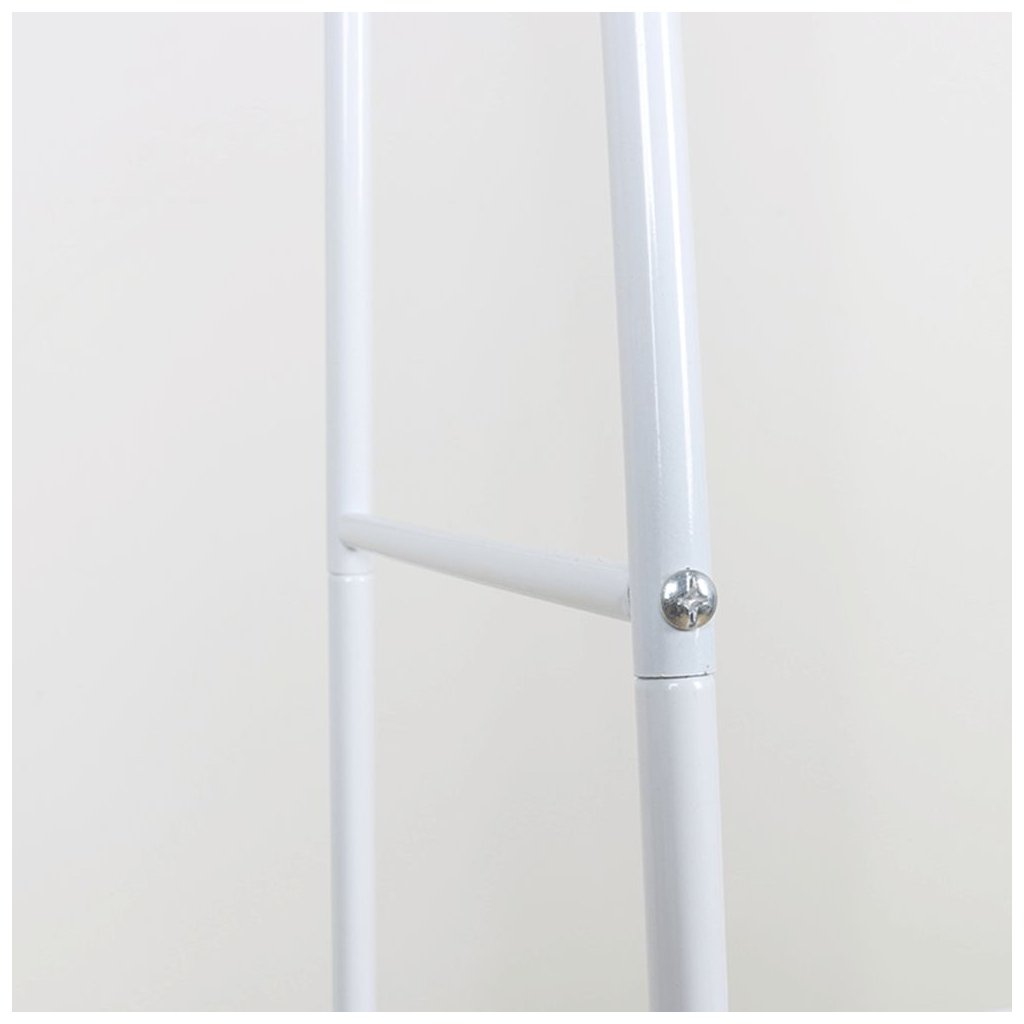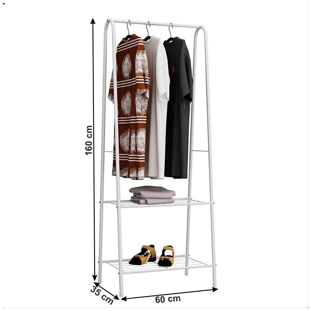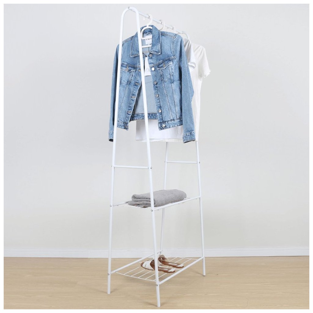 Biely stojan na šaty s pevnou kovovou konštrukciou. Rozmery 60x35x160 cm, vybavený vešiakovou tyčou s nosnosťou 10 kg a dvoma policami. Dodávané v demonte. Ideálny na organizáciu oblečenia.