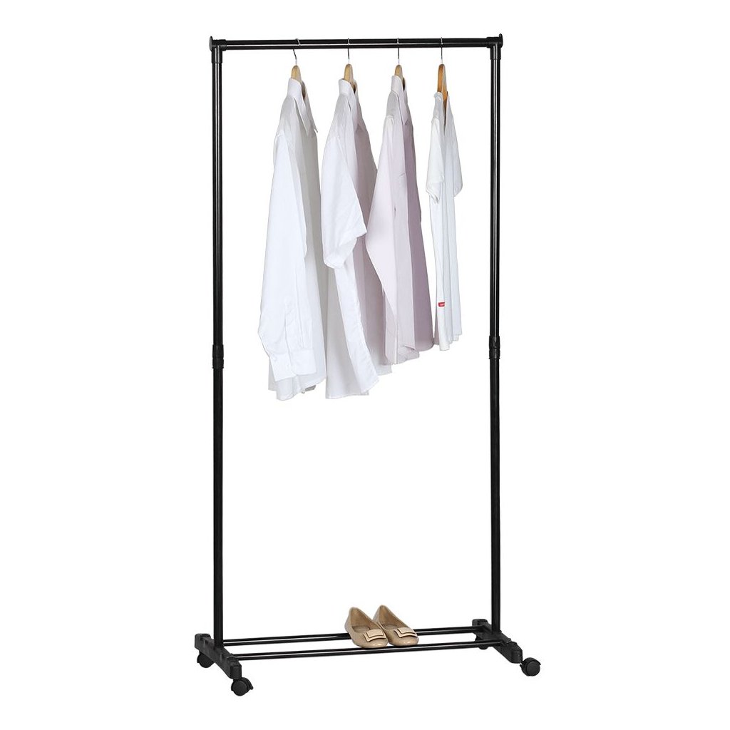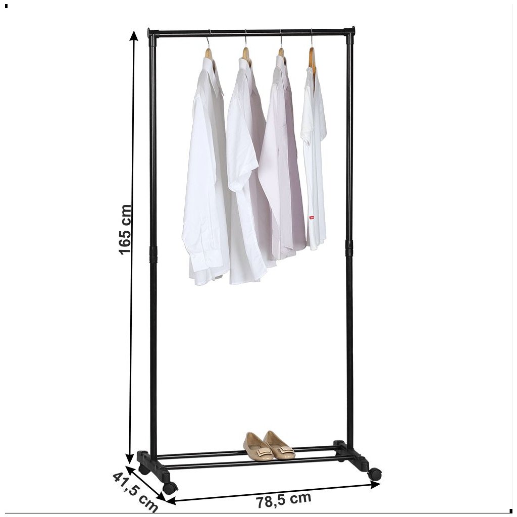 Praktický stojan na šaty v čiernej farbe s rozmermi 78,5x41,5x165 cm. Pojazdný s kolieskami, vrátane dvoch s brzdou a policou z 2 tyčí. Dodávané v demonte.